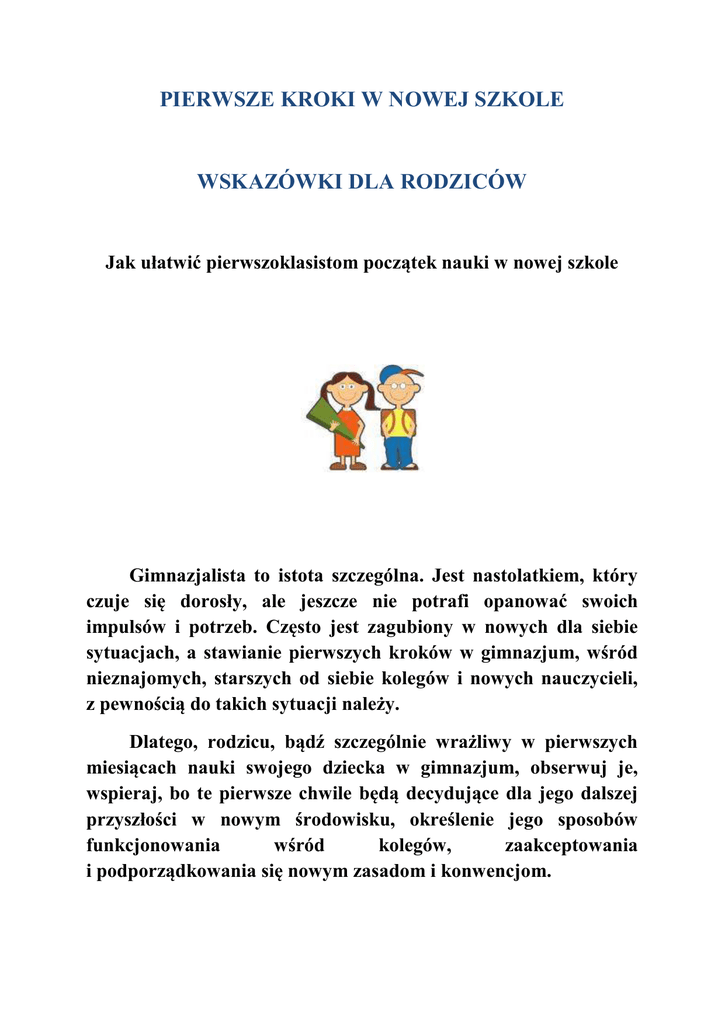 PIERWSZE KROKI W NOWEJ SZKOLE WSKAZÓWKI DLA RODZICÓW Jak ułatwić pierwszoklasistom początek nauki w nowej szkole Gimnazjalista to istota szczególna. Jest nastolatkiem, który czuje się dorosły, ale jeszcze nie potrafi opanować swoich impulsów i potrzeb. Często jest zagubiony w nowych dla siebie sytuacjach, a stawianie pierwszych kroków w gimnazjum, wśród nieznajomych, starszych od siebie kolegów i nowych nauczycieli, z pewnością do takich sytuacji należy. Dlatego, rodzicu, bądź szczególnie wrażliwy w pierwszych miesiącach nauki swojego dziecka w gimnazjum, obserwuj je, wspieraj, bo te pierwsze chwile będą decydujące dla jego dalszej przyszłości w nowym środowisku, określenie jego sposobów funkcjonowania wśród kolegów, zaakceptowania i podporządkowania się nowym zasadom i konwencjom. Rodzicu, pamiętaj: Twoje nastoletnie dziecko ma silną potrzebę niezależności, samostanowienia, choć nie zawsze jeszcze jest w stanie podejmować odpowiedzialne decyzje Nastolatek pragnie nawiązywać nowe znajomości, przyjaźnie, ważne jest dla niego, aby być znaczącym członkiem grupy rówieśniczej. Pragnie także imponować innym, często dostosowuje się do oczekiwań grupy. Zdarza się, że młody człowiek nie umie wykorzystywać swoich umiejętności oraz potencjału w sytuacjach szkolnych i pokrywa braki poprzez nieakceptowane zachowania – podważanie autorytetów, błaznowanie, negowanie opinii dorosłych Za wszelką cenę chce osiągać sukcesy, porównuje się z innymi, dlatego, jeśli nie zaspokoi potrzeby osiągnięć, może poszukiwać jej spełnienia w nieaprobowanych społecznie zachowaniach, grupach odniesienia, sytuacjach Jest bardzo emocjonalny, nie zawsze potrafi opanować emocje, co sprawia, że reaguje nadmiernie, impulsywnie Młody człowiek nie zawsze potrafi sprostać oczekiwaniom nowych nauczycieli, szybko dostosować się do wymagań nowej szkoły, znaleźć przyjaciół, także z przyczyn obiektywnych, od niego niezależnych Dlatego tak ważne jest udzielenie dziecku wsparcia w tej nowej dla niego sytuacji Jak to zrobić? Warto pamiętać, że dziecko, które świetnie radziło sobie w szkole podstawowej, było dobrym uczniem, nie musi automatycznie tak samo świetnie poradzić sobie w gimnazjum. W nowej szkole wzrastają oczekiwania, panuje inny styl nauczania, pojawiają się nowe przedmioty, jest więcej zajęć. Spokojne rozmowy o tym, co jest dla dziecka nowe, trudne, a także otwarte, życzliwe podejście do tego, co przeżywa w nowej dla siebie sytuacji, z pewnością będzie potrzebne. Wyrażanie wiary jego możliwości i wspieranie w tych przejściowych kłopotach wzmocnią jego poczucie własnej wartości, samoocenę i dodadzą sił do zmagania się z ewentualnymi trudnościami. Warto rozpoznać przyczyny i tło ewentualnych trudności szkolnych dziecka, tak, aby skutecznie im przeciwdziałać. W gimnazjum dostępne są różne formy stymulowania potencjału dziecka, wspierania jego rozwoju, pomocy w lekcjach i inne. Rodzicu, rozmawiaj ze swoim dzieckiem, pomóż mu obiektywnie oceniać zaistniałe sytuacje, stanowczo wyrażaj swoje obawy co do zachowań ryzykownych, mów „nie” w sytuacjach zagrażających jego bezpieczeństwu. Wspieraj jego samodzielność, pomagaj podejmować odpowiedzialne decyzje, subtelnie nad nim czuwając. Pamiętaj, że wszystkie sytuacje niepokojące możesz skonfrontować z pracownikami szkoły – dyrektorem, wychowawcą, psychologiem szkolnym, członkami Zespołu Wychowawczego. I najważniejsze – Twoje dziecko przechodzi kolosalną metamorfozę, ale w dalszym ciągu potrzebuje przytulenia, ciepła, bliskości. Dlatego na każdym kroku daj mu odczuć, że jest dla Ciebie najważniejsze, że jest kochane i zawsze może na Ciebie liczyć. I wtedy wszystko stanie się prostsze. Lubimy swoją szkołę! Z życzeniami dobrego, spokojnego początku nowego roku szkolnego – Małgorzata Szandar, psycholog szkolny Gimnazjum nr 27 w Gdańsku.