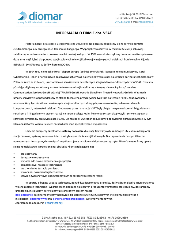 systemy TV SAT teletechnika telekomunikacja ul. Na Skraju 34, 02-197 Warszawa tel.: 22 846-04-88, fax: 22 868-64-83 www.diomar.pl, e-mail: [email protected] INFORMACJA O FIRMIE dot. VSAT Historia naszej działalności usługowej sięga 1982 roku. Na początku skupiliśmy się na serwisie sprzętu elektronicznego, a w szczególności telekomunikacyjnego. Wyspecjalizowaliśmy się w technice telewizji kablowej i satelitarnej w zastosowaniach powszechnych i profesjonalnych. W 1992 roku dostarczyliśmy i zamontowaliśmy pierwsze duże anteny (Ø 4,9m) dla potrzeb stacji czołowych telewizji kablowej w największych obiektach hotelowych w Kijowie: INTURIST i DNIEPR oraz w Sofii w hotelu RODINA. W 1994 roku niemiecka firma Teleport Europe (później amerykaoski koncern telekomunikacyjny Loral CyberStar Inc., jeden z największych dostawców usług VSAT na świecie) wybrała nas na swojego partnera technicznego w Polsce w zakresie instalacji, uruchomienia i serwisowania satelitarnych stacji nadawczo-odbiorczych typu VSAT. Dwa lata później podjęliśmy współpracę w zakresie telekomunikacji satelitarnej z kolejną niemiecką firmą Spaceline Communication Services GmbH (później TRIATON GmbH, obecnie Signalhorn Trusted Networks GmbH). W ramach umowy serwisowej odpowiadaliśmy za stronę techniczną przedsięwzięd tych firm na terenie Polski. Zbudowaliśmy i uruchomiliśmy łącznie kilkaset naziemnych stacji satelitarnych służących przekazowi radia, video oraz danych komputerowych, Internetu i telefonii. Zbudowane przez nas stacje VSAT były objęte naszym nadzorem i 24 godzinnym serwisem z 4 i 8 godzinnym czasem reakcji na terenie całego kraju. Tego typu system diagnostyki i serwisu zapewnia sprawnośd systemów przewyższającą 99,7%. Dla realizacji ww zadao zakupiliśmy odpowiednie oprzyrządowanie, w tym kilka analizatorów widma Hewlett-Packard oraz inne specjalistyczne wyposażenie. Obecnie budujemy satelitarne systemy nadawcze dla stacji telewizyjnych, radiowych i telekomunikacji oraz stacje czołowe, systemy antenowe i sieci dystrybucyjne dla telewizji kablowych. Dla zapewnienia naszym Klientom nowoczesnych i elastycznych rozwiązao współpracujemy z czołowymi dostawcami sprzętu. Filozofia naszej firmy opiera się na kompleksowej i profesjonalnej obsłudze Klienta polegającej na: projektowaniu doradztwie technicznym wyborze i dostawie odpowiedniego sprzętu kompleksowej realizacji technicznej uruchomianiu, testach, pomiarach wykonaniu dokumentacji technicznej serwisie gwarancyjnym i pogwarancyjnym ze skróconym czasem reakcji W oparciu o bogatą wiedzę techniczną, ponad dwudziestoletnią praktykę, doświadczoną kadrę inżynierską oraz własne zaplecze techniczne i wparcie technologiczne najlepszych producentów urządzeo projektujemy, dostarczamy urządzenia, instalujemy, serwisujemy ze skróconym czasem reakcji pola antenowe, satelitarne systemy nadawcze dla stacji telewizyjnych, radiowych i telekomunikacji wraz z instalacjami odgromowymi oraz ochroną przed przepięciami systemów antenowych. Zapraszam do obejrzenia Fotoreferencji DIOMAR spółka z o. o. NIP: 522-26-65-659, REGON: 015295452, nr KRS 0000129869 Sąd Rejonowy dla m. st. Warszawy w Warszawie, XIII Wydział Gospodarczy KRS, kapitał zakładowy: 60 000 zł (opłacony w całośc i) Bank prowadzący rachunek firmowy: BNP Paribas Bank Polska S.A. Nr rachunku bankowego w PLN: 79 1600 1286 0003 0035 3101 8001 Nr rachunku bankowego w EUR: 94 1600 1286 0003 0035 3101 8022 systemy TV SAT teletechnika telekomunikacja ul. Na Skraju 34, 02-197 Warszawa tel.: 22 846-04-88, fax: 22 868-64-83 www.diomar.pl, e-mail: [email protected] Przedstawiamy listę wybranych stacji satelitarnych zbudowanych przez DIOMAR: Cyfrowy Polsat – budowa pola antenowego w nowej siedzibie Cyfrowego Polsatu przy ul. Łubinowej 4: Vertex 6.4m; ANDREW 5.6m; Vertex 4.8m; RFS 3.7m; ANDREW 3.6m; 2,4m; 1,8m, oraz rezerwowej stacji nadawczej 3 x 3,7m CANAL+ Cyfrowy – budowa pola antenowego w nowej siedzibie C+ na ul. Gen. Sikorskiego wraz z przemontowaniem anten z ul. Kawalerii: łącznie kilkadziesiąt anten Rx, Tx, od 6,3m – 1,8m Telewizja Polsat – dostawa i instalacja anteny satelitarnej ANDREW 4,5m; 3.7m; 2,4m; 1,8m. Telewizja Polska – naprawa i konserwacja satelitarnych anten nadawczych i odbiorczych: 9,0m; 8,1m; 7,6m; 4,5m; 3,7m; 3,5m; 3,0m; 1,8m przy ul. J. P. Woronicza 17 w Warszawie wraz z uzupełnieniem ochrony odgromowej i przed przepięciami, remontem pomostów i konstrukcji stalowych anten oraz tras kablowych. GTECH – modernizacja anteny satelitarnej ANDREW 7.6m oraz dostawa i instalacja anteny ANDREW 3.7m Emitel – dostawa i instalacja anten 3,6m Telewizja Puls – dostawa i instalacja anteny satelitarnej ANDREW 3.7m oraz Patriot 3.1m Zaufali nam między innymi: Cyfrowy Polsat; CANAL+ Cyfrowy; Telewizja Polsat; Telewizja Polska; TVN; ASTRA; Eutelsat, Telewizja Puls; Superstacja; Telewizja Białoruś; TMT; Telewizja Familijna; Tele5; Polskie Radio S.A.; Radio ZET; Radio ESKA; RDC; Radio WAWA; Tok FM; Radio Wolna Europa: Radio Super FM; Radio Wrocław; Radio Opole; ASTER; Multimedia Polska; UPC Polska; LORAL SKYNET; Samsung, oraz obiekty hotelowe i ośrodki szkoleniowe na terenie RP, fabryki sprzętu elektronicznego, projektanci instalacji telekomunikacyjnych, deweloperzy, spółdzielnie i wspólnoty mieszkaniowe, zarządcy i właściciele obiektów hotelowych i biurowych, administratorzy budynków mieszkalnych jedno i wielorodzinnych. Zapraszam do obejrzenia Fotoreferencji Posiadamy certyfikat ASTRA CEE, przedstawiciela na Europę Środkowo-Wschodnią operatora satelitarnego SES z siedzibą w Luxemburgu - Złotą Astrę Z Poważaniem DIOMAR spółka z o. o. NIP: 522-26-65-659, REGON: 015295452, nr KRS 0000129869 Sąd Rejonowy dla m. st. Warszawy w Warszawie, XIII Wydział Gospodarczy KRS, kapitał zakładowy: 60 000 zł (opłacony w całośc i) Bank prowadzący rachunek firmowy: BNP Paribas Bank Polska S.A. Nr rachunku ban