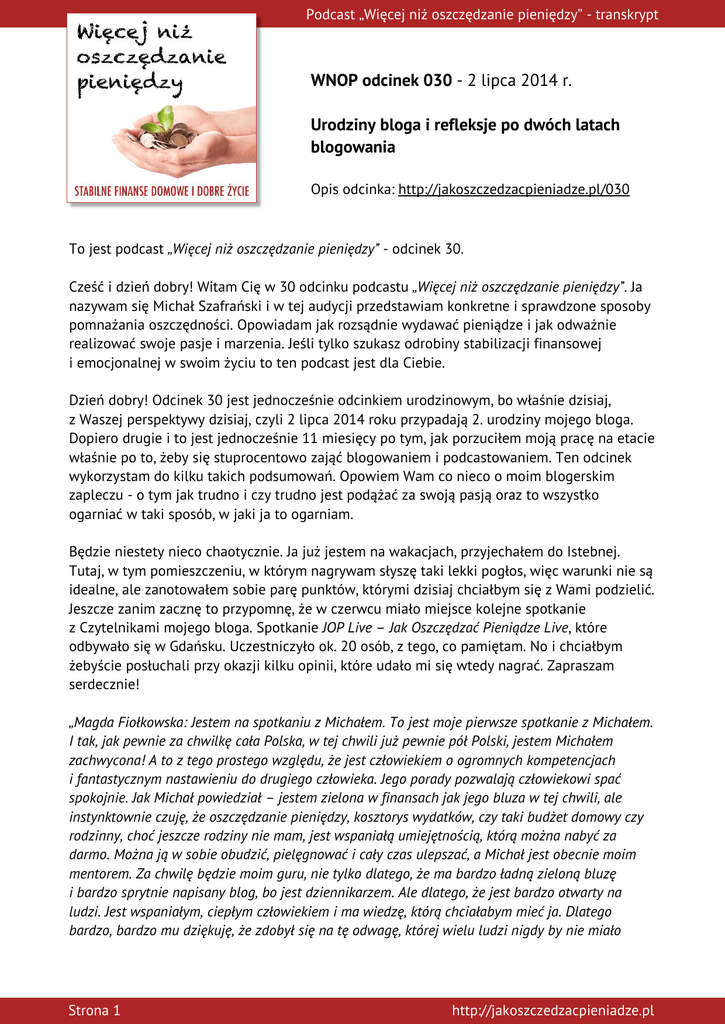 Podcast „Więcej niż oszczędzanie pieniędzy” - transkrypt ae WNOP odcinek 030 - 2 lipca 2014 r. Urodziny bloga i refleksje po dwóch latach blogowania Opis odcinka: http://jakoszczedzacpieniadze.pl/030 To jest podcast „Więcej niż oszczędzanie pieniędzy” - odcinek 30. Cześć i dzień dobry! Witam Cię w 30 odcinku podcastu „Więcej niż oszczędzanie pieniędzy”. Ja nazywam się Michał Szafrański i w tej audycji przedstawiam konkretne i sprawdzone sposoby pomnażania oszczędności. Opowiadam jak rozsądnie wydawać pieniądze i jak odważnie realizować swoje pasje i marzenia. Jeśli tylko szukasz odrobiny stabilizacji finansowej i emocjonalnej w swoim życiu to ten podcast jest dla Ciebie. Dzień dobry! Odcinek 30 jest jednocześnie odcinkiem urodzinowym, bo właśnie dzisiaj, z Waszej perspektywy dzisiaj, czyli 2 lipca 2014 roku przypadają 2. urodziny mojego bloga. Dopiero drugie i to jest jednocześnie 11 miesięcy po tym, jak porzuciłem moją pracę na etacie właśnie po to, żeby się stuprocentowo zająć blogowaniem i podcastowaniem. Ten odcinek wykorzystam do kilku takich podsumowań. Opowiem Wam co nieco o moim blogerskim zapleczu - o tym jak trudno i czy trudno jest podążać za swoją pasją oraz to wszystko ogarniać w taki sposób, w jaki ja to ogarniam. Będzie niestety nieco chaotycznie. Ja już jestem na wakacjach, przyjechałem do Istebnej. Tutaj, w tym pomieszczeniu, w którym nagrywam słyszę taki lekki pogłos, więc warunki nie są idealne, ale zanotowałem sobie parę punktów, którymi dzisiaj chciałbym się z Wami podzielić. Jeszcze zanim zacznę to przypomnę, że w czerwcu miało miejsce kolejne spotkanie z Czytelnikami mojego bloga. Spotkanie JOP Live – Jak Oszczędzać Pieniądze Live, które odbywało się w Gdańsku. Uczestniczyło ok. 20 osób, z tego, co pamiętam. No i chciałbym żebyście posłuchali przy okazji kilku opinii, które udało mi się wtedy nagrać. Zapraszam serdecznie! „Magda Fiołkowska: Jestem na spotkaniu z Michałem. To jest moje pierwsze spotkanie z Michałem. I tak, jak pewnie za chwilkę cała Polska, w tej chwili już pewnie pół Polski, jestem Michałem zachwycona! A to z tego prostego względu, że jest człowiekiem o ogromnych kompetencjach i fantastycznym nastawieniu do drugiego człowieka. Jego porady pozwalają człowiekowi spać spokojnie. Jak Michał powiedział – jestem zielona w finansach jak jego bluza w tej chwili, ale instynktownie czuję, że oszczędzanie pieniędzy, kosztorys wydatków, czy taki budżet domowy czy rodzinny, choć jeszcze rodziny nie mam, jest wspaniałą umiejętnością, którą można nabyć za darmo. Można ją w sobie obudzić, pielęgnować i cały czas ulepszać, a Michał jest obecnie moim mentorem. Za chwilę będzie moim guru, nie tylko dlatego, że ma bardzo ładną zieloną bluzę i bardzo sprytnie napisany blog, bo jest dziennikarzem. Ale dlatego, że jest bardzo otwarty na ludzi. Jest wspaniałym, ciepłym człowiekiem i ma wiedzę, którą chciałabym mieć ja. Dlatego bardzo, bardzo mu dziękuję, że zdobył się na tę odwagę, której wielu ludzi nigdy by nie miało Strona 1 http://jakoszczedzacpieniadze.pl Podcast „Więcej niż oszczędzanie pieniędzy” - transkrypt i zaczął tego bloga prowadzić! No, to już tam pewnie wszyscy mu powiedzieli w prasie i wszyscy inni, którzy tego bloga czytają. Będę zdawała mu szczegółowe relacje ze swoich osiągnięć, będę się go radziła. No a jeśli będzie mnie rzeczywiście potrzebował, to mam nadzieję, że zapamięta, że miałam mu przetłumaczyć bloga na język angielski i że mnie nie zawiedzie i nie pójdzie do nikogo innego. Na razie, cześć!”. „Cześć, tu Adi! Właśnie nagrywam się na Michała dyktafon z naszego spotkania w Gdańsku. Jest przesympatycznie! Michał jest duszą towarzystwa i chciałem powiedzieć, że dzięki blogowi i dzięki Michałowi moje podejście do finansów zmieniło się o 180 stopni. Wyszedłem z długów, zacząłem oszczędzać całkiem przyzwoite pieniądze i nawet mam jakieś perspektywy na przyszłość. Także spełnię swoje marzenia, takie, których kiedyś się nie spodziewałem, że będę mógł spełnić. I generalnie jest świetnie i Michał jest świetną osobą! Michał, zajebiście ci dziękuję za wszystko! Cieszę się, że cię poznałem i mam nadzieję, że będziemy mieli okazję się częściej spotykać. No to tyle. Mam nadzieję, że coś tam znajdziesz, żeby wklecić. Dzięki, trzymaj się!”. „JOP Live Gdańsk, czerwiec, spotkanie Czytelników. Jest bardzo miło, sympatycznie. Bloga czytam od 6, 7 miesięcy. Bardzo mnie inspiruje. Pomógł mi wyjść z długów, które miałam. Zrobiłam ceremonię przecięcia swojej karty kredytowej nożyczkami! Spłaciłam wszystkie kredyty w ciągu 6 miesięcy, prowadząc budżet domowy, zaciskając pasa, oszczędzając, czytając artykuły. Wykorzystując rzeczywiście wszystkie rady, porady, które w tych artykułach były zawarte. W tym momencie jestem na etapie odkładania kasiory na poduszkę bezpieczeństwa. Następnie zacznę prawdopodobnie inwestować korzystając z Elementarza Inwestora, zatem dziękuję ci bardzo za wszystkie twoje wpisy. Dzięki za to, co robisz! Dzięki, że zdecydowałeś się w ogóle rozpocząć pisanie bloga, bo blog ten akurat w moim przypadku tak jakby uświadomił mi to, że należy przestać użalać się nad sobą. Należy przestać kolejnymi kredytami łatać dziurę powstającą comiesięcznie w budżecie. Po prostu wziąć się, że tak powiem... ścisnąć poślady, zacząć myśleć o oszczędzaniu, o inwestowaniu, o racjonalnym wydawaniu kasiory. No i co? I tyle, i dzięki!”. „Bardzo miło jest być w gronie nielicznych ok. 20% Polaków, którzy posiadają jakiekolwiek oszczędności, a ten blog właśnie to zapewnia. Polecam bardzo serdecznie!”. „Cześć Michał! Tu Karolina z Gdańska. Chciałam Ci bardzo podziękować za to, ż