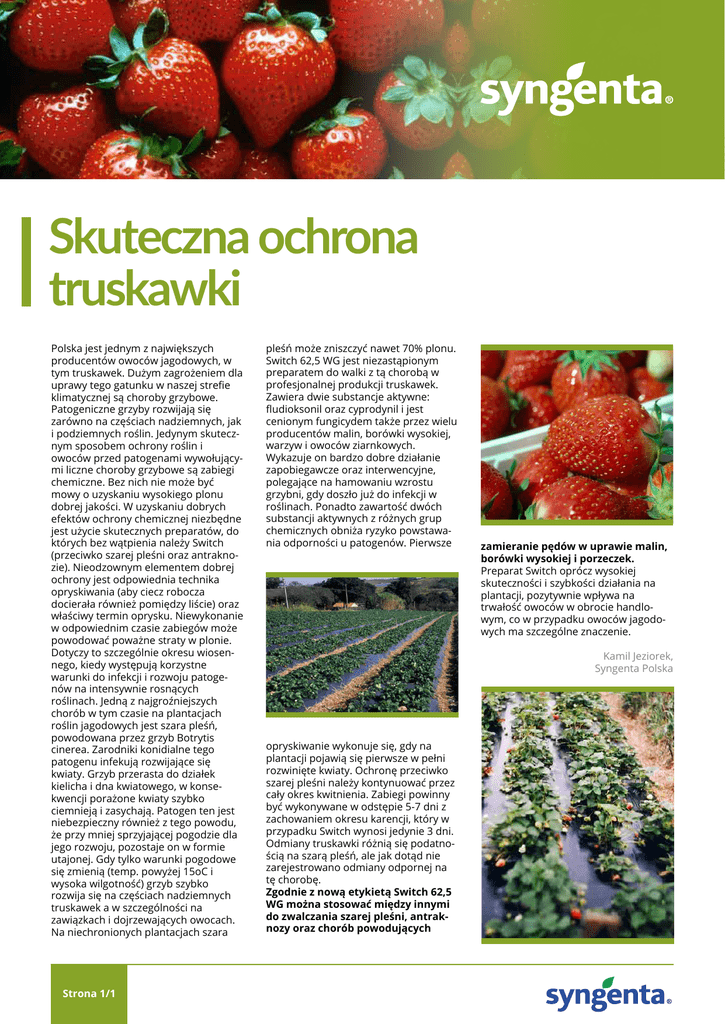 Skuteczna ochrona truskawki Polska jest jednym z największych producentów owoców jagodowych, w tym truskawek. Dużym zagrożeniem dla uprawy tego gatunku w naszej strefie klimatycznej są choroby grzybowe. Patogeniczne grzyby rozwijają się zarówno na częściach nadziemnych, jak i podziemnych roślin. Jedynym skutecznym sposobem ochrony roślin i owoców przed patogenami wywołującymi liczne choroby grzybowe są zabiegi chemiczne. Bez nich nie może być mowy o uzyskaniu wysokiego plonu dobrej jakości. W uzyskaniu dobrych efektów ochrony chemicznej niezbędne jest użycie skutecznych preparatów, do których bez wątpienia należy Switch (przeciwko szarej pleśni oraz antraknozie). Nieodzownym elementem dobrej ochrony jest odpowiednia technika opryskiwania (aby ciecz robocza docierała również pomiędzy liście) oraz właściwy termin oprysku. Niewykonanie w odpowiednim czasie zabiegów może powodować poważne straty w plonie. Dotyczy to szczególnie okresu wiosennego, kiedy występują korzystne warunki do infekcji i rozwoju patogenów na intensywnie rosnących roślinach. Jedną z najgroźniejszych chorób w tym czasie na plantacjach roślin jagodowych jest szara pleśń, powodowana przez grzyb Botrytis cinerea. Zarodniki konidialne tego patogenu infekują rozwijające się kwiaty. Grzyb przerasta do działek kielicha i dna kwiatowego, w konsekwencji porażone kwiaty szybko ciemnieją i zasychają. Patogen ten jest niebezpieczny również z tego powodu, że przy mniej sprzyjającej pogodzie dla jego rozwoju, pozostaje on w formie utajonej. Gdy tylko warunki pogodowe się zmienią (temp. powyżej 15oC i wysoka wilgotność) grzyb szybko rozwija się na częściach nadziemnych truskawek a w szczególności na zawiązkach i dojrzewających owocach. Na niechronionych plantacjach szara Strona 1/1 pleśń może zniszczyć nawet 70% plonu. Switch 62,5 WG jest niezastąpionym preparatem do walki z tą chorobą w profesjonalnej produkcji truskawek. Zawiera dwie substancje aktywne: fludioksonil oraz cyprodynil i jest cenionym fungicydem także przez wielu producentów malin, borówki wysokiej, warzyw i owoców ziarnkowych. Wykazuje on bardzo dobre działanie zapobiegawcze oraz interwencyjne, polegające na hamowaniu wzrostu grzybni, gdy doszło już do infekcji w roślinach. Ponadto zawartość dwóch substancji aktywnych z różnych grup chemicznych obniża ryzyko powstawania odporności u patogenów. Pierwsze zamieranie pędów w uprawie malin, borówki wysokiej i porzeczek. Preparat Switch oprócz wysokiej skuteczności i szybkości działania na plantacji, pozytywnie wpływa na trwałość owoców w obrocie handlowym, co w przypadku owoców jagodowych ma szczególne znaczenie. Kamil Jeziorek, Syngenta Polska opryskiwanie wykonuje się, gdy na plantacji pojawią się pierwsze w pełni rozwinięte kwiaty. Ochronę przeciwko szarej pleśni należy kontynuować przez cały okres kwitnienia. Zabiegi powinny być wykonywane w odstępie 5-7 dni z zachowaniem okresu karencji, który w przypadku Switch wynosi jedynie 3 dni. Odmiany truskawki różnią się podatnością na szarą pleśń, ale jak dotąd nie zarejestrowano odmiany odpornej na tę chorobę. Zgodnie z nową etykietą Switch 62,5 WG można stosować między innymi do zwalczania szarej pleśni, antraknozy oraz chorób powodujących