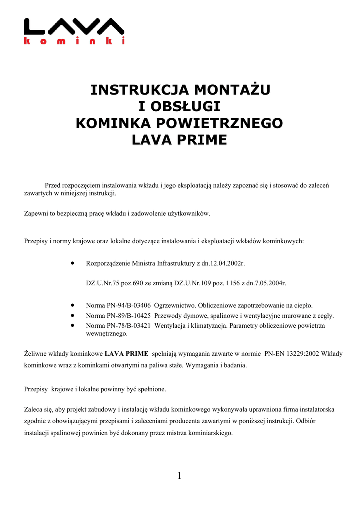 INSTRUKCJA MONTAŻU I OBSŁUGI KOMINKA POWIETRZNEGO LAVA PRIME Przed rozpoczęciem instalowania wkładu i jego eksploatacją należy zapoznać się i stosować do zaleceń zawartych w niniejszej instrukcji. Zapewni to bezpieczną pracę wkładu i zadowolenie użytkowników. Przepisy i normy krajowe oraz lokalne dotyczące instalowania i eksploatacji wkładów kominkowych: Rozporządzenie Ministra Infrastruktury z dn.12.04.2002r. DZ.U.Nr.75 poz.690 ze zmianą DZ.U.Nr.109 poz. 1156 z dn.7.05.2004r. Norma PN-94/B-03406 Ogrzewnictwo. Obliczeniowe zapotrzebowanie na ciepło. Norma PN-89/B-10425 Przewody dymowe, spalinowe i wentylacyjne murowane z cegły. Norma PN-78/B-03421 Wentylacja i klimatyzacja. Parametry obliczeniowe powietrza wewnętrznego. Żeliwne wkłady kominkowe LAVA PRIME spełniają wymagania zawarte w normie PN-EN 13229:2002 Wkłady kominkowe wraz z kominkami otwartymi na paliwa stałe. Wymagania i badania. Przepisy krajowe i lokalne powinny być spełnione. Zaleca się, aby projekt zabudowy i instalację wkładu kominkowego wykonywała uprawniona firma instalatorska zgodnie z obowiązującymi przepisami i zaleceniami producenta zawartymi w poniższej instrukcji. Odbiór instalacji spalinowej powinien być dokonany przez mistrza kominiarskiego. 1 Wymiary i masa kominka WYMIARY ZEWNĘTRZNE (w cm) MODEL A B C D E MASA (kg) LAVA PRIME 15 P 72 55 90 46 20 138 Wymiary i masa kominka WYMIARY ZEWNĘTRZNE (w cm) MODEL LAVA PRIME 15 PA A B C D E MASA (kg) 72 55 90 52 20 144 Wymiary i masa kominka WYMIARY ZEWNĘTRZNE (w cm) MODEL LAVA PRIME 15 PR A B C D E MASA (kg) 72 55 90 50 20 146 A -szerokość zespołu frontowego B - wysokość zespołu frontowego C - wysokość całkowita kominka D - głębokość całkowita kominka E - średnica wylotu spalin 2 DANE TECHNICZNE -TABELA NR 1 L.P. 1 PARAMETR J.m. Nominalana moc cieplna WARTOŚĆ kW 15 kW 15 Moc cieplna przekazywana 2 do pomieszczenia 3 Ogrzewacz stałopalny 4 Sprawność % 61,2 5 Emisja CO % 0,52 6 Emisja CO2 % 8,9 7 Średni niezbędny ciąg kominowy przy mocy nominalnej Pa 12 8 Średnia temperatura spalin ºC 363 9 Zużycie drewna kg/h 6,1 10 Zalecany przekrój komina mm 200 TAK Drewno liściaste rodzaj 11 Paliwo długość mm 450 obwód mm 300-500 wilgotność % Max.20 ZASTOSOWANIE I OPIS URZĄDZENIA Wkłady kominkowe służą do spalania drewna i ogrzewania pomieszczeń. Wydzielające się podczas spalania ciepło ogrzewa żeliwny, ożebrowany korpus paleniska. Obudowa wkładu kominkowego powinna być wykonana z niepalnych materiałów, a wszelkie łatwopalne elementy budynku muszą być zabezpieczone przeciwpożarowo. Wkład kominkowy nie może być w sposób trwały połączony z obudową. Wkłady kominkowe są skręcane z elementów, a wszystkie połączenia są uszczelniane specjalnym kitem żaroodpornym. 3 Podstawowy element wkładu kominkowego to korpus, w skład, którego wchodzi: 1. płyta paleniska z rusztem 2. ściana tylna 3. ściany boczne 4. kopuła , w której zamontowany jest deflektor (przesłona spalin) 5. wylot spalin z obrotowym szybrem. 6. popielnik 7. drzwiczki z szybą żaroodporną 8. drzwiczki popielnika z wlotem powietrza do spalania Powietrze wtórne do dopalania gazów dostarczane jest do komory spalania poprzez szczelinę między górną krawędzią szyby, a ramą drzwiczek. Powietrze wtórne zapobiega również zadymianiu szyby żaroodpornej. INSTALACJA SPALINOWA Wkłady kominkowe powinny być podłączone do własnego, samodzielnego przewodu kominowego. W przypadku, gdy wartość ciągu przekracza 12Pa należy zastosować moderator ciągu utrzymujący podciśnienie w granicach 12 ± 2Pa. Dla prawidłowego funkcjonowania wkładu przekrój przewodu dymowego nie powinien być mniejszy niż średnice wylotu spalin podane w tabeli nr.1,zawierającej dane techniczne wkładów. Przekrój poprzeczny przewodu spalinowego powinien być taki sam na całej długości. Nie powinien posiadać przewężeń i gwałtownych zmian kierunku przepływu. Przewód kominowy powinien być szczelny i wykonany z niepalnych materiałów. Przewody spalinowe powinny posiadać otwory rewizyjne ze szczelnymi drzwiczkami i układ odprowadzania skroplin. Wylot komina powinien być dostępny do czyszczenia. Króciec wylotowy spalin z wkładu kominkowego należy podłączyć do komina za pomocą atestowanego łącznika pod katem 45 0. Łącznik należy wyposażyć w nastawne kolano z pokrywą rewizyjną. Pokrywa rewizyjna powinna być tak umieszczona, aby była dostępna np. przez otwór kratki w obudowie. Kształtki łącznika należy uszczelnić kitem lub pastą odporną na temperaturę minimum 9000C. 4 Komin, zgodnie z wymaganiami ( DZ.U.75/2002 poz.690), powinien być wyprowadzony nad dach na wysokość zabezpieczającą przed zakłóceniami ciągu, co najmniej 0,6m nad kalenicę dachu. Ocenę techniczną komina, wydanie opinii dotyczącej siły ciągu oraz jego przydatności do podłączenia wkładu kominkowego należy zlecić firmie kominiarskiej. MONTAŻ I OBUDOWA KOMINKA Ze względu na dużą wagę zarówno żeliwnego wkładu kominkowego, jak i obudowy (od ok.300 kg do 2000kg), strop na którym będzie zainstalowany kominek musi posiadać odpowiednią wytrzymałość mechaniczną i termiczną. Ze względu na duży ciężar zabudowy, pod wylewką betonową w miejscu , gdzie ma stać kominek ( a nawet poza jego obrysem) nie powinna być położona izolacja cieplna. Odległość dolnej krawędzi wkładu do podłoża powinna wynosić 350mm. Podłoże pod wkładem należy wykonać z materiałów niepalnych o grubości co najmniej 150mm. Jeżeli przed kominkiem podłoga będzie wykonana z materiału palnego, podłoże przed drzwiczkami wkładu powinno być zabezpieczone pasem z materiału niepalnego o szerokości co najmniej 300mm, sięgającym poza krawędź drzwiczek min. 300mm. Ściany, przy których będzie zbudowana obudowa powinny być wykonane z materiałów niepalnych. Dodatkowo powinny być one zabezpieczone wełną mineraln