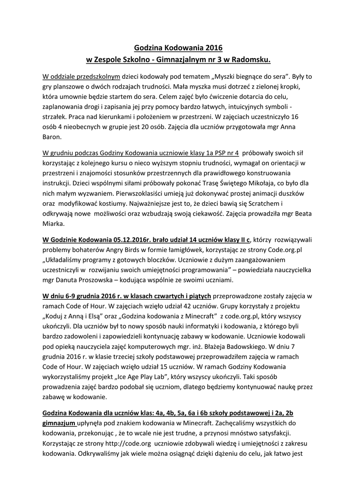 Godzina Kodowania 2016 w Zespole Szkolno - Gimnazjalnym nr 3 w Radomsku. W oddziale przedszkolnym dzieci kodowały pod tematem „Myszki biegnące do sera”. Były to gry planszowe o dwóch rodzajach trudności. Mała myszka musi dotrzeć z zielonej kropki, która umownie będzie startem do sera. Celem zajęć było ćwiczenie dotarcia do celu, zaplanowania drogi i zapisania jej przy pomocy bardzo łatwych, intuicyjnych symboli strzałek. Praca nad kierunkami i położeniem w przestrzeni. W zajęciach uczestniczyło 16 osób 4 nieobecnych w grupie jest 20 osób. Zajęcia dla uczniów przygotowała mgr Anna Baron. W grudniu podczas Godziny Kodowania uczniowie klasy 1a PSP nr 4 próbowały swoich sił korzystając z kolejnego kursu o nieco wyższym stopniu trudności, wymagał on orientacji w przestrzeni i znajomości stosunków przestrzennych dla prawidłowego konstruowania instrukcji. Dzieci wspólnymi siłami próbowały pokonać Trasę Świętego Mikołaja, co było dla nich małym wyzwaniem. Pierwszoklasiści umieją już dokonywać prostej animacji duszków oraz modyfikować kostiumy. Najważniejsze jest to, że dzieci bawią się Scratchem i odkrywają nowe możliwości oraz wzbudzają swoją ciekawość. Zajęcia prowadziła mgr Beata Miarka. W Godzinie Kodowania 05.12.2016r. brało udział 14 uczniów klasy II c, którzy rozwiązywali problemy bohaterów Angry Birds w formie łamigłówek, korzystając ze strony Code.org.pl „Układaliśmy programy z gotowych bloczków. Uczniowie z dużym zaangażowaniem uczestniczyli w rozwijaniu swoich umiejętności programowania” – powiedziała nauczycielka mgr Danuta Proszowska – kodująca wspólnie ze swoimi uczniami. W dniu 6-9 grudnia 2016 r. w klasach czwartych i piątych przeprowadzone zostały zajęcia w ramach Code of Hour. W zajęciach wzięło udział 42 uczniów. Grupy korzystały z projektu „Koduj z Anną i Elsą” oraz „Godzina kodowania z Minecraft” z code.org.pl, który wszyscy ukończyli. Dla uczniów był to nowy sposób nauki informatyki i kodowania, z którego byli bardzo zadowoleni i zapowiedzieli kontynuację zabawy w kodowanie. Uczniowie kodowali pod opieką nauczyciela zajęć komputerowych mgr. inż. Błażeja Badowskiego. W dniu 7 grudnia 2016 r. w klasie trzeciej szkoły podstawowej przeprowadziłem zajęcia w ramach Code of Hour. W zajęciach wzięło udział 15 uczniów. W ramach Godziny Kodowania wykorzystaliśmy projekt „Ice Age Play Lab”, który wszyscy ukończyli. Taki sposób prowadzenia zajęć bardzo podobał się uczniom, dlatego będziemy kontynuować naukę przez zabawę w kodowanie. Godzina Kodowania dla uczniów klas: 4a, 4b, 5a, 6a i 6b szkoły podstawowej i 2a, 2b gimnazjum upłynęła pod znakiem kodowania w Minecraft. Zachęcaliśmy wszystkich do kodowania, przekonując , że to wcale nie jest trudne, a przynosi mnóstwo satysfakcji. Korzystając ze strony http://code.org uczniowie zdobywali wiedzę i umiejętności z zakresu kodowania. Odkrywaliśmy jak wiele można osiągnąć dzięki dążeniu do celu, jak łatwo jest stworzyć algorytm i przygotować coś co może zachwycić. No i jeszcze zbywaliśmy CERTYFIKATY. Natomiast na rozwijających pozalekcyjnych zajęciach z programowania w ramach IV edycji Mistrzów Kodowania uczniowie klas IV i V tworzyli skrypt gry edukacyjnej Rekin goni rybkę. Zajęcia prowadziła mgr Alina Płaszczyńska. Hour of Code 2016-Kodowanie na lekcjach muzyki W ramach światowej inicjatywy Hour of Code 2016 (Godzina Kodowania) 8 grudnia w klasie 6a zorganizowano zajęcia muzyczne łączące aktywne metody pracy z nauką kodowania. Zadaniem uczniów było zakodowanie utworu muzycznego, a potem zagranie go na instrumentach sztabkowych. Najpierw uczniowie zapoznali się z tradycyjnym zapisem nutowym piosenki pt. "Żabka". Odczytali nazwy literowe nut oraz ich wartości rytmiczne i metrum. Jednak nauka tego utworu z nut w wykonaniu całej klasy potrwałaby kilka godzin. Zastosowaliśmy więc pewien zabieg. Przyporządkowaliśmy kolejnym nutom /c,d,e,f,g,a,h/ określony kolor i zapisaliśmy przebieg melodii w postaci kolorowych znaków-kodów. Następnie uczniowie w grupach siedmioosobowych odtworzyli ciąg tych znaków w grze na metalofonach i ksylofonach. Każdy z siedmiu instrumentów został oznakowany jednym kolorem, a więc grano na nim jeden dźwięk zakodowany tym kolorem. I tu niespodzianka. Ku zdziwieniu wszystkich już pierwsze wykonanie utworu było prawie bezbłędne. Wystarczyło ustabilizować tempo oraz puls metryczny i GOTOWE!!!!!!!!!!!!!! Kodując uczniowie nie tylko zgłębiali wiedzę muzyczną, ale także uczyli się logicznego myślenia, dyscypliny, koncentracji, pracy zespołowej i pokonywania barier nieśmiałości. A wszystko to w formie fajnej zabawy. Zajęcia przygotowała i poprowadziła mgr Marzenna Musiał. Scratchersi Grupy Mamus W piątek 9 grudnia na dodatkowych zajęciach Scratchersi z klasy 6a, 6b oraz z pierwszych klas gimnazjalnych przy użyciu programu Code.org uczyli się kodowania zadań dla bohaterów kultowych filmów i gier, takich jak: "Kraina lodu", "Minecraft", "Star Wars", "Angry Birds" zdobywając przy tym imienne certyfikaty z udziału w akcji The Hour of Code. Kodowania ciąg dalszy ........... Dnia 12 grudnia 2016 r. klasa 6a kolejny raz uczestniczyła w zajęciach z kodowania - tym razem w połączeniu z tematyką godzin wychowawczych o rozwijaniu swoich zainteresowań. Uczniowie tworzyli, a potem kodowali układ kubeczków za pomocą znaków graficznych. Niby to zabawa, ale jakże ucząca myślenia, wyobraźni, orientacji przestrzennej oraz współpracy w grupie. Zajęcia przygotowała i poprowadziła p. Marzenna Musiał. Wpis na facebooku i na stronie Mistrzów Kodowania Reymontówka koduje na muzyce. W ZSG nr 3 w Radomsku kodujemy nawet na muzyce. Zadaniem uczniów było zakodowanie melodii piosenki, a potem zagranie jej na instrumentach sztabkowych. Przyporządkowaliśmy kolejnym dźwiękom gamy określ