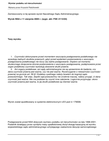 Wymiar podatku od nieruchomości Wpisany przez Krzysztof Radzikowski Zamieszczamy w tej sprawie wyrok Naczelnego Sądu Administracyjnego. Wyrok NSA z 11 sierpnia 2005 r. (sygn. akt: FSK 2113/04) Tezy wyroku 1. Czynności dokonywane przed momentem wszczęcia postępowania podatkowego nie wywołują żadnych skutków prawnych, gdyż przed wydaniem postanowienia o wszczęciu postępowania podatkowego nie toczy się żadne postępowanie. Dopiero od momentu skutecznego doręczenia stronie postanowienia o wszczęciu postępowania, podejmowane przez organ podatkowy czynności wywołują stosowne skutki prawne. 2. Ani organy podatkowe, ani sądy administracyjne nie są uprawnione do badania, czy dana czynność prawna jest ważna, czy nie jest ważna. Rozstrzyganie o nieważności czynności prawnej na gruncie art. 58 §1 Kodeksu cywilnego należy bowiem do kognicji sądu powszechnego. Tak więc, dopóki sąd powszechny nie orzeknie inaczej, należy przyjąć, iż dana czynność jest ważna. Nie ma podstaw by czynić inne założenie. Logicznie przyjmując: skoro czynność prawna jest ważna, to jej skutki podatkowe są również ważne. Wyrok został opublikowany w systemie elektronicznym LEX pod nr 179008. Postępowanie przed NSA dotyczyło wymiaru podatku od nieruchomości za lata 1998-2001. Podatnik działający przez syndyka masy upadłościowej złożył skargę kasacyjną od wyroku wojewódzkiego sądu administracyjnego uchylającego zaskarżone decyzje samorządowego 1/5 Wymiar podatku od nieruchomości Wpisany przez Krzysztof Radzikowski kolegium odwoławczego oraz poprzedzające je decyzje organu pierwszej instancji. I. Przedmiotem sporu było istnienie obowiązku podatkowego w podatku od nieruchomości ciążącego na podatniku. W stanie faktycznym sprawy podatnik zawarł „umowę najmu" nieruchomości (ziemi wraz z budynkami) z osobą fizyczną, która prowadziła na tej nieruchomości działalność gospodarczą w zakresie podnajmu pomieszczeń innym podmiotom. W okresie objętym postępowaniem syndyk masy upadłościowej deklarował i wpłacał podatek od nieruchomości według stawek właściwych dla nieruchomości niezwiązanych z prowadzeniem działalności gospodarczej. Zdaniem organów podatkowych zgodnie z art. 2 ust. 1 pkt 1 i 2 ustawy z dnia 12 stycznia 1991 r. o podatkach i opłatach lokalnych (Dz. U. z nr 9, poz. 31 ze zm.; dalej: ustawa o podatkach i opłatach lokalnych) obowiązek podatkowy w podatku od nieruchomości ciążył na właścicielu budynków i budowli oraz użytkowniku wieczystym gruntu, wchodzących w skład masy upadłościowej podatnika. Obowiązek podatkowy nie wiąże się z prowadzeniem przez podatnika działalności gospodarczej na nieruchomości - okoliczność ta ma jednak wpływ na zwiększenie obciążenia podatkowego poprzez zastosowanie wyższej stawki podatkowej, niezależnie kto prowadzi przedmiotową działalność gospodarczą: podatnik czy dzierżawca. Zdaniem samorządowego kolegium odwoławczego, organ pierwszej instancji prawidłowo ustalił osobę podatnika. Dopiero po ustaleniu istnienia obowiązku podatkowego, wysokości zaległości podatkowej oraz odsetek za zwłokę możliwe jest wszczęcie postępowania w sprawie odpowiedzialności osoby trzeciej (tu: dzierżawcy) na podstawie art. 108 §§ 1 i 2 w związku z art. 114 ustawy z dnia 29 sierpnia 1997 r. - Ordynacja podatkowa (t. j. Dz. U. z 2005 r., nr 8, poz. 60 ze zm.; dalej: Ordynacja podatkowa). 2/5 Wymiar podatku od nieruchomości Wpisany przez Krzysztof Radzikowski W skardze do wojewódzkiego sądu administracyjnego podatnik zarzucił organom podatkowym rażące naruszenie przepisów prawa poprzez niewydanie przez organ pierwszej instancji postanowienia o wszczęciu postępowania wymiarowego i wobec tego skierowania decyzji z naruszeniem art. 247 §1 pkt 5 Ordynacji podatkowej do niewłaściwej osoby. Skarżący twierdził także, że podatnikiem w przedmiotowej sprawie jest dzierżawca nieruchomości władający nią na podstawie „umowy najmu". Wojewódzki sąd administracyjny uznał skargę za zasadną z powodu naruszenia przez organ pierwszej instancji art. 165 §2 Ordynacji podatkowej, nie wydając postanowienia o wszczęciu postępowania. Podatnik złożył skargę kasacyjną od wyroku wojewódzkiego sądu administracyjnego zarzucając mu naruszenie art. 145 §1 pkt 1 lit. a) i c) ustawy z 30 sierpnia 2002 r. - Prawo o postępowaniu przed sądami administracyjnymi (Dz. U. nr 153, poz. 1270 ze zm.; dalej: Prawo o postępowaniu przed sądami administracyjnymi) w związku z art. 2 ust. 1 ustawy o podatkach i opłatach lokalnych w związku z art. 120, art. 121 §§ 1 i 2, art. 122, art. 187 §1 i art. 210 § 1 pkt 6 oraz §4 Ordynacji podatkowej poprzez uchylenie zaskarżonej decyzji jedynie z powodu braku postanowienia o wszczęciu postępowania przez organ pierwszej instancji, podczas gdy naruszono też przepisy prawa materialnego uznając syndyka masy upadłościowej za podatnika podatku od nieruchomości (zdaniem skarżącego podatnikiem był dzierżawca nieruchomości) oraz naruszenie art. 141 §4 Prawa o postępowaniu przed sądami administracyjnymi poprzez brak odniesienia się do wszystkich zarzutów podniesionych w skardze. Skarżący podniósł, że zawarta w zwykłej formie pisemnej „umowa najmu" była w swojej istocie umową dzierżawy. Nazwanie jej „umową najmu" wskazuje, że strony działały z zamiarem obejścia art. 114 Rozporządzenia Prezydenta RP z 24 października 1934 r. - Prawo upadłościowe (t. j. Dz. U. z 1991 r., nr 118, poz. 512 ze zm.; dalej: Prawo upadłościowe). Zgodnie z tym przepisem dla prowadzenia przedsiębiorstwa upadłego dłużej niż w ciągu trzech miesięcy od daty ogłoszenia upadłości, a także zawarcia umowy dzierżawy przedsiębiorstwa wchodzącego w skład masy upadłości albo nieruchomości przeznaczonej do jego prowadzenia, syndyk powinien uzyskać zezwolenie sądu. W przedmiotowej sprawie zgoda taka nie została 