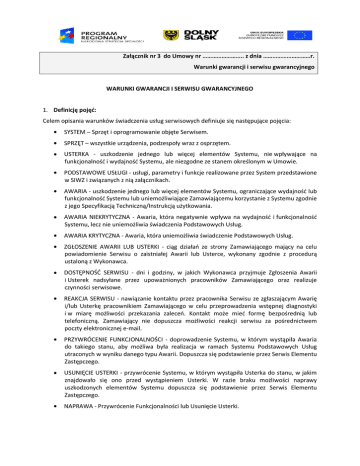 Załącznik nr 3 do Umowy nr …………………….. z dnia …………………………r. Warunki gwarancji i serwisu gwarancyjnego WARUNKI GWARANCJI I SERWISU GWARANCYJNEGO 1. Definicję pojęć: Celem opisania warunków świadczenia usług serwisowych definiuje się następujące pojęcia: SYSTEM – Sprzęt i oprogramowanie objęte Serwisem. SPRZĘT – wszystkie urządzenia, podzespoły wraz z osprzętem. USTERKA - uszkodzenie jednego lub więcej elementów Systemu, nie wpływające na funkcjonalność i wydajność Systemu, ale niezgodne ze stanem określonym w Umowie. PODSTAWOWE USŁUGI - usługi, parametry i funkcje realizowane przez System przedstawione w SIWZ i związanych z nią załącznikach. AWARIA - uszkodzenie jednego lub więcej elementów Systemu, ograniczające wydajność lub funkcjonalność Systemu lub uniemożliwiające Zamawiającemu korzystanie z Systemu zgodnie z jego Specyfikacją Techniczną/Instrukcją użytkowania. AWARIA NIEKRYTYCZNA - Awaria, która negatywnie wpływa na wydajność i funkcjonalność Systemu, lecz nie uniemożliwia świadczenia Podstawowych Usług. AWARIA KRYTYCZNA - Awaria, która uniemożliwia świadczenie Podstawowych Usług. ZGŁOSZENIE AWARII LUB USTERKI - ciąg działań ze strony Zamawiającego mający na celu powiadomienie Serwisu o zaistniałej Awarii lub Usterce, wykonany zgodnie z procedurą ustaloną z Wykonawca. DOSTĘPNOŚĆ SERWISU - dni i godziny, w jakich Wykonawca przyjmuje Zgłoszenia Awarii i Usterek nadsyłane przez upoważnionych pracowników Zamawiającego oraz realizuje czynności serwisowe. REAKCJA SERWISU - nawiązanie kontaktu przez pracownika Serwisu ze zgłaszającym Awarię i/lub Usterkę pracownikiem Zamawiającego w celu przeprowadzenia wstępnej diagnostyki i w miarę możliwości przekazania zaleceń. Kontakt może mieć formę bezpośrednią lub telefoniczną. Zamawiający nie dopuszcza możliwości reakcji serwisu za pośrednictwem poczty elektronicznej e-mail. PRZYWRÓCENIE FUNKCJONALNOŚCI - doprowadzenie Systemu, w którym wystąpiła Awaria do takiego stanu, aby możliwa była realizacja w ramach Systemu Podstawowych Usług utraconych w wyniku danego typu Awarii. Dopuszcza się podstawienie przez Serwis Elementu Zastępczego. USUNIĘCIE USTERKI - przywrócenie Systemu, w którym wystąpiła Usterka do stanu, w jakim znajdowało się ono przed wystąpieniem Usterki. W razie braku możliwości naprawy uszkodzonych elementów Systemu dopuszcza się podstawienie przez Serwis Elementu Zastępczego. NAPRAWA - Przywrócenie Funkcjonalności lub Usunięcie Usterki. CZAS REAKCJI SERWISU - maksymalny czas, jaki może upłynąć pomiędzy pierwszym Zgłoszeniem Awarii lub Usterki a Reakcją Serwisu. CZAS PRZYWRÓCENIA FUNKCJONALNOŚCI - czas, jaki może upłynąć pomiędzy pierwszym Zgłoszeniem Awarii a Przywróceniem Funkcjonalności. CZAS USUNIĘCIA USTERKI - czas, jaki może upłynąć pomiędzy pierwszym Zgłoszeniem Usterki a jej usunięciem. ELEMENT ZASTĘPCZY – Sprzęt, który Serwis udostępnia Zamawiającemu, jeżeli nie jest możliwe w ustalonym czasie wykonanie Naprawy uszkodzonego Sprzętu. Element Zastępczy musi mieć parametry takie same lub lepsze jak Sprzęt, który uległ awarii. Element zastępczy jest podstawiany na czas niezbędny do wykonania Naprawy. DNI ROBOCZE - przez wszystkie dni tygodnia bez wyjątku. GODZINY ROBOCZE - przez godziny robocze rozumie się godziny od 0.00 do 24:00 w Dni Robocze. BŁĄD – Awaria krytyczna, lub Awaria niekrytyczna. 2. Gwarancja: 2.1. Wykonawca udziela gwarancji na dostarczone Systemy na okres 36 miesięcy licząc od dnia odbioru końcowego bez zastrzeżeń. 2.2. Wykonawca udziela gwarancji na dostarczony sprzęt i montaż na okres 36 miesięcy licząc od dnia odbioru końcowego bez zastrzeżeń 2.3. W ramach gwarancji Wykonawca zapewni także serwis gwarancyjny. 2.4. Wszelkie koszty gwarancji wraz z serwisem gwarancyjnym są w pełni włączone do ceny ofertowej. 3. Serwis gwarancyjny: 3.1. W ramach serwisu gwarancyjnego Sprzętu Wykonawca: 3.1.1. wykona na miejscu u Zamawiającego przegląd gwarancyjny dostarczonego Sprzętu w ilości minimum jeden raz na rok. Przeglądy gwarancyjne dotyczą dostarczonej infrastruktury w całości. 3.1.2. usunie Awarię lub Usterkę w siedzibie Zamawiającego, a w przypadku konieczności zabrania uszkodzonego elementu systemu zobowiązuje się do podstawienia, właściwego skonfigurowania i uruchomienia Elementu Zastępczego, który będzie mógł w pełni przejąć funkcje uszkodzonego elementu przez cały czas niezbędny do naprawy; 3.1.3. wymieni/naprawi dostarczony w ramach postępowania uszkodzony Sprzęt; 3.1.4. w godzinach roboczych zakładu Zamawiającego zapewni telefoniczne wsparcie techniczne umożliwiające zgłaszanie awarii lub usterki, a także zaproponuje procedurę zgłaszania awarii krytycznych poza godzinami roboczymi; 3.1.5. zapewni w godzinach roboczych zakładu Zamawiającego telefoniczne konsultacje w sprawie rozwiązywania problemów niezakwalifikowanych jako awarie lub usterki w wymiarze do 20 godzin rocznie; 3.1.6. za wszelkie prace gwarancyjne wraz z dojazdem, delegacją itp. Wykonawca nie pobiera dodatkowych opłat. 3.1.7. Zamawiający dopuszcza, aby wymianę uszkodzonego elementu Systemu na sprawny dokonywał nieautoryzowany serwis Wykonawcy przy zachowaniu rygoru, że naprawy tych uszkodzonych elementów będzie dokonywał już autoryzowany serwis producenta (jeżeli taka wymiana nie jest sprzeczna z warunkami gwarancji producenta elementu Systemu). 3.2. W ramach serwisu gwarancyjnego oprogramowania Wykonawca: 3.2.1. wykona na miejscu u Zamawiającego przeglądy gwarancyjne oprogramowania i baz danych w ilości minimum jeden przegląd na rok. Przeglądy gwarancyjne obejmują: poprawę, kontrolę konfiguracji i poprawności działania oprogramowania; 3.2.2. jest zobowiązany do bezpłatnego dostosowywania aplikacji do zmieniających się w tym okresie przepisów prawa polskiego or