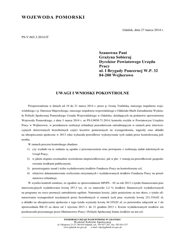 WOJEWODA POMORSKI Gdańsk, dnia 27 marca 2014 r. PS-V.865.3.2014.IT Szanowna Pani Grażyna Sobieraj Dyrektor Powiatowego Urzędu Pracy ul. I Brygady Pancernej W.P. 32 84-200 Wejherowo UWAGI I WNIOSKI POKONTROLNE Przeprowadzona w dniach od 19 do 21 marca 2014 r. przez p. Iwonę Trafalską, starszego inspektora wojewódzkiego i p. Dariusza Majewskiego, starszego inspektora wojewódzkiego z Oddziału Służb Zatrudnienia Wydziału Polityki Społecznej Pomorskiego Urzędu Wojewódzkiego w Gdańsku, działających na podstawie upoważnienia Wojewody Pomorskiego, z dnia 3 marca 2014 r. nr PS-I.0030.71.2014, kontrola zwykła w Powiatowym Urzędzie Pracy w Wejherowie, w przedmiocie realizacji refundacji pracodawcom zatrudniającym w ramach prac interwencyjnych skierowanych bezrobotnych części kosztów poniesionych na wynagrodzenia, nagrody oraz składki na ubezpieczenia społeczne w 2013 roku wykazała prawidłowe wykonywanie tych zadań przez kontrolowaną jednostkę. W ramach procesu kontrolnego zbadano: 1) czy wydatki na te zadania są zgodne z przeznaczeniem oraz powiązane z realizacją zadań nałożonych na Urząd Pracy, 2) w jakim stopniu ewentualnie stwierdzone nieprawidłowości, jak w pkt. 1 rzutują na prawidłowość gospodarowania środkami publicznymi, 3) przestrzeganie zasad i trybu wydatkowania środków Funduszu Pracy na kontrolowany cel, 4) właściwe dokumentowanie rozliczenia otrzymanych i wydatkowanych środków Funduszu Pracy na przedmiotowe refundacje. W wyniku kontroli ustalono, że zgodnie ze sprawozdaniem MPiPS – 02 za rok 2013 z tytułu finansowania prac interwencyjnych wydatkowano kwotę 297,5 tys. zł, co stanowiło 2,2 % środków finansowych wydatkowanych na programy na rzecz promocji zatrudnienia ogółem. Natomiast koszty, jakie poniesiono za ten okres, z tytułu sfinansowania wynagrodzeń uzyskanych przez bezrobotnych w ramach tych prac wyniosły kwotę 251.554,02 zł, a składki na ubezpieczenia społeczne z tego tytułu wyniosły kwotę 44.359,02 zł, co potwierdza załącznik nr 1 do sprawozdania RB-33 za okres od 1 stycznia 2013 r. do 31 grudnia 2013 r. Kwota wydatkowanych środków nie przekraczała przyznanego przez Ministerstwo Pracy i Polityki Społecznej limitu środków na ten cel. POMORSKI URZĄD WOJEWÓDZKI W GDAŃSKU W y d z i a ł P o l i t y ki S p o ł e c z n e j ul. Okopowa 21/27, 80-810 Gdańsk, tel.: 583 077 287, fax: 583 014 337 www.gdansk.uw.gov.pl e-mail: [email protected] Kontrolowana jednostka prowadzi rejestr umów zawartych z pracodawcami dotyczących refundacji części kosztów na wynagrodzenia i składki na ubezpieczenia społeczne w ramach prac interwencyjnych. Zgodnie z tym rejestrem w 2013 r. podpisano 32 takie umowy dla 44 osób bezrobotnych i wszystkie one zostały poddane procesowi kontrolnemu. Ze zbadanej dokumentacji wynika, że kontrolowana jednostka stosuje wniosek o analizowaną refundację spełniający wymogi określone w § 5 rozporządzenia Ministra Pracy i Polityki Społecznej z dnia 7 stycznia 2009 r. w sprawie organizowania prac interwencyjnych i robót publicznych oraz jednorazowej refundacji kosztów z tytułu opłaconych składek na ubezpieczenia społeczne (Dz. U. Nr 5, poz. 25). Złożone przez pracodawców wnioski poddawane są wymaganej weryfikacji, tak co do spełniania przez pracodawcę warunków do uzyskania refundacji, jak i wymogów określonych dla skierowanych osób bezrobotnych, co znajduje swoje odzwierciedlenie w karcie oceny formalnej i merytorycznej wniosku dokonywanej komisyjnie. Następnie wnioskodawca informowany jest w zakreślonym przez ww. rozporządzenie terminie o wynikach rozpatrzenia wniosku. Z kolei dochodzi do zawarcia umów, które jak to wykazała kontrola spełniają wymogi określone przez § 6 i 7 ww. rozporządzenia. Kontrolowana jednostka w badanym okresie realizowała refundacje dla osób bezrobotnych z grupy znajdującej się w szczególnie niekorzystnej sytuacji, o jakiej mowa w art. 2 pkt 18 lub bardzo niekorzystnej sytuacji, o jakiej mowa w art. 2 pkt 19 rozporządzenia Komisji (WE) nr 800/2008 z dnia 6 sierpnia 2008 r. oraz art. 49 ustawy z dnia 20 kwietnia 2004 r. o promocji zatrudnienia i instytucjach ryku pracy (Dz. U. z 2013 r., poz. 674, z późn. zm.). Wszystkie one odbyły się zgodnie z warunkami określonymi przez te przepisy prawa tak, co do okresu dopuszczalnej refundacji, jej dopuszczalnej wysokości oraz wymogów stawianych skierowanym osobom bezrobotnym określonych przez art. 49 tej ustawy, spełnianie których szczegółowo skontrolowano w oparciu o 44 akta osób bezrobotnych, co stanowi 100 % wszystkich bezrobotnych, których dotyczyła kontrola refundacji. Rozliczenia poddanych sprawdzeniu refundacji dokonywane były po przedłożeniu przez pracodawcę wniosku o refundację oraz uwierzytelnionych kserokopii list płac wraz z pokwitowaniem odbioru wynagrodzenia, wniosków urlopowych i zaświadczeń lekarskich o niezdolności do pracy z powodu choroby lub konieczności sprawowania osobistej opieki nad chorym członkiem rodziny, uwierzytelnionej kserokopii deklaracji rozliczeniowej (DRA) i raportu imiennego (CX), a także potwierdzonych dowodów wpłat składek na ubezpieczenia społeczne. Przeanalizowane przedmiotowe rozliczenia dotyczące skontrolowanych umów były poprawne i nie stwierdzono w nich istotnych uchybień. Kwoty zwrotu części wypłaconego wynagrodzenia zgodne były z zawartą umową ustaloną zgodnie z zasadami określonymi przez art. 51 ust. 1 i art. 56 ust. 1 ustawy o promocji zatrudnienia i instytucjach rynku pracy, a składek na ubezpieczenia społeczne odpowiadały wysokości określonej przez art. 22 ust. 1 ustawy z dnia 13 października 1998 r. o systemie ubezpieczeń społecznych (Dz. U. z 2009 r. Nr 205, poz. 1585, z późn. zm.). Według oceny kontrolujących nieuzasadnione jest kierowanie do wykonywania pracy w ramach prac interwencyjnych osób bezrobotnych wskazanych przez pracodawcę, co nie jest zgodne z założeniami us