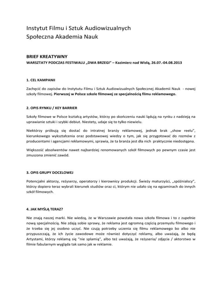 Instytut Filmu i Sztuk Audiowizualnych Społeczna Akademia Nauk BRIEF KREATYWNY WARSZTATY PODCZAS FESTIWALU „DWA BRZEGI” – Kazimierz nad Wisłą, 26.07.‐04.08.2013 1. CEL KAMPANII Zachęcić do zapisów do Instytutu Filmu i Sztuk Audiowizualnych Społecznej Akademii Nauk ‐ nowej szkoły filmowej. Pierwszej w Polsce szkole filmowej ze specjalnością filmu reklamowego. 2. OPIS RYNKU / KEY BARRIER Szkoły filmowe w Polsce kształcą artystów, którzy po skończeniu nauki lądują na rynku z nadzieją na uprawianie sztuki i szybki debiut. Niestety, udaje się to tylko niewielu. Niektórzy próbują się dostać do intratnej branży reklamowej, jednak brak „show reelu”, kierunkowego wykształcenia oraz podstawowej wiedzy o tym, jak się przygotować do rozmów z producentami i agencjami reklamowymi, sprawia, że ta branża jest dla nich praktycznie niedostępna. Większość absolwentów nawet najbardziej renomowanych szkół filmowych po pewnym czasie jest zmuszona zmienić zawód. 3. OPIS GRUPY DOCELOWEJ Potencjalni aktorzy, reżyserzy, operatorzy i kierownicy produkcji. Świeży maturzyści, „spóźnialscy”, którzy dopiero teraz wybrali kierunek studiów oraz ci, którym nie udało się na egzaminach do innych szkół filmowych. 4. JAK MYŚLĄ TERAZ? Nie znają naszej marki. Nie wiedzą, że w Warszawie powstała nowa szkoła filmowa i to z zupełnie nową specjalnością. Nie zdają sobie sprawy, że reklama jest ogromną częścią przemysłu filmowego i że trzeba się jej osobno uczyć. Nie czują potrzeby uczenia się filmu reklamowego bo albo nie przypuszczają, że ich życie zawodowe może również dotyczyć reklamy, albo uważają, że będą Artystami, którzy reklamą się ”nie splamią”, albo też uważają, że reżyseria/ zdjęcia / aktorstwo w filmie fabularnym wygląda tak samo jak w reklamie. 5. JAK MAJĄ MYŚLEĆ POTEM? „Ta szkoła jest jedyną szkołą filmową w Polsce, która specjalizuje się w filmie reklamowym. Oczywiście przygotuje mnie też do pracy w filmie fabularnym, dokumentalnym i w telewizji, ale da też coś więcej, a nie zaszkodzi nabyć dodatkowych umiejętności. Warto pójść do tej szkoły, bo nie wiadomo jak potoczy się moje życie zawodowe, czy od razu dostanę film jako reżyser, operator, aktor czy też kierownik produkcji. Bez tego specjalistycznego przygotowania nie będę konkurencyjny na rynku. Poza tym wielu wybitnych reżyserów filmowych zaczynało od reklamy, choćby Tony i Ridley Scott, David Lynch, Allan Parker, Guy Ritchie i wielu innych. Dla mnie też reklama może być drogą do szybszej kariery filmowej.” 6. KORZYŚĆ Instytut Filmu i Sztuk Audiowizualnych SAN daje to, co wszystkie szkoły filmowe: solidną edukację filmową. Ale daje również coś, czego nie daje żadna inna szkoła filmowa w Polsce – dodatkowe możliwości zarobkowania w stale rozwijającej się branży reklamowej. Ludzie mogą żyć bez filmu fabularnego, ale gospodarka nie może się rozwijać bez reklamy, więc absolwenci Instytutu będą mieli o wiele więcej możliwości pracy. Po zakończeniu szkoły absolwenci będą mieli swój show reel, bez którego rozpoczęcie pracy w branży nie jest możliwe. Szkoła daje licencjat, a już pierwszy rocznik będzie miał możliwość kontynuowania nauki na studiach magisterskich. 8. GŁÓWNY PRZEKAZ Sztuka dla sztuki + reklama dla pieniędzy.