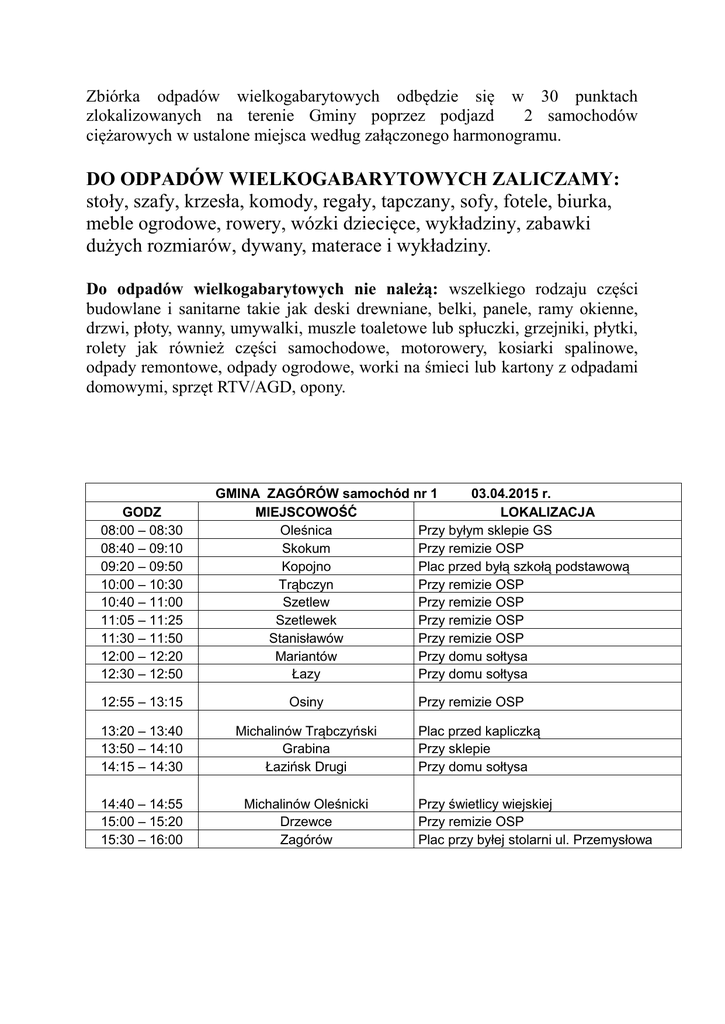 Zbiórka odpadów wielkogabarytowych odbędzie się w 30 punktach zlokalizowanych na terenie Gminy poprzez podjazd 2 samochodów ciężarowych w ustalone miejsca według załączonego harmonogramu. DO ODPADÓW WIELKOGABARYTOWYCH ZALICZAMY: stoły, szafy, krzesła, komody, regały, tapczany, sofy, fotele, biurka, meble ogrodowe, rowery, wózki dziecięce, wykładziny, zabawki dużych rozmiarów, dywany, materace i wykładziny. Do odpadów wielkogabarytowych nie należą: wszelkiego rodzaju części budowlane i sanitarne takie jak deski drewniane, belki, panele, ramy okienne, drzwi, płoty, wanny, umywalki, muszle toaletowe lub spłuczki, grzejniki, płytki, rolety jak również części samochodowe, motorowery, kosiarki spalinowe, odpady remontowe, odpady ogrodowe, worki na śmieci lub kartony z odpadami domowymi, sprzęt RTV/AGD, opony. GODZ 08:00 – 08:30 08:40 – 09:10 09:20 – 09:50 10:00 – 10:30 10:40 – 11:00 11:05 – 11:25 11:30 – 11:50 12:00 – 12:20 12:30 – 12:50 GMINA ZAGÓRÓW samochód nr 1 03.04.2015 r. MIEJSCOWOŚĆ LOKALIZACJA Oleśnica Przy byłym sklepie GS Skokum Przy remizie OSP Kopojno Plac przed byłą szkołą podstawową Trąbczyn Przy remizie OSP Szetlew Przy remizie OSP Szetlewek Przy remizie OSP Stanisławów Przy remizie OSP Mariantów Przy domu sołtysa Łazy Przy domu sołtysa 12:55 – 13:15 Osiny 13:20 – 13:40 13:50 – 14:10 14:15 – 14:30 Michalinów Trąbczyński Grabina Łazińsk Drugi 14:40 – 14:55 15:00 – 15:20 15:30 – 16:00 Michalinów Oleśnicki Drzewce Zagórów Przy remizie OSP Plac przed kapliczką Przy sklepie Przy domu sołtysa Przy świetlicy wiejskiej Przy remizie OSP Plac przy byłej stolarni ul. Przemysłowa GODZ 08:00 – 08:30 08:40 – 09:00 09:10 – 09:30 09:35 – 09:55 10:05 – 10:25 10:30 – 10:50 10:55 – 11:15 11:30 – 11:50 11:55 – 12:15 12:25 – 12:45 12:55 – 13:15 13:25 – 13:50 14:00 – 14:15 14:20 – 14:50 15:00 – 16:00 GMINA ZAGÓRÓW samochód nr 2 03.04.2015 r. MIEJSCOWOŚĆ LOKALIZACJA Wrąbczyn Przy remizie OSP Kościołków Przy byłej remizie OSP Imielno Przy remizie OSP Łukom Plac przed szkołą podstawową Adamierz Przy domu sołtysa Myszakówek Przy sklepie (przy skrzyżowaniu) Koszelewska Łąka Przy domu sołtysa Anielewo Przy remizie OSP Huta Łukomska Przy przystanku PKS Łomów Przy remizie OSP Bukowe Przy remizie OSP Augustynów Przy remizie OSP Zalesie Przy domu sołtysa Nowa Wieś Przy remizie OSP Zagórów Plac przy byłej stolarni ul. Przemysłowa