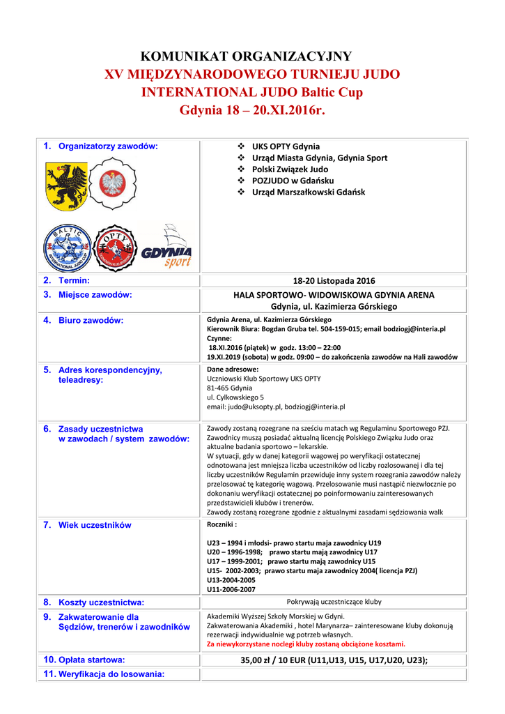 KOMUNIKAT ORGANIZACYJNY XV MIĘDZYNARODOWEGO TURNIEJU JUDO INTERNATIONAL JUDO Baltic Cup Gdynia 18 – 20.XI.2016r. 1. Organizatorzy zawodów: 2. Termin: 3. Miejsce zawodów: UKS OPTY Gdynia Urząd Miasta Gdynia, Gdynia Sport Polski Związek Judo POZJUDO w Gdańsku Urząd Marszałkowski Gdańsk 18-20 Listopada 2016 HALA SPORTOWO- WIDOWISKOWA GDYNIA ARENA Gdynia, ul. Kazimierza Górskiego 4. Biuro zawodów: Gdynia Arena, ul. Kazimierza Górskiego Kierownik Biura: Bogdan Gruba tel. 504-159-015; email [email protected] Czynne: 18.XI.2016 (piątek) w godz. 13:00 – 22:00 19.XI.2019 (sobota) w godz. 09:00 – do zakończenia zawodów na Hali zawodów 5. Adres korespondencyjny, Dane adresowe: Uczniowski Klub Sportowy UKS OPTY 81-465 Gdynia ul. Cylkowskiego 5 email: [email protected], [email protected] teleadresy: 6. Zasady uczestnictwa w zawodach / system zawodów: 7. Wiek uczestników Zawody zostaną rozegrane na sześciu matach wg Regulaminu Sportowego PZJ. Zawodnicy muszą posiadać aktualną licencję Polskiego Związku Judo oraz aktualne badania sportowo – lekarskie. W sytuacji, gdy w danej kategorii wagowej po weryfikacji ostatecznej odnotowana jest mniejsza liczba uczestników od liczby rozlosowanej i dla tej liczby uczestników Regulamin przewiduje inny system rozegrania zawodów należy przelosować tę kategorię wagową. Przelosowanie musi nastąpić niezwłocznie po dokonaniu weryfikacji ostatecznej po poinformowaniu zainteresowanych przedstawicieli klubów i trenerów. Zawody zostaną rozegrane zgodnie z aktualnymi zasadami sędziowania walk Roczniki : U23 – 1994 i młodsi- prawo startu maja zawodnicy U19 U20 – 1996-1998; prawo startu mają zawodnicy U17 U17 – 1999-2001; prawo startu mają zawodnicy U15 U15- 2002-2003; prawo startu maja zawodnicy 2004( licencja PZJ) U13-2004-2005 U11-2006-2007 8. Koszty uczestnictwa: 9. Zakwaterowanie dla Sędziów, trenerów i zawodników 10. Opłata startowa: 11. Weryfikacja do losowania: Pokrywają uczestniczące kluby Akademiki Wyższej Szkoły Morskiej w Gdyni. Zakwaterowania Akademiki , hotel Marynarza– zainteresowane kluby dokonują rezerwacji indywidualnie wg potrzeb własnych. Za niewykorzystane noclegi kluby zostaną obciążone kosztami. 35,00 zł / 10 EUR (U11,U13, U15, U17,U20, U23); Weryfikację do zawodów przeprowadza Komisarz zawodów w terminie : losowanie po zakończeniu ważenia każdej grupy wiekowej 12. Konferencja techniczna i losowanie: Sala konferencyjna Gdynia Arena w dniu zawodów po zakończeniu ważenia danej grupy wiekowej Zawody we wszystkich kategoriach wiekowych i wagowych. 13. Komisarz zawodów: Krzysztof Rogulski tel. 534-651-939; [email protected] 14. Sędzia Główny: Jarosław Niewiadomski – uczestniczy w Konferencji Technicznej 15. Judoki 16. Kategorie wagowe / czas walki 1.Obowiązują judoki białe i niebieskie. Pierwszy wyczytany zawodnik/zawodniczka ubiera judogi białą, drugi zawodnik/zawodniczka judogi niebieskie. - U12 i U14 judogi białe , drugi wyczytany zakłada czerwona przepaskę 2.Kontrola judog odbywa się zgodnie z zasadami Sokuteiki. 3.Do dekoracji obowiązuje judogi koloru białego. 4. Back numbers – Dopuszczone, Imię i Nazwisko – Klub – dopuszczone 5. Koszulki kobiet – zgodnie z przepisami walk 6. Reklamy i inne elementy na judogi spełniające wymogi przepisów PZJ i określone w przepisach walki Women /Dziewczynki U11 – 8 kategorii ; czas walki – 2 min. Men / Chłopcy U11 – 21kg, 24kg, 27kg, 30kg, 33kg, 36kg, 39kg, 42kg, 46kg, 50kg, 55kg, +55kg; czas walki – 2min. Women /Dziewczynki U13 – 8 kategorii ; czas walki – 2 min. Men / Chłopcy U13 –27kg, 30kg, 33kg, 36kg, 39kg, 42kg, 46kg, 50kg, 55kg, 55kg; 60kg, 66kg, +66kg czas walki – 2min. Women/Dziewczynki U15 – 36kg, 40kg, 44kg, 48kg, 52kg, 57kg, 63kg, 70kg, +70kg; czas walki 3 min. Men/Chłopcy U15 – 38kg, 42kg, 46kg, 50kg, 55kg, 60kg, 66kg, 73kg, 81kg, +81kg; czas walki – 3 min. Women/Kobiety U17 – 40kg, 44kg, 48kg, 52kg, 57kg, 63kg, 70kg, +70kg, czas walki – 4 min. Men/Mężczyźni U17 – 46kg, 50kg, 55kg, 60kg, 66kg, 73kg, 81kg, 90kg, +90kg, czas walki – 4 min. Women/Kobiety U20 – 44kg, 48kg, 52kg, 57kg, 63kg, 70kg, 78kg,+78kg czas walki – 4 min. Men/Mężczyźni U20 – 55kg, 60kg, 66kg, 73kg, 81kg, 90kg, 100kg,+100kg czas walki – 4 min. U23 . Women/Kobiety -48,-52,-57,-63,-70,-78,+78 Men/Mężczyźni U23 -60,-66kg,-73,-81,-90,-100,+100 17.Zgłoszenia do zawodów: Czas walki 5min Zgłoszenia dokonuje się do 16.Xi.2016 – zgłoszenia dotyczą ZAWODNIKÓW/ZAWODNICZEK, POPRZEZ SYSTEM REJESTRACJI ZAWODÓW U11 i U13 przez stronę www.judobalticcup.pl, Grupy Wiekowe U15,U17,U20 i U23 zgłoszenie przez elektroniczny System Rejestracji do zawodów pzjudo.pl do 14.11.2016 1.Kluby dokonują zgłoszeń sportowych do dnia 14 listopada 2016r. 2.Zgłoszenie dokonane po terminie będą rozpatrywane podczas weryfikacji. Korekta zgłoszenia: zmiana kategorii wagowej, wykreślenie z zawodów, nie dotyczy dokonania zgłoszenia nowej osoby do zawodów., zgłoszenie po terminie to 1,5 razy startowe Tryb dokonywania korekt: drogą elektroniczną przez system, mail na adres: www.judobalticcup.pl, i na [email protected] lub podczas weryfikacji do zawodów. Inny tryb dokonywania korekt nie będzie uwzględniony. 18.Ważenie i przegląd lekarski: Waga kontrolna w dniu 18.11.2016 (piątek ) >> Hala Gdynia Arena w godzinach 10;00-13;00 Hala Gdynia Arena ul. Kazimierza Górskiego Waga oficjalna i przegląd lekarski : 18.11. 2016 (Piątek) U11 – 13;00-14;00 U13 – 14:00 – 15;00 19.11.2016 (Sobota) U15 - 08:00 – 09:30 U20 –13:30 – 14:30 20.11. 2016 (Niedziela) U18 - 08:00 – 09:00 AM U 23 –13:30– 14:30 PM 19.Program zawodów: 18.11.2016r. – piątek Losowanie U11- 14:00 – 15:00 U13 – 15:00 – 16:00 Rozpoczęcie zawodów U11 – 15:00 U13 – 16:00 W godz. 14:00 – 22:00 – przyjazd i zakwaterowanie uczestników zawodów – informacja w Biurze Zawodów Godz. 18:00 – 20:00 – weryf