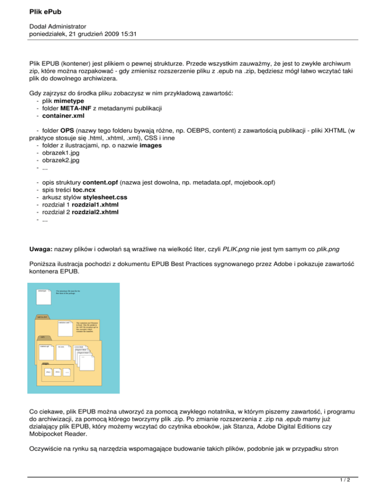 Plik ePub Dodał Administrator poniedziałek, 21 grudzień 2009 15:31 Plik EPUB (kontener) jest plikiem o pewnej strukturze. Przede wszystkim zauważmy, że jest to zwykłe archiwum zip, które można rozpakować - gdy zmienisz rozszerzenie pliku z .epub na .zip, będziesz mógł łatwo wczytać taki plik do dowolnego archiwizera. Gdy zajrzysz do środka pliku zobaczysz w nim przykładową zawartość: - plik mimetype - folder META-INF z metadanymi publikacji - container.xml - folder OPS (nazwy tego folderu bywają różne, np. OEBPS, content) z zawartością publikacji - pliki XHTML (w praktyce stosuje się .html, .xhtml, .xml), CSS i inne - folder z ilustracjami, np. o nazwie images - obrazek1.jpg - obrazek2.jpg - ... - opis struktury content.opf (nazwa jest dowolna, np. metadata.opf, mojebook.opf) spis treści toc.ncx arkusz stylów stylesheet.css rozdział 1 rozdzial1.xhtml rozdział 2 rozdzial2.xhtml ... Uwaga: nazwy plików i odwołań są wrażliwe na wielkość liter, czyli PLIK.png nie jest tym samym co plik.png Poniższa ilustracja pochodzi z dokumentu EPUB Best Practices sygnowanego przez Adobe i pokazuje zawartość kontenera EPUB. Co ciekawe, plik EPUB można utworzyć za pomocą zwykłego notatnika, w którym piszemy zawartość, i programu do archiwizacji, za pomocą którego tworzymy plik .zip. Po zmianie rozszerzenia z .zip na .epub mamy już działający plik EPUB, który możemy wczytać do czytnika ebooków, jak Stanza, Adobe Digital Editions czy Mobipocket Reader. Oczywiście na rynku są narzędzia wspomagające budowanie takich plików, podobnie jak w przypadku stron 1/2 Plik ePub Dodał Administrator poniedziałek, 21 grudzień 2009 15:31 HTML, ale tekstowy format "wnętrza" pliku EPUB nie wymaga ich bezwględnego stosowania. Plik mimetype Plik mimetype, znadujący się w kontenerze na samym wierzchu, nie ma rozszerzenia, a jego zawartość składa się z jednego wiersza: application/epub+zip Plik ten informuje o typie kontenera - zzipowanym pliku EPUB. Plik container.xml Plik container.xml znajdujący się w folderze META-INF, powtarzalny w różnych ebookach (jednak z różną ścieżką full-path), wskazuje położenie content.opf. Jego przykładowa zawartość jest następująca: <?xml version="1.0"?> <container version="1.0" xmlns="urn:oasis:names:tc:opendocument:xmlns:container"> <rootfiles> <rootfile full-path="OPS/content.opf" media-type="application/oebps-package+xml"/> </rootfiles> </container> Plik OPF Zawartość pliku content.opf opisujemy na osobnej stronie. 2/2