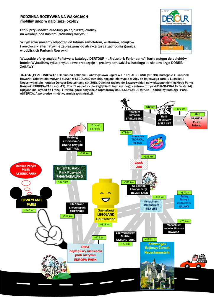 RODZINNA ROZRYWKA NA WAKACJACH mobilny urlop w najbliższej okolicy! Oto 2 przykładowe auto-tury po najbliższej okolicy na wakacje pod hasłem „rodzinnej rozrywki” W tym roku możemy odpocząć od latania samolotem, wulkanów, strajków i rewolucji – alternatywnie zapraszamy do atrakcji tuż za zachodnią granicą: w pobliskich Parkach Rozrywki! Wszystkie oferty znajdą Państwo w katalogu DERTOUR – „Freizeit- & Ferienparks”: karty wstępu do obiektów i hotele. Wybraliśmy tylko przykładowe propozycje – prosimy sprawdzić w katalogu ile się tam kryje DOBREJ ZABAWY! TRASA „POŁUDNIOWA” z Berlina na południe – obowiązkowa kąpiel w TROPICAL ISLAND (str. 98), następnie > kierunek Bawaria: zabawa dla małych i dużych w LEGOLAND (str. 56), opcjonalnie wypad w Alpy do bajkowego zamku Ludwika II Neuschwanstein (katalog Dertour-Deutschland str. 308). Dalej na zachód do Szwarcwaldu i największego niemieckiego Parku Rozrywki EUROPA-PARK (str. 42). Powrót na północ do Zagłębia Ruhry i słynnego centrum rozrywki PHANTASIALAND (str. 74). Opcjonalnie: wypad do Francji i Paryża, gdzie oczywiście zapraszamy do DISNEYLANDu (str.32 + oddzielny katalog) i Parku ASTERIXA. A po drodze mnóstwo mniejszych atrakcji. +32 km Poczdam Filmpark BABELSBERG +110 km Start Berlin Aqua Dom & SEA LIFE Powrót do Polski GRANICA PL‐DE Świecko +79 km Krausnick TROPICAL ISLAND Bestwig k.Dortmundu Kraina przygód FORT FUN +192 km +151 km Okolice Paryża Plailly ASTERIX PARK Lipsk ZOO Bruehl k. Kolonii Park Rozrywki PHANTASIALAND +307 km DISNEYLAND PARIS +540 km +301 km Geiselwind k.Norymbergi FREIZEIT-LAND +230 km Monachium Oceanarium SEA LIFE Cleebronn Erlebnisspark TRIPSDRILL +162 km Guenzburg LEGOLAND Deutschland +23 km Monachium miasto filmowe BAVARIA +113 km +272 km RUST największy niemiecki park rozrywki EUROPA-PARK Bad Worishofen ALLGAU SKYLINE PARK +73 km +37 km Erding Termy i zjeżdżalnie GALAXY +128 km Schwangau Bajkowy Zamek Neuschwanstein TRASA „PÓŁNOCNA” mijamy Berlin (Oceanarium SEA LIFE str. 103 i miasteczko filmowe Potsdam-Babelsberg, str. 100) oraz Wolfsburg (Phaneo - park eksperymentów str. 101) i jedziemy do Hanoweru: najatrakcyjniejszego ZOO w Niemczech (str. 82). Skręt na północ do Soltau ze słynnym parkiem rozrywki Heide-Park (str. 70). Stąd już bardzo blisko nad Bałtyk w okolice Lubeki do Hansa-Park (str. 68). Potem oczywiście trzeba odwiedzić duński LEGOLAND (str. 54) i park wodny LALANDIA w Billund (str. 51). A na zakończenie polecamy spokojny wypoczynek w domkach wakacyjnych w Skandynawii z katalogu Nordische Laender. Najwygodniejszy powrót do Polski: promem (rezerwacja przez Dertour – Ocean24.com). Billund LEGOLAND Dania Billund LALANDIA +158 km Sierksdorf k. Lubeki HANSA-PARK +277 km Powrót do Polski lub dalszy wypoczynek w Skandynawii Soltau Park Rozrywki HEIDE-PARK +90 km +206 km Wolfsburg Phaneo +32 km Hannover ZOO +89 km Poczdam Filmpark BABELSBERG +110 km Berlin Aqua Dom & SEA LIFE Start GRANICA PL‐DE Świecko W katalogu Dertour-Parki Rozrywki („Freizeit- & Ferienparks”) znajdą Państwo również całoroczne wspaniałe ośrodki rodzinne we Francji, Holandii i Belgii – kompleksy bungalowów połączone z tropikanami i basenami. Zapraszamy na rodzinny wypoczynek do wiosek rodzinnych CenterParcs i Sunparks. Oprócz basenów wewnętrznych i zewnętrznych połączonych rzekami i wodospadami znajdą tu Państwo niezliczone atrakcje dla każdej grupy wiekowej: place zabaw, łaźnie, sauny, SPA, możliwości uprawiania wszelkich sportów oraz gry, zabawy i animacje. Informacja i rezerwacja: PZM-Travel sp. z o. o. 02-513 Warszawa, ul. Madalińskiego 20/lok. 3A tel. +48-22 849 84 49, 849 69 04 / fax +48-22 849 69 15 e-mail: [email protected]