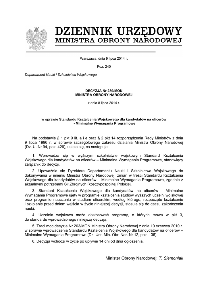 DECYZJA Nr 289 MON z dnia 8 lipca 2014