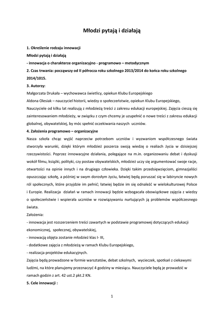 Młodzi pytają i działają 1. Określenie rodzaju innowacji Młodzi pytają i działają - innowacja o charakterze organizacyjno - programowo – metodycznym 2. Czas trwania: począwszy od II półrocza roku szkolnego 2013/2014 do końca roku szkolnego 2014/1015. 3. Autorzy: Małgorzata Drukała – wychowawca świetlicy, opiekun Klubu Europejskiego Aldona Olesiak – nauczyciel historii, wiedzy o społeczeństwie, opiekun Klubu Europejskiego, Nauczyciele od kilku lat realizują z młodzieżą treści z zakresu edukacji europejskiej. Zajęcia cieszą się zainteresowaniem młodzieży, w związku z czym chcemy je uzupełnić o nowe treści z zakresu edukacji globalnej, obywatelskiej, by móc spełnić oczekiwania naszych uczniów. 4. Założenia programowo – organizacyjne Nasza szkoła chcąc wyjść naprzeciw potrzebom uczniów i wyzwaniom współczesnego świata stworzyła warunki, dzięki którym młodzież poszerza swoją wiedzę o realiach życia w dzisiejszej rzeczywistości. Poprzez innowacyjne działania, polegające na m.in. organizowaniu debat i dyskusji wokół filmu, książki, polityki, czy postaw obywatelskich, młodzież uczy się argumentować swoje racje, otwartości na opinie innych i na drugiego człowieka. Dzięki takim przedsięwzięciom, gimnazjaliści opuszczając szkołę, a później w swym dorosłym życiu, łatwiej będą poruszać się w labiryncie nowych ról społecznych, które przyjdzie im pełnić; łatwiej będzie im się odnaleźć w wielokulturowej Polsce i Europie. Realizacja działań w ramach innowacji będzie wzbogacała obowiązkowe zajęcia z wiedzy o społeczeństwie i wspierała uczniów w rozwiązywaniu nurtujących ją problemów współczesnego świata. Założenia: - innowacja jest rozszerzeniem treści zawartych w podstawie programowej dotyczących edukacji ekonomicznej, społecznej, obywatelskiej, - innowacją objęta zostanie młodzież klas I- III, - dodatkowe zajęcia z młodzieżą w ramach Klubu Europejskiego, - realizacja projektów edukacyjnych. Zajęcia będą prowadzone w formie warsztatów, debat szkolnych, wycieczek, spotkań z ciekawymi ludźmi, na które planujemy przeznaczyć 4 godziny w miesiącu. Nauczyciele będą je prowadzić w ramach godzin z art. 42 ust.2 pkt.2 KN. 5. Cele innowacji : 1 Uczeń: - rozpoznaje problemy najbliższego otoczenia, kraju, świata i próbuje znaleźć ich rozwiązanie; -współpracuje z innymi – planuje, dzieli się zadaniami i wywiązuje się z nich; - korzysta z różnych źródeł informacji (prasa, radio, telewizja, Internet, książki); - wyraża własne zdanie w wybranych sprawach publicznych i uzasadnia je, jest otwarty na odmienne poglądy. 6. Treści: a. Jak przeprowadzić dobry wywiad? Treści kształcenia: co to jest wywiad?, po co robić wywiad?, jak przygotować się do wywiadu? jak przeprowadzać wywiad? b. Sztuka dyskusji, umiejętność komunikowania się. Treści kształcenia: zasady komunikowania się i współpracy w grupie, różnice między przekazami, informacja i komentarz, zasady dobrej dyskusji, formułowanie własnych opinii i umiejętne argumentowanie ich; c. Spotkania z lokalnymi działaczami. Treści kształcenia: kim jest działacz lokalny?, poznanie kompetencji samorządu lokalnego, jak można promować swoją gminę?, jak prowadzona jest kampania wyborcza i wybory do władz lokalnych?, jak obywatele mogą wpływać na decyzje władz lokalnych?, dlaczego nie wszyscy mieszkańcy gminy chcą tego samego? d. Edukacja globalna i problemy współczesnego świata Treści kształcenia: różnice między krajami globalnego Południa i globalnej Północy, jak przezwyciężać ten podział świata, przed jakimi globalnymi problemami stoi świat?, w jaki sposób zwykli obywatele mogą pomóc je rozwiązać? Na czym polegają wzajemne zależności we współczesnym świecie?, przyczyny i skutki konfliktów we współczesnym świecie. e. Polska i Polacy w Europie i świecie Treści kształcenia: jakie znaczenie dla Polski ma członkostwo w organizacjach międzynarodowych, dlaczego i jak zjednoczyła się Europa?, co dla młodych Polaków wynika z członkostwa w UE?, czym zajmują się ambasady i konsulaty? f. Żyję w demokratycznym kraju Treści kształcenia: czym różnią się od siebie demokracja, dyktatura i anarchia?, czy demokracja jest zawsze taka sama?, jakie są granice wolności?, czy wartości demokratyczne mogą być ze sobą w konflikcie g. Poznać i zrozumieć innych 2 Treści kształcenia: rodzaje mniejszości ( narodowa, religijna, etniczna), skąd się biorą i w czym przeszkadzają stereotypy narodowe?, czy nacjonalizm może być groźny? czy we współczesnym świecie wciąż istnieje szowinizm? h. Aktywność obywatelska Treści kształcenia: rodzaje aktywności obywatelskiej, kim jest obywatel?, co to znaczy być patriotą i jak to dziś rozumieją młodzi ludzie?, po co chodzić na wybory?, jak obywatele uczestniczą w życiu publicznym?, czy mass media to rzeczywiście czwarta władza? i. Bliżej kultury Treści kształcenia: czym jest kultura?, w jaki sposób wzbogaca nas obcowanie ze światem kultury? Konfrontacje rzeczywistości z wizjami ludzi kultury a naszymi. 7. Planowane osiągnięcia ucznia: Po zakończeniu innowacji uczeń powinien umieć: - skorzystać z różnych źródeł informacji na temat życia publicznego; - odróżniać elementy informacyjne od perswazyjnych; - formułować własne opinie i argumentować je; - stosować zasady dobrej dyskusji, wywiadu; - rozpoznawać i definiować najważniejsze problemy dotyczące środowiska lokalnego, Polski i współczesnego świata oraz szukać ich rozwiązań; - samodzielnie wyszukiwać i interpretować informacje dotyczące nurtujących problemów; - rozpoznawać różne formy uczestnictwa obywatelskiego w życiu publicznym; -podejmować i realizować świadome zobowiązania dotyczące działania na rzecz innych; - korzystać z dóbr kultury. 8. Metody pracy: - projekt indywidualny i zes