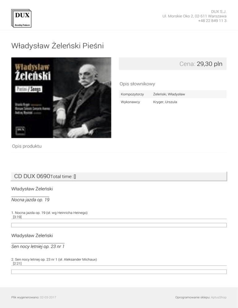 DUX S.J. Ul. Morskie Oko 2, 02-511 Warszawa +48 22 849 11 3 Władysław Żeleński Pieśni Cena: 29,30 pln Opis słownikowy Kompozytorzy Żeleński, Władysław ∎ Wykonawcy Kryger, Urszula ∎ Opis produktu CD DUX 0690Total time: [] Władysław Żeleński Nocna jazda op. 19 1. Nocna jazda op. 19 (sł. wg Heinricha Heinego) [3:19] Władysław Żeleński Sen nocy letniej op. 23 nr 1 2. Sen nocy letniej op. 23 nr 1 (sł. Aleksander Michaux) [2:21] Plik wygenerowano: 02-03-2017 Oprogramowanie sklepu: AptusShop DUX S.J. Ul. Morskie Oko 2, 02-511 Warszawa +48 22 849 11 3 Władysław Żeleński Podarunek op. 26 nr 2 3. Podarunek op. 26 nr 2 (sł. Narcyza Żmichowska) [3:53] Władysław Żeleński Pieśń Jaruhy 4. Pieśń Jaruhy (sł. Józef Ignacy Kraszewski) [3:14] Władysław Żeleński Ja błąkam się wszędzie 5. Ja błąkam się wszędzie (sł. Zygmunt Krasiński) [3:39] Władysław Żeleński Zawsze i wszędzie 6. Zawsze i wszędzie (sł. Zygmunt Krasiński) [5:24] Władysław Żeleński Zaczarowana królewna 7. Zaczarowana królewna (sł. Adam Asnyk) [3:05] Władysław Żeleński Plik wygenerowano: 02-03-2017 Oprogramowanie sklepu: AptusShop DUX S.J. Ul. Morskie Oko 2, 02-511 Warszawa +48 22 849 11 3 Na fujarce 8. Na fujarce (sł. Maria Konopnicka) [4:42] Władysław Żeleński Te rozkwitłe ciche drzew 9. Te rozkwitłe ciche drzewa (sł. Adam Mickiewicz) [2:41] Władysław Żeleński Nie wróci 10. Nie wróci (sł. Teresa Wodzicka) [2:32] Władysław Żeleński Zawód 11. Zawód (sł. Kazimierz Przerwa-Tetmajer) [3:46] Władysław Żeleński A kiedy będziesz moją żoną 12. A kiedy będziesz moją żoną (sł. Kazimierz Przerwa-Tetmajer) [4:30] Władysław Żeleński Blada róża Plik wygenerowano: 02-03-2017 Oprogramowanie sklepu: AptusShop DUX S.J. Ul. Morskie Oko 2, 02-511 Warszawa +48 22 849 11 3 13. Blada róża (sł. Kazimierz Przerwa-Tetmajer) [2:42] Władysław Żeleński Elegia 14. Elegia (sł. Zygmunt Krasiński) [4:22] Władysław Żeleński Brzozy 15. Brzozy (sł. Kazimierz Przerwa-Tetmajer) [3:07] Władysław Żeleński Powrót piosenki 16. Powrót piosenki (sł. Adam Asnyk) [3:56] Władysław Żeleński Preludium – Widzę ją 17. Preludium – Widzę ją (sł. Kazimierz Przerwa-Tetmajer) [2:53] Władysław Żeleński Skonaj ty serce 18. Skonaj ty serce (sł. Kazimierz Przerwa-Tetmajer) [2:46] Plik wygenerowano: 02-03-2017 Oprogramowanie sklepu: AptusShop DUX S.J. Ul. Morskie Oko 2, 02-511 Warszawa +48 22 849 11 3 Władysław Żeleński Ja Tobie serce ślę 19. Ja Tobie serce ślę (sł. Jacek Malczewski) [2:54] Wykonawcy: Urszula Kryger /mezzosopran/ Plik wygenerowano: 02-03-2017 Powered by TCPDF (www.tcpdf.org) Oprogramowanie sklepu: AptusShop