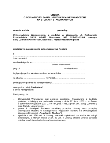 UMOWA O ODPŁATNOŚCI ZA USŁUGI EDUKACYJNE ŚWIADCZONE NA STUDIACH STACJONARNYCH zawarta w dniu ………………...................... pomiędzy: Uniwersytetem Warszawskim, z siedzibą w Warszawie, ul. Krakowskie Przedmieście 26/28, 00-927 Warszawa, NIP 525-001-12-66, zwanym dalej „Uniwersytetem” lub „Uczelnią”, reprezentowanym przez ……………………........................................................................................................... działającym na podstawie pełnomocnictwa Rektora a ……………………………….......................................................................... (imię i nazwisko) zamieszkałym/łą w ……………………......................................................... (nazwa miejscowości) przy ul. ……………………........................................ nr mieszkania ……… legitymującym/cą się dokumentem tożsamości nr …….............................. nr albumu ……............................ nr PESEL …………………..................... podającym/cą adres do korespondencji ………………………………………………… zwanym/ną dalej „Studentem” o treści następującej: Zważywszy, że: – – – Uniwersytet Warszawski jest uczelnią publiczną, finansowaną z budżetu państwa, działającą na podstawie ustawy z dnia 27 lipca 2005 r. – Prawo o szkolnictwie wyższym (Dz. U. Nr 164, poz. 1365, z późn. zm.; dalej: „Ustawa”) oraz Statutu Uniwersytetu; prawa i obowiązki Studenta określają przepisy Ustawy oraz przepisy wewnętrzne Uczelni, w szczególności Regulamin studiów na Uniwersytecie Warszawskim (dalej: „Regulamin Studiów”); zgodnie z art. 160 ust. 3 Ustawy, warunki odpłatności za studia lub usługi edukacyjne, o których mowa w art. 99 ust. 1 Ustawy określa umowa zawarta między uczelnią a studentem w formie pisemnej; 1 Strony niniejszej Umowy postanowiły, co następuje: § 1.1. Studia stacjonarne na Uniwersytecie Warszawskim są nieodpłatne, za wyjątkiem opłat przewidzianych Ustawą, w szczególności opłat za: 1) zajęcia na drugim lub kolejnym kierunku studiów w formie stacjonarnej, jeżeli decyzja w sprawie przyjęcia na te studia została podjęta po dniu 30 września 2012 r., z zastrzeżeniem art. 99 ust. 1a Ustawy, 2) powtarzanie zajęć na studiach stacjonarnych z powodu ich niezaliczenia, w tym również zajęć do wyboru objętych planem studiów, jeśli student dokona ich zmiany, 3) kształcenie poza dodatkowym limitem punktów ECTS określonym zgodnie z § 2 pkt 9 Regulaminu Studiów, 4) zajęcia nieobjęte planem studiów, na które student się zapisał, ale ich nie zaliczył, 5) zajęcia na studiach stacjonarnych prowadzonych w języku obcym, 6) różnice programowe, 7) konsultacje dotyczące pracy dyplomowej po wznowieniu studiów w przypadku skreślenia z powodu niezłożenia pracy dyplomowej lub egzaminu dyplomowego w terminie, 8) kursy dokształcające. 2. Uprawnienie Studenta do udziału w zajęciach, o których mowa w ust. 1 powyżej uzależnione jest od zapisania się Studenta w trybie ustalonym w Regulaminie Studiów na te zajęcia oraz od wniesienia opłat z tego tytułu w terminach ustalonych przez kierownika właściwej jednostki organizacyjnej prowadzącej studia (dziekana). Udział Studenta w takich zajęciach odbywa się w trybie i na warunkach określonych w Regulaminie Studiów oraz zgodnie z zatwierdzonym programem studiów. 3. Wysokość opłat określa zarządzenie Rektora wydane na podstawie art. 99 ust. 2 Ustawy (zwane dalej: „Zarządzeniem”). Zarządzenie jest publikowane w Monitorze UW; informacja o wysokości opłat jest również zamieszczona na stronie internetowej Uczelni. 4. Wykaz opłat obowiązujących w dniu podpisania niniejszej Umowy w odniesieniu do kierunku studiów wybranych przez Studenta stanowi załącznik do niniejszej Umowy. 5. Za zajęcia, o których mowa w ust. 1, w szczególności za kształcenie na drugim lub kolejnym kierunku studiów w formie stacjonarnej oraz za zajęcia, które w chwili zawierania niniejszej Umowy nie są oferowane przez Uniwersytet, opłaty pobierane będą według stawek obowiązujących w chwili zapisania się Studenta na te zajęcia. Przed zapisaniem się na dodatkowe zajęcia dydaktyczne Studentowi zostanie doręczony, za potwierdzeniem dołączonym do akt umowy, wyciąg z Zarządzenia, ustalający wysokość opłat za zajęcia, obowiązujące w zadeklarowanym przez Studenta okresie uczestniczenia w zajęciach. 6. W przypadku podjęcia na podstawie art. 170a ust. 3 Ustawy studiów stacjonarnych na drugim kierunku bez wnoszenia opłat, Student zobowiązuje się do: (a) wniesienia opłaty za pierwszy rok tych studiów, w terminie określonym przez kierownika właściwej jednostki organizacyjnej prowadzącej studia (dziekana), jeżeli na pierwszym roku tych studiów nie spełnił kryteriów, o których mowa w art. 181 ust.1 Ustawy (kryteria do uzyskania stypendium Rektora) oraz (b) wnoszenia opłat w kolejnych latach tych studiów – jeżeli 2 w roku studiów poprzedzających dany rok tych studiów nie spełnił kryteriów, o których mowa w art. 181 ust.1 Ustawy (kryteria do uzyskania stypendium Rektora). § 2.1. W przypadku zmian w programie studiów, powodujących zmianę kosztów prowadzonych zajęć, Uniwersytet zastrzega sobie prawo do odpowiedniej zmiany (w tym podwyższenia) opłat. Również zmiana kosztów ponoszonych w zakresie niezbędnym do uruchomienia i prowadzenia studiów lub zajęć na studiach (z uwzględnieniem kosztów amortyzacji i remontów) może stanowić podstawę do odpowiedniej zmiany (w tym podwyższenia) opłat. 2. O zmianie wysokości opłaty Student zostanie poinformowany z trzymiesięcznym wyprzedzeniem. W ciągu 14 dni od dnia otrzymania zawiadomienia o zmianie wysokości opłaty Student może zrezygnować z korzystania z zajęć, których dotyczy zmiana opłaty, zachowując prawo do zwrotu wnies
