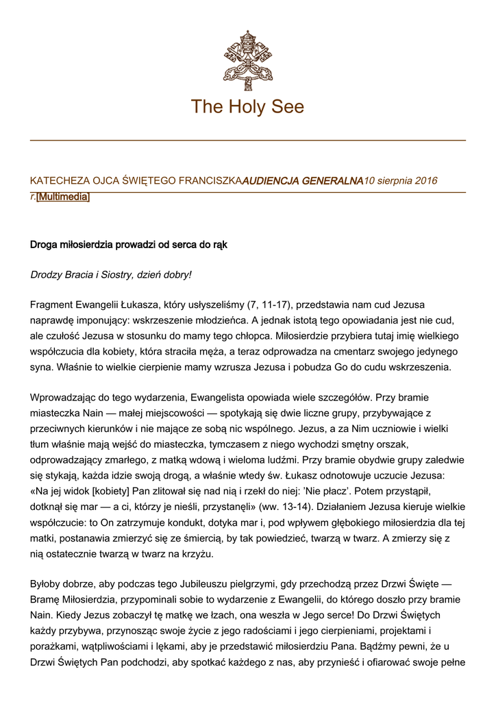 The Holy See KATECHEZA OJCA ŚWIĘTEGO FRANCISZKAAUDIENCJA GENERALNA10 sierpnia 2016 r.[Multimedia] Droga miłosierdzia prowadzi od serca do rąk Drodzy Bracia i Siostry, dzień dobry! Fragment Ewangelii Łukasza, który usłyszeliśmy (7, 11-17), przedstawia nam cud Jezusa naprawdę imponujący: wskrzeszenie młodzieńca. A jednak istotą tego opowiadania jest nie cud, ale czułość Jezusa w stosunku do mamy tego chłopca. Miłosierdzie przybiera tutaj imię wielkiego współczucia dla kobiety, która straciła męża, a teraz odprowadza na cmentarz swojego jedynego syna. Właśnie to wielkie cierpienie mamy wzrusza Jezusa i pobudza Go do cudu wskrzeszenia. Wprowadzając do tego wydarzenia, Ewangelista opowiada wiele szczegółów. Przy bramie miasteczka Nain — małej miejscowości — spotykają się dwie liczne grupy, przybywające z przeciwnych kierunków i nie mające ze sobą nic wspólnego. Jezus, a za Nim uczniowie i wielki tłum właśnie mają wejść do miasteczka, tymczasem z niego wychodzi smętny orszak, odprowadzający zmarłego, z matką wdową i wieloma ludźmi. Przy bramie obydwie grupy zaledwie się stykają, każda idzie swoją drogą, a właśnie wtedy św. Łukasz odnotowuje uczucie Jezusa: «Na jej widok [kobiety] Pan zlitował się nad nią i rzekł do niej: ’Nie płacz’. Potem przystąpił, dotknął się mar — a ci, którzy je nieśli, przystanęli» (ww. 13-14). Działaniem Jezusa kieruje wielkie współczucie: to On zatrzymuje kondukt, dotyka mar i, pod wpływem głębokiego miłosierdzia dla tej matki, postanawia zmierzyć się ze śmiercią, by tak powiedzieć, twarzą w twarz. A zmierzy się z nią ostatecznie twarzą w twarz na krzyżu. Byłoby dobrze, aby podczas tego Jubileuszu pielgrzymi, gdy przechodzą przez Drzwi Święte — Bramę Miłosierdzia, przypominali sobie to wydarzenie z Ewangelii, do którego doszło przy bramie Nain. Kiedy Jezus zobaczył tę matkę we łzach, ona weszła w Jego serce! Do Drzwi Świętych każdy przybywa, przynosząc swoje życie z jego radościami i jego cierpieniami, projektami i porażkami, wątpliwościami i lękami, aby je przedstawić miłosierdziu Pana. Bądźmy pewni, że u Drzwi Świętych Pan podchodzi, aby spotkać każdego z nas, aby przynieść i ofiarować swoje pełne 2 mocy słowo pocieszenia: «Nie płacz!» (w. 13). To jest Brama spotkania cierpienia ludzkości ze współczuciem Boga. Gdy przekraczamy próg, odbywamy naszą pielgrzymkę do miłosierdzia Boga, który tak jak umarłemu chłopcu, powtarza wszystkim: «Tobie mówię, wstań!» (w. 14). Do każdego z nas mówi: «Wstań!». Bóg chce, abyśmy stali. Stworzył nas, abyśmy stali: dlatego współczucie Jezusa prowadzi do tego gestu uzdrowienia, do uzdrowienia nas, czego kluczowym słowem jest: «Wstań! Stań na nogi, tak jak stworzył cię Bóg!». Stój. «Ale, Ojcze, my tak często upadamy». — «Dalej, wstań!». Takie są słowa Jezusa — zawsze. Gdy przechodzimy przez Drzwi Święte, starajmy się usłyszeć w swoim sercu to słowo: «Wstań!». Pełne mocy słowo Jezusa może sprawić, że się podniesiemy, i także w nas dokonać przejścia od śmierci do życia. Jego słowo sprawia, że odżywamy, daje nadzieję, pokrzepia zmęczone serca, otwiera na wizję świata i życia wychodzącą poza cierpienie i śmierć. Na Drzwiach Świętych jest wygrawerowany dla każdego niewyczerpany skarb Bożego miłosierdzia! Gdy dotarło do niego słowo Jezusa, «zmarły usiadł i zaczął mówić; i [On] oddał go jego matce» (w. 15). To zdanie jest bardzo piękne — wskazuje na czułość Jezusa: «Oddał go jego matce». Matka odzyskuje syna. Przyjmując go z rąk Jezusa, staje się matką po raz drugi, ale ten syn, który teraz zostaje jej zwrócony, nie od niej otrzymał życie. Matka i syn otrzymują w ten sposób każde swoją tożsamość, dzięki potężnemu słowu Jezusa i Jego pełnemu miłości gestowi. W ten sposób, zwłaszcza w czasie Jubileuszu, matka Kościół przyjmuje swoje dzieci, rozpoznając w nich życie podarowane przez łaskę Bożą. Właśnie na mocy tej łaski — łaski chrztu, Kościół staje się matką, a każdy z nas staje się jego dzieckiem. Na widok młodzieńca przywróconego do życia i zwróconego matce «wszystkich (...) ogarnął strach; wielbili Boga i mówili: ’Wielki prorok powstał wśród nas, i Bóg nawiedził lud swój’». To co Jezus uczynił, nie jest zatem jedynie dziełem zbawienia dla wdowy i jej syna czy aktem dobroci, ograniczającym się do tamtego miasteczka. W miłosiernej pomocy Jezusa Bóg wychodzi do swojego ludu, w Nim objawia się i będzie nadal objawiała się ludzkości pełna łaska Boga. Przez celebrowanie tego Jubileuszu, który chciałem, żeby był przeżywany we wszystkich Kościołach partykularnych, to znaczy we wszystkich Kościołach świata, a nie tylko w Rzymie, jak gdyby cały Kościół rozsiany po świecie łączył się w jednym śpiewie sławiącym Pana. Także dzisiaj Kościół uznaje, że jest nawiedzany przez Boga. Dlatego zmierzając do Bramy Miłosierdzia, każdy wie, że podejmuje drogę ku bramie miłosiernego serca Jezusa — to On w istocie jest prawdziwą Bramą, która prowadzi do zbawienia i przywraca nas do nowego życia. Miłosierdzie, czy to u Jezusa, czy w nas, to droga, która wychodzi z serca i prowadzi do rąk. Co to oznacza? Jezus patrzy na ciebie, uzdrawia cię swoim miłosierdziem, mówi do ciebie: «Wstań!», a twoje serce staje się nowe. Co to znaczy przejść drogę od serca do rąk? Oznacza, że dzięki nowemu sercu — sercu uzdrowionemu przez Jezusa mogę pełnić uczynki miłosierdzia za pomocą rąk, starając się pomagać, troszczyć się o wielu, którzy tego potrzebują. Miłosierdzie jest drogą, która wychodzi z serca i prowadzi do rąk, to znaczy do uczynków miłosierdzia. Powiedziałem, że miłosierdzie jest drogą, która biegnie od serca do rąk. W sercu przyjmujemy 3 miłosierdzie Jezusa, który nas ob