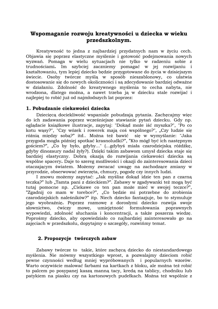 Wspomaganie rozwoju kreatywności u dziecka w wieku przedszkolnym. Kreatywność to jedna z najbardziej przydatnych nam w życiu cech. Objawia się poprzez elastyczne myślenie i gotowość podejmowania nowych wyzwań. Pomaga w wielu sytuacjach nie tylko w radzeniu sobie z trudnościami. Im szybciej zaczniemy pomagać w jej rozwijaniu i kształtowaniu, tym lepiej dziecko będzie przygotowane do życia w dzisiejszym świecie. Osoby twórcze myślą w sposób nieszablonowy, co ułatwia dostosowanie się do nowych okoliczności i są zdecydowanie bardziej odważne w działaniu. Zdolność do kreatywnego myślenia to cecha nabyta, nie wrodzona, dlatego można, a nawet trzeba ją w dziecku stale rozwijać i najlepiej to robić już od najmłodszych lat poprzez: 1. Pobudzanie ciekawości dziecka Dziecięcą dociekliwość wspaniale pobudzają pytania. Zachęcajmy więc do ich zadawania poprzez wcześniejsze stawianie pytań dziecku. Gdy np. oglądacie książkowe ilustracje, zapytaj: "Dokąd może iść myszka?", "Po co kotu wąsy?", "Czy wózek i rowerek mają coś wspólnego?", „Czy ludzie się różnią między sobą?” itd.. Można też bawić się w wymyślanie: "Jaka przygoda mogła później spotkać krasnoludki?”, ”Kto mógł być ich następnym gościem?”, „Co by było, gdyby..." (...gdybyś miała czarodziejską różdżkę, gdyby dinozaury nadal żyły?). Dzięki takim zabawom umysł dziecka staje się bardziej elastyczny. Dobrą okazją do rozwijania ciekawości dziecka są wspólne spacery. Daje to szereg możliwości i okazji do zainteresowania dzieci otaczającym światem. Możemy zwracać uwagę na zachodzące zmiany w przyrodzie, obserwować zwierzęta, chmury, pogodę czy innych ludzi. I znowu możemy zapytać: „Jak myślisz dokąd idzie ten pan z czarną teczką?” lub „Tamta pani z dzieckiem?”. Zabawy w zgadywanki też mogą być tutaj pomocne np. „Ciekawe co ten pan może mieć w swojej teczce?”, ”Zgadnij co mam w torebce?”, „Co będzie mi potrzebne do zrobienia czarodziejskich naleśników?” itp. Niech dziecko fantazjuje, bo to stymuluje jego wyobraźnię. Poprzez rozmowę z dorosłymi dziecko rozwija swoje słownictwo, ćwiczy mowę, umiejętność formułowania poprawnych wypowiedzi, zdolność słuchania i koncentracji, a także poszerza wiedzę. Poprośmy dziecko, aby opowiedziało co najbardziej zainteresowało go na zajęciach w przedszkolu, dopytajmy o szczegóły, rozwińmy temat. 2. Propozycje twórczych zabaw Zabawy twórcze to takie, które zachęcą dziecko do niestandardowego myślenia. Nie mówmy wszystkiego wprost, a pozwalajmy dzieciom robić pewne czynności według mniej wypróbowanych i popularnych wzorów. Warto oczywiście malować farbami na kartkach z bloku, ale można też robić to palcem po posypanej kaszą manną tacy, kredą na tablicy, chodniku lub patykiem na piasku czy na kartonowych pudełkach. Można też wspólnie z dzieckiem wykonać ubrania z gazet albo z foliowych worków, a z nawleczonego na nitkę makaronu, guzików czy chrupek - korale. Ćwicząc oryginalne podejście do różnych spraw, dziecko uczy się inaczej patrzeć na otoczenie, dzięki czemu w przyszłości łatwiej mu będzie szukać nowych rozwiązań oraz lepiej sobie potem poradzi w sytuacji napotykania trudności. Tego typu działania pomagają również rozwijać u dziecka samodzielność, co umożliwi jego dalszy rozwój umiejętności w tym także własną zaradność. Innym przykładem twórczej zabawy może być lepienie lub wyklejanie obrazków plasteliną Jest to jeden z najlepszych sposobów ćwiczenia rąk i doskonały materiał na rozwijanie motoryki. Plastelina pozwala nawet najmniejszym paluszkom kształtować przeróżne kształty i figury. Można także pokazać dziecku, jak zrobić kolorową wydzierankę w oparciu o jego rysunek np. samochodu czy sałatki warzywnej i to również rozwinie sprawność jego obu rąk. Chwil pełnych różnych inspiracji może dostarczy również wspólne ozdabianie kruchych ciasteczek, tworzenie ciekawie wyglądających kanapek zrobionych z buziek powstałych z owoców bądź warzyw. W sklepach i reklamach dla dzieci jest dzisiaj mnóstwo zabawek które same jeżdżą, śpiewają, poruszają się, mruczą i robią wiele innych przyciągających uwagę rzeczy. Tym samym ograniczają one twórcze myślenie oraz zabawę ponieważ dziecko może się nimi bawić w określony narzucony przez producenta sposób. Zdecydowanie korzystniej jest, gdy dziecko samo wymyśla, w jakie dźwięki będzie wydawał jego dinozaur czy samochód, co zbuduje z klocków bez użycia wzoru lub według własnego projektu zbuduje domek dla lalek. Rynek pomocy i zabawek dla dzieci stwarza dziś szereg różnych możliwości. W związku z tym dorośli są w stanie zapewnić dziecku gry i zabawy, które pomagają w rozwijaniu jego kreatywności. Wszystko zależy od wieku i predyspozycji dziecka. Jeżeli chodzi o zabawy, należy wybierać takie, które skłonią nasze dziecko do myślenia. Pomocą mogą tutaj być różnego rodzaju gry edukacyjne i logiczne, przez co naukę połączymy z dobrą zabawą. Są to wszelkiego rodzaju puzzle, gry, układanki, labirynty, dzięki którym dziecko uczy się rozwiązywania problemów. Zdolności poznawcze dzieci odkryją i będą rozwijały również za pomocą różnego rodzaju zabaw tematycznych np. "w sklep", "w lekarza", "w kucharza" itd. W takich zabawach dzieci naśladują postacie poznawane podczas czytania opowiadań, oglądania teatrzyków bądź filmów. Będą to najczęściej bohaterowie o cechach pozytywnych: dobrzy, opiekuńczy, sympatyczni, odważni. Takie zabawy są bardzo popularne wśród dzieci przedszkolnych i wczesnoszkolnych dlatego też można to doskonale wykorzystać do rozwijania kreatywności podopiecznych także w domu. Możliwość wcielania się w różne postaci daje wiele okazji do twórczych inspiracji, a także pobudza dziecięce marzenia. Dziecko może 