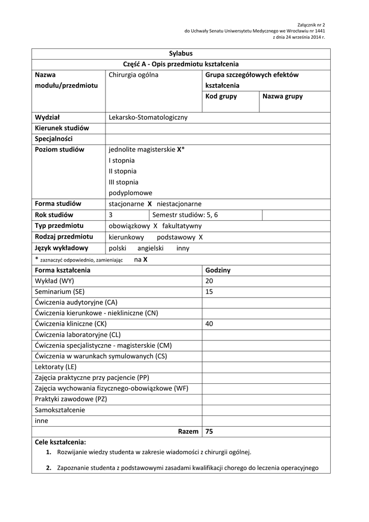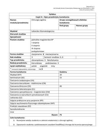 Załącznik nr 2 do Uchwały Senatu Uniwersytetu Medycznego we Wrocławiu nr 1441 z dnia 24 września 2014 r. Nazwa modułu/przedmiotu Wydział Kierunek studiów Specjalności Poziom studiów Forma studiów Rok studiów Typ przedmiotu Rodzaj przedmiotu Język wykładowy Sylabus Część A - Opis przedmiotu kształcenia Chirurgia ogólna Grupa szczegółowych efektów kształcenia Kod grupy Nazwa grupy Lekarsko-Stomatologiczny jednolite magisterskie X* I stopnia II stopnia III stopnia podyplomowe stacjonarne X niestacjonarne 3 Semestr studiów: 5, 6 obowiązkowy X fakultatywny podstawowy X kierunkowy angielski inny polski * zaznaczyć odpowiednio, zamieniając na X Forma kształcenia Wykład (WY) Seminarium (SE) Ćwiczenia audytoryjne (CA) Ćwiczenia kierunkowe - niekliniczne (CN) Ćwiczenia kliniczne (CK) Ćwiczenia laboratoryjne (CL) Ćwiczenia specjalistyczne - magisterskie (CM) Ćwiczenia w warunkach symulowanych (CS) Lektoraty (LE) Zajęcia praktyczne przy pacjencie (PP) Zajęcia wychowania fizycznego-obowiązkowe (WF) Praktyki zawodowe (PZ) Samokształcenie inne Razem Cele kształcenia: Godziny 20 15 40 75 1. Rozwijanie wiedzy studenta w zakresie wiadomości z chirurgii ogólnej. 2. Zapoznanie studenta z podstawowymi zasadami kwalifikacji chorego do leczenia operacyjnego oraz zasadami przygotowania pacjenta do operacji. 3. Wyszkolenie studenta w zakresie praktycznych umiejętności wykonywania czynności i zabiegów chirurgicznych. 4. Przygotowanie studenta do wypełniania i prowadzenia dokumentacji medycznej w świetle obowiązujących przepisów Macierz efektów kształcenia dla modułu/przedmiotu w odniesieniu do metod weryfikacji zamierzonych efektów kształcenia oraz formy realizacji zajęć: Numer efektu kształcenia przedmiotowego W 01 opisuje różnicuje diagnozuje kwalifikuje leczy zapobiega Odpowiedź ustna, pisemna, dyskusja CK, SE, WY wypełnia bada zakłada zaopatruje szyje bandażuje Odpowiedź ustna, prezentacja umiejętności CK współpracuje objaśnia Odpowiedź ustna, CK VI-F VI-F E.U3. E.U4. E.U17. E.U20. K 01 Forma zajęć dydaktycznych Student, który zaliczy moduł/przedmiot wie/umie/potrafi E.W20. E.U1. E.U2. U 01 Metody weryfikacji osiągnięcia zamierzonych efektów kształcenia (formujące i podsumowujące) Numer efektu kształcenia kierunkowego VI-F ** wpisz symbol D.W5. tworzy dyskusja D.U3. D.W13. ** WY - wykład; SE - seminarium; CA - ćwiczenia audytoryjne; CN - ćwiczenia kierunkowe (niekliniczne); CK - ćwiczenia kliniczne; CL -ćwiczenia laboratoryjne; CM – ćwiczenia specjalistyczne (mgr); CS - ćwiczenia w warunkach symulowanych; LE - lektoraty; zajęcia praktyczne przy pacjencie - PP; WF - zajęcia wychowania fizycznego (obowiązkowe); PZ- praktyki zawodowe; SK samokształcenie Proszę oznaczyć krzyżykami w skali 1-3 jak powyższe efekty lokują państwa zajęcia w działach: przekaz wiedzy, umiejętności czy kształtowanie postaw np.: Wiedza + + Umiejętności + + Postawy ++ Nakład pracy studenta (bilans punktów ECTS): Forma nakładu pracy studenta Obciążenie studenta (h) (udział w zajęciach, aktywność, przygotowanie sprawdzenie, itp.) 1. Godziny kontaktowe 75 2. Czas pracy własnej studenta 75 Sumaryczne obciążenie pracy studenta 150 Punkty ECTS za moduł/przedmiotu 6 Uwagi Treść zajęć: (proszę wpisać hasłowo tematykę poszczególnych zajęć z podziałem na formę zajęć dydaktycznych, pamiętając, aby przekładała się ona na zamierzone efekty kształcenia) 1. Typowe schorzenia chirurgiczne: patofizjologia, rozpoznanie, postępowanie 2. Przygotowanie pacjenta i zespołu do zabiegu: aseptyka, antyseptyka, ambulatorium, odział, blok operacyjny 3. Podstawowe zabiegi chirurgiczne – zajęcia praktyczne Wykłady 1. Krwawienia i wstrząs 2. Chirurgia małoinwazyjna 3. Chirurgia urazowa 4. Leczenie ran 5. Nowotwory – zagadnienia ogólne, leczenie chirurgiczne i uzupełniające 6. Chirurgia tętnic i żył 7. Nowotwory. Zasady postępowania 8. Choroby przełyku i żołądka 9. Rak żołądka. Rak jelita grubego i odbytu 10. Choroby wątroby i trzustki wymagające leczenia chirurgicznego 11. Endoskopia 12. Chirurgia endokrynologiczna 13. Podstawy proktologii Seminaria 1. Aseptyka i antyseptyka 2. Zakażenia chirurgiczne. Zakażenia miejsca operowanego - czynniki ryzyka, profilaktyka i leczenie 3. Zasady badania przedmiotowego pacjenta i wywiadu w aspekcie chirurgicznym. Przygotowanie pacjenta i zespołu chirurgicznego do operacji. 4. Teoretyczne zasady podstawowych zabiegów przy łóżku chorego: zmiana opatrunków, zdejmowania szwów, usuwania drenów, cewnikowania pęcherza moczowego, zakładania sondy żołądkowej 5. Nagłe stany w chirurgii (najczęstsze przyczyny pochodzenia zewnętrznego i wewnętrznego, objawy, diagnostyka, strategia postępowania, wskazania do leczenia operacyjnego 6. Urazy narządu ruchu 7. Urazy jamy brzusznej 8. Urazy głowy 9. Urazy klatki piersiowej 10. Ostry brzuch i zakażenia wewnątrzbrzuszne 11. Chirurgia małoinwazyjna (zasady laparoskopii i chirurgii endoskopowej, rodzaje wykonywanych zabiegów) 12. Chirurgia i diagnostyka proktologiczna 13. Podstawy chirurgicznego leczenia chorób endokrynologicznych 14. Chirurgia naczyniowa 15. Powtórzenie i odrabianie zajęć Ćwiczenia 1. ZAJĘCIA ORGANIZACYJNE. ZAPOZNANIE SIĘ Z ZAKRESEM SPECJALNOŚCI CHIRURGICZNYCH ASEPTKA I ANTYSEPTYKA W CHIRURGII. WIZYTA W CENTRALNEJ STERYLIZATORNII 2. 3. SPECYFIKA PRACY CHIRURGA. WIZYTA NA ODDZIALE I W PORADNIACH 4. 5. 6. 7. 8. 9. 10. 11. 12. 13. 14. 15. 16. 17. 18. 19. 20. 21. 22. 23. 24. 25. 26. 27. 28. 29. 30. 31. 32. 33. 34. 35. 36. 37. 38. 39. 40. Inne 1. 2. 3. PRZYGOTOWANIE ZESPOŁU CHIRURGICZNEGO I CHOREGO DO OPERACJI. ĆWICZENIA Z MYCIA DO ZABIEGU, BLOK OPERACYJNY NARZĘDZIA CHIRURGICZNE, DEMONSTARCJA NARZĘDZI CHIRURGICZNE BADANIE CHOREGO - WYWIAD, BADANIE PRZEDMIOTOWE, DOKUMENTACJA MEDYCZNA PODSTAWOWE RODZAJE NICI I WĘZŁÓW W CHIRURGII. SZYCIE RAN – ZAJECIA PRAKTYCZNE CHIRURGIA PRZEWODU POKAR