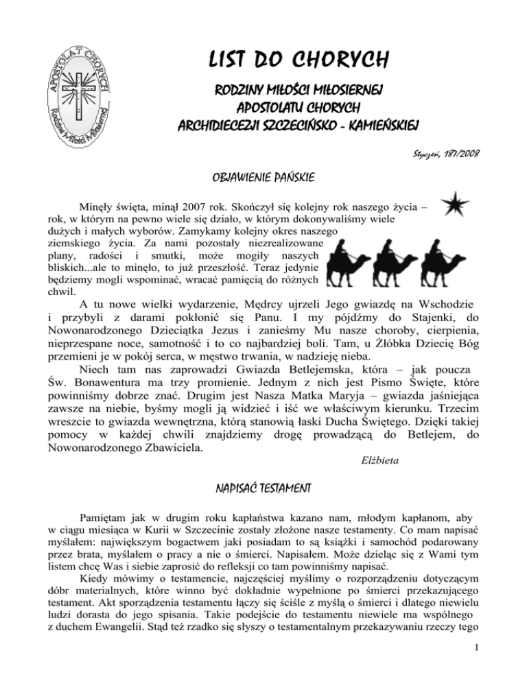 LIST DO CHORYCH RODZINY MIŁOŚCI MIŁOSIERNEJ APOSTOLATU CHORYCH ARCHIDIECEZJI SZCZECIŃSKO - KAMIEŃSKIEJ Styczeń, 187/2008 OBJAWIENIE PAŃSKIE Minęły święta, minął 2007 rok. Skończył się kolejny rok naszego życia – rok, w którym na pewno wiele się działo, w którym dokonywaliśmy wiele dużych i małych wyborów. Zamykamy kolejny okres naszego ziemskiego życia. Za nami pozostały niezrealizowane plany, radości i smutki, może mogiły naszych bliskich...ale to minęło, to już przeszłość. Teraz jedynie będziemy mogli wspominać, wracać pamięcią do różnych chwil. A tu nowe wielki wydarzenie, Mędrcy ujrzeli Jego gwiazdę na Wschodzie i przybyli z darami pokłonić się Panu. I my pójdźmy do Stajenki, do Nowonarodzonego Dzieciątka Jezus i zanieśmy Mu nasze choroby, cierpienia, nieprzespane noce, samotność i to co najbardziej boli. Tam, u Żłóbka Dziecię Bóg przemieni je w pokój serca, w męstwo trwania, w nadzieję nieba. Niech tam nas zaprowadzi Gwiazda Betlejemska, która – jak poucza Św. Bonawentura ma trzy promienie. Jednym z nich jest Pismo Święte, które powinniśmy dobrze znać. Drugim jest Nasza Matka Maryja – gwiazda jaśniejąca zawsze na niebie, byśmy mogli ją widzieć i iść we właściwym kierunku. Trzecim wreszcie to gwiazda wewnętrzna, którą stanowią łaski Ducha Świętego. Dzięki takiej pomocy w każdej chwili znajdziemy drogę prowadzącą do Betlejem, do Nowonarodzonego Zbawiciela. Elżbieta NAPISAĆ TESTAMENT Pamiętam jak w drugim roku kapłaństwa kazano nam, młodym kapłanom, aby w ciągu miesiąca w Kurii w Szczecinie zostały złożone nasze testamenty. Co mam napisać myślałem: największym bogactwem jaki posiadam to są książki i samochód podarowany przez brata, myślałem o pracy a nie o śmierci. Napisałem. Może dzieląc się z Wami tym listem chcę Was i siebie zaprosić do refleksji co tam powinniśmy napisać. Kiedy mówimy o testamencie, najczęściej myślimy o rozporządzeniu dotyczącym dóbr materialnych, które winno być dokładnie wypełnione po śmierci przekazującego testament. Akt sporządzenia testamentu łączy się ściśle z myślą o śmierci i dlatego niewielu ludzi dorasta do jego spisania. Takie podejście do testamentu niewiele ma wspólnego z duchem Ewangelii. Stąd też rzadko się słyszy o testamentalnym przekazywaniu rzeczy tego 1 świata przez świętych. Ma to najczęściej miejsce, gdy umiera bardzo bogaty święty, ale nawet wtedy znacznie więcej mówi się o ich testamentach duchowych. Sam Jezus uczy nas na krzyżu, jak ma wyglądać testament. Wcześniej wyrzekł się wszystkiego, w ostatnich godzinach oddał nawet swoją szatę, a na krzyżu Matkę przekazuje w ręce św. Jana. Doskonałym Jego naśladowcą był św. Paweł. Swój testament pisał w więziennej celi, czekając na wykonanie wyroku śmierci. Był świadom kresu życia. „Krew moja już ma być wylana na ofiarę, a chwila mojej rozłąki nadeszła”. W tej sytuacji rzuca okiem na całość swojego życia. Podsumowuje je w jednym, ale jakże pięknym zdaniu: „W dobrych zawodach wystąpiłem, bieg ukończyłem, wiary ustrzegłem”. Można pozazdrościć takiej oceny wielu lat trudu. Zastanawia fakt, że Paweł świadom zbliżania się do bramy nieba, jakby sprawdza, czy ma ze sobą klucz do tej bramy – wiarę. On wie, że ustrzeżenie wiary to główne zadanie chrześcijanina. Po takim podsumowaniu czeka tylko na spotkanie z Sędzią zawodów, w jakich uczestniczył i na olimpijski laur. „Na ostatek odłożono dla mnie wieniec sprawiedliwości, który mi w owym dniu odda Pan, sprawiedliwy Sędzia”. Ma jeszcze kilka spraw do załatwienia. Wzywa więc Tymoteusza do spiesznego przybycia do niego i prosi, aby ten wziął ze sobą Marka. Chodzi tu prawdopodobnie o Ewangelistę, z którym współpraca nie zawsze układała mu się pomyślnie. Prosi go również o przywiezienie płaszcza oraz ksiąg, zwłaszcza cennych pergaminów. Wzruszający jest fragment, w którym imiennie wymienia tych, którzy zdradzili Ewangelię, zerwali z Kościołem i są jego wrogami. Przestrzega Tymoteusza, by miał się przed nimi na baczności. Jego oczy są jednak utkwione już w Chrystusie. Opuszczony przez wielu ludzi, nigdy nie został opuszczony przez Pana. Kończy więc swój testament aktem radosnej nadziei: „Wyrwie mnie Pan od wszelkiego złego czynu i wybawi mnie, przyjmując do swego królestwa niebieskiego; Jemu chwała na wieki wieków! Amen”. Oto klasyczne podejście chrześcijanina do testamentu. Chodzi w nim o radosne spojrzenie na całość życia, o dziękczynienie za łaskę wiary i opatrzność, jaką Bóg nas otacza. Chodzi o najważniejszą przestrogę, jaką pragniemy przekazać swoim bliskim. Testament zawsze ujawnia, co było skarbem dla danego człowieka. Chce on bowiem, by ten właśnie skarb został w rękach pozostających na ziemi. Sporządzenie testamentu jest znakiem dojrzałości danego człowieka. Już sam fakt jego spisania jest dowodem odważnego liczenia się z możliwością odejścia z tego świata. Treść zaś testamentu świadczy o tym, co jest dla danego człowieka skarbem i z czym zostawia swoich spadkobierców. Jezus tak jasno powiedział: „Gdzie skarb twój, tam i serce twoje będzie”. Testament mówi o skarbie życia człowieka i o bogactwie jego serca. Ojciec święty Jan Paweł II daje nam i w tych sprawach piękny przykład. Po każdych rekolekcjach wielkopostnych uzupełniał swój testament. Może i w tym powinniśmy go naśladować. Serdecznie pozdrawiam znad naszego polskiego pięknego morza. ks. Stanisław Krzyżanowski WSPOMNIENIA WCIĄŻ TRWAJĄ... PRZEŻYCIA NA TEMAT ŚWIĄT BOŻEGO NARODZENIA W PRACY MISYJNEJ Zapraszam do refleksji nad wspomnieniami Bożonarodzeniowymi, jakimi podzielił się z nami ks. Tadeusz Baniowski, który pracował 34 lata w krajach misyjnych. 2 Wigilia Bożego Narodzenia z opłatkiem jest jedną z najpiękniejszych polskich t
