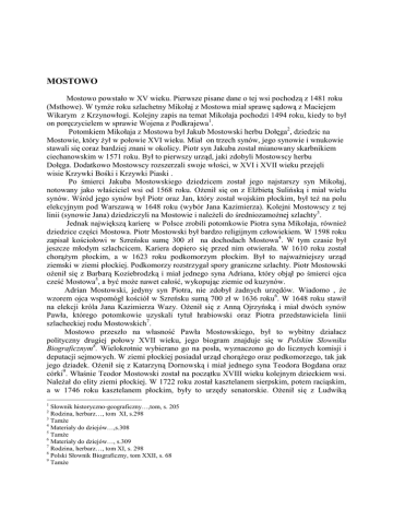 MOSTOWO Mostowo powstało w XV wieku. Pierwsze pisane dane o tej wsi pochodzą z 1481 roku (Msthowe). W tymże roku szlachetny Mikołaj z Mostowa miał sprawę sądową z Maciejem Wikarym z Krzynowłogi. Kolejny zapis na temat Mikołaja pochodzi 1494 roku, kiedy to był on poręczycielem w sprawie Wojena z Podkrajewa1. Potomkiem Mikołaja z Mostowa był Jakub Mostowski herbu Dołęga2, dziedzic na Mostowie, który żył w połowie XVI wieku. Miał on trzech synów, jego synowie i wnukowie stawali się coraz bardziej znani w okolicy. Piotr syn Jakuba został mianowany skarbnikiem ciechanowskim w 1571 roku. Był to pierwszy urząd, jaki zdobyli Mostowscy herbu Dołęga. Dodatkowo Mostowscy rozszerzali swoje włości, w XVI i XVII wieku przejęli wisie Krzywki Bośki i Krzywki Piaski . Po śmierci Jakuba Mostowskiego dziedzicem został jego najstarszy syn Mikołaj, notowany jako właściciel wsi od 1568 roku. Ożenił się on z Elżbietą Sulińską i miał wielu synów. Wśród jego synów był Piotr oraz Jan, który został wojskim płockim, był też na polu elekcyjnym pod Warszawą w 1648 roku (wybór Jana Kazimierza). Kolejni Mostowscy z tej linii (synowie Jana) dziedziczyli na Mostowie i należeli do średniozamożnej szlachty3. Jednak największą karierę w Polsce zrobili potomkowie Piotra syna Mikołaja, również dziedzice części Mostowa. Piotr Mostowski był bardzo religijnym człowiekiem. W 1598 roku zapisał kościołowi w Szreńsku sumę 300 zł na dochodach Mostowa4. W tym czasie był jeszcze młodym szlachcicem. Kariera dopiero się przed nim otwierała. W 1610 roku został chorążym płockim, a w 1623 roku podkomorzym płockim. Był to najważniejszy urząd ziemski w ziemi płockiej. Podkomorzy rozstrzygał spory graniczne szlachty. Piotr Mostowski ożenił się z Barbarą Koziebrodzką i miał jednego syna Adriana, który objął po śmierci ojca cześć Mostowa5, a być może nawet całość, wykopując ziemie od kuzynów. Adrian Mostowski, jedyny syn Piotra, nie zdobył żadnych urzędów. Wiadomo , że wzorem ojca wspomógł kościół w Szreńsku sumą 700 zł w 1636 roku6. W 1648 roku stawił na elekcji króla Jana Kazimierza Wazy. Ożenił się z Anną Ojrzyńską i miał dwóch synów Pawła, którego potomkowie uzyskali tytuł hrabiowski oraz Piotra przedstawiciela linii szlacheckiej rodu Mostowskich7. Mostowo przeszło na własność Pawła Mostowskiego, był to wybitny działacz polityczny drugiej połowy XVII wieku, jego biogram znajduje się w Polskim Słowniku Biograficznym8. Wielokrotnie wybierano go na posła, wyznaczono go do licznych komisji i deputacji sejmowych. W ziemi płockiej posiadał urząd chorążego oraz podkomorzego, tak jak jego dziadek. Ożenił się z Katarzyną Dornowską i miał jednego syna Teodora Bogdana oraz córki9. Właśnie Teodor Mostowski został na początku XVIII wieku kolejnym dzieckiem wsi. Należał do elity ziemi płockiej. W 1722 roku został kasztelanem sierpskim, potem raciąskim, a w 1746 roku kasztelanem płockim, były to urzędy senatorskie. Ożenił się z Ludwiką 1 Słownik historyczno-geograficzny…,tom, s. 205 Rodzina, herbarz…, tom XI, s.298 3 Tamże 4 Materiały do dziejów…,s.308 5 Tamże 6 Materiały do dziejów…, s.309 7 Rodzina, herbarz…, tom XI, s. 298 8 Polski Słownik Biograficzny, tom XXII, s. 68 9 Tamże 2 Kruszyńską, córką kasztelana gdańskiego, miał pięciu synów, wśród nich Pawła – Michała, który odziedziczył Mostowo i wiele innych wsi10. Była to ciekawa postać swoich czasów. Paweł Mostowski (1721-1781) był człowiekiem niezwykle gwałtownym i ambitnym. „ w mowie, piśmie i uczynkach bardzo nieskrupulatny, miał życie pełne kłótni i procesów”. Karierę zaczynał jako oficer w wojsku polskim (wystarczyło dobrze zapłacić, im wyższy stopień ty więcej). W latach czterdziestych XVIII wieku przyłączył się do stronników Familii (Czartoryskich) i dzięki temu uzyskał urząd wojewody pomorskiego (zapłacił za to 12 000 dukatów). Rządził na Pomorzu (Prusy Królewskie) twardą ręką przez co skłócił się z miejscową szlachtą. Jego działalność na Pomorzu zaniepokoiła króla Stanisława Augusta Poniatowskiego i żeby nie urazić jego ambicji przeniósł Mostowskiego na urząd wojewody mazowieckiego (dzięki sprytowi Mostowski zarobił na zamianie 16 000 dukatów). Mostowski z czasem jednak zmienił front, przestał popierać króla oraz Familię i związał się z konfederacją barską, która zbrojnie walczyła z siłami królewskimi i Rosjanami. Należał do władz konfederacji. Panował zamordowanie króla. Wobec klęsk konfederatów musiał wyjechać za granicę. Jego liczne dobra, w tym zapewne i Mostowo, zostały złupione. Mostowski kupił dwór pod Paryżem i zaczął nazywać się księciem. W czasie rewolucji Amerykańskiej wysłał do kongresu memoriał tytułując się księciem w którym proponował utworzenie a Ameryce „hrabstwa Mostów” i wysłanie tam polskich osadników, tworzących odrębne państwo „Nowa Polska” w zamian wysłał do władz amerykańskich cudowny balsam leczący rany żołnierzy. Ten nieszczęsny polityk zmarł w Paryżu w 1781 roku11. Po jego śmierci dobra w Polsce odziedziczyli jego synowie: Józef i Tadeusz, którzy mieli większe poczucie rzeczywistości i odegrali bardzo 10 11 Rodzina, herbarz…, tom XI, s.298 Polski słownik Biograficzny, tom XXII, s. 73-77 i 67-68