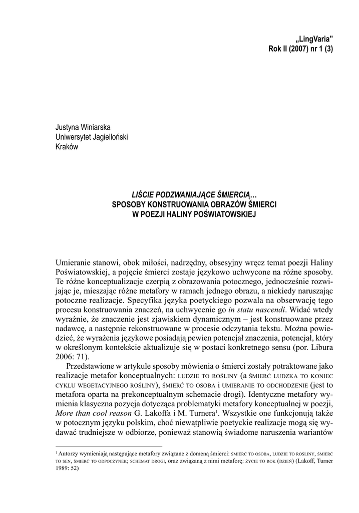 „LingVaria” Rok II (2007) nr 1 (3) Justyna Winiarska Uniwersytet Jagielloński Kraków LIŚCIE PODZWANIAJĄCE ŚMIERCIĄ… SPOSOBY KONSTRUOWANIA OBRAZÓW ŚMIERCI W POEZJI HALINY POŚWIATOWSKIEJ Umieranie stanowi, obok miłości, nadrzędny, obsesyjny wręcz temat poezji Haliny Poświatowskiej, a pojęcie śmierci zostaje językowo uchwycone na różne sposoby. Te różne konceptualizacje czerpią z obrazowania potocznego, jednocześnie rozwijając je, mieszając różne metafory w ramach jednego obrazu, a niekiedy naruszając potoczne realizacje. Specyfika języka poetyckiego pozwala na obserwację tego procesu konstruowania znaczeń, na uchwycenie go in statu nascendi. Widać wtedy wyraźnie, że znaczenie jest zjawiskiem dynamicznym – jest konstruowane przez nadawcę, a następnie rekonstruowane w procesie odczytania tekstu. Można powiedzieć, że wyrażenia językowe posiadają pewien potencjał znaczenia, potencjał, który w określonym kontekście aktualizuje się w postaci konkretnego sensu (por. Libura 2006: 71). Przedstawione w artykule sposoby mówienia o śmierci zostały potraktowane jako realizacje metafor konceptualnych: LUDZIE TO ROŚLINY (a ŚMIERĆ LUDZKA TO KONIEC CYKLU WEGETACYJNEGO ROŚLINY), ŚMIERĆ TO OSOBA i UMIERANIE TO ODCHODZENIE (jest to metafora oparta na prekonceptualnym schemacie drogi). Identyczne metafory wymienia klasyczna pozycja dotycząca problematyki metafory konceptualnej w poezji, More than cool reason G. Lakoffa i M. Turnera1. Wszystkie one funkcjonują także w potocznym języku polskim, choć niewątpliwie poetyckie realizacje mogą się wydawać trudniejsze w odbiorze, ponieważ stanowią świadome naruszenia wariantów Autorzy wymieniają następujące metafory związane z domeną śmierci: ŚMIERĆ TO OSOBA, LUDZIE TO ROŚLINY, ŚMIERĆ oraz związaną z nimi metaforę: ŻYCIE TO ROK (DZIEŃ) (Lakoff, Turner 1989: 52) 1 TO SEN, ŚMIERĆ TO ODPOCZYNEK; SCHEMAT DROGI, 68 JUSTYNA WINIARSKA konwencjonalnych, a zatem wymagają również świadomego interpretacyjnego wysiłku ze strony odbiorcy. Analizując sposoby językowego ujmowania pojęcia śmierci (umierania), trzeba pamiętać, że dysponujemy także niezmetaforyzowaną wiedzą na temat tego zjawiska. Śmierć, jak wiele innych pojęć, jest rozumiana częściowo metaforycznie a częściowo niemetaforycznie. Z doświadczenia wiemy zatem, że człowiek, który nie żyje, nie rusza się i nie oddycha, a jego ciało staje się zimne i blade. Takie osadzone w doświadczeniu przedstawienie zmarłego pojawia się także w wierszach Poświatowskiej. Podobnie jednak jak w języku potocznym, staje się ono punktem wyjścia metaforycznych konceptualizacji, przy czym metaforyzacja bądź inne zabiegi nie powinny naruszać wstępnej, zakotwiczonej w doświadczeniu wiedzy2. Jak zatem odbywa się przejście od ujęć konkretnych do metaforycznych, a w obrębie tych ostatnich – od metafor obecnych w języku potocznym do tzw. metafor poetyckich? Zacznijmy od jednego z częstych zabiegów – personifikacji. Miejsce dla niej otwiera podstawowy dla naszego ujmowania rzeczywistości zabieg – mianowicie ontologizacja3. Oprócz czasownika umierać, nazywającego proces, funkcjonuje w języku polskim rzeczownik śmierć, oznaczający ustanie czynności życiowych lub chwilę, w której człowiek umiera. Ujęcie omawianego zjawiska jako bytu umożliwia wprowadzenie go w pozycji agensa do metafory WYDARZENIA TO DZIAŁANIA4. Zgodnie z tą metaforą wydarzenie może być postrzegane jako czyjeś działanie. W wypadku metaforycznej konceptualizacji umierania spersonifikowana śmierć wypełnia pozycję wykonawcy czynności, natomiast ten, kto umiera zostaje potraktowany jako pacjens. Metafora ta realizowana jest przez wyrażenia śmierć przychodzi, śmierć kogoś zabiera, które stanowią podstawę rozszerzeń i poetyckich wariantów, nie całkowicie wszakże dowolnych, bo ograniczonych w polszczyźnie gramatycznym rodzajem żeńskim rzeczownika śmierć (por. jednak angielski rzeczownik death, któremu konwencjonalnie przypisuje się rodzaj męski, lub niemiecki der Tod). Zauważmy, że postrzeganie śmierci jako agensa może wydawać się sprzeczne z inną częstą metaforą, nawiązującą do schematu drogi: UMIERANIE TO ODCHODZENIE (ktoś odszedł). Trzeba jednak pamiętać, że po pierwsze konceptualizacje danej domeny nie muszą być wzajemnie spójne (pozwala to na uchwycenie różnych aspektów rzeczywistości), a po drugie traktowanie śmierci jako agensa znajduje umotywowanie w potocznym doświadczeniu, zgodnie z którym zakończenie życia często postrzegane jest jako akt niedobrowolny (stąd nie dziwi pełnienie przez umierającego funkcji obiektu czynności). Poszczególnym elementom wspomnianego tu schematu prekonceptualnego poświęcimy więcej uwagi w dalszej części artykułu, przytaczając przykłady ich realizacji. 2 Mówią o tym: zasada inwariancji Lakoffa (1990) i zasada topologii funkcjonująca w ramach tzw. teorii stapiania Fauconniera i Turnera (Lewandowska-Tomaszczyk 2006). 3 Wykorzystanie metafory ontologicznej pozwalającej postrzegać procesy i jakości jako byty Szwedek proponował nazwać subiektyfikacją (2002), trzeba jednak zrezygnować z tego dogodnego moim zdaniem terminu z powodu wprowadzenia go jako polskiego odpowiednika Langackerowskiego „subiectivity” oznaczającego stopień upodmiotowienia wypowiedzi (Langacker 2005). 4 Lakoff i Turner określają ją mianem „generic-level metaphor”, wskazując w ten sposób na wysoki stopień jej schematyczności oraz specyficzną relację między domenami: domena docelowa zawiera w sobie domenę źródłową. LIŚCIE PODZWANIAJĄCE ŚMIERCIĄ… 69 Oprócz personifikacji domeną często wykorzystywaną w metaforyzowaniu śmierci jest cykl rozwojowy świata roślinnego. To obszar szczególnie bliski Halinie Poświatowskiej. Podstawę przeniesień stanowi tu dostrzeżenie podobieństwa między fazami życia roślin (l