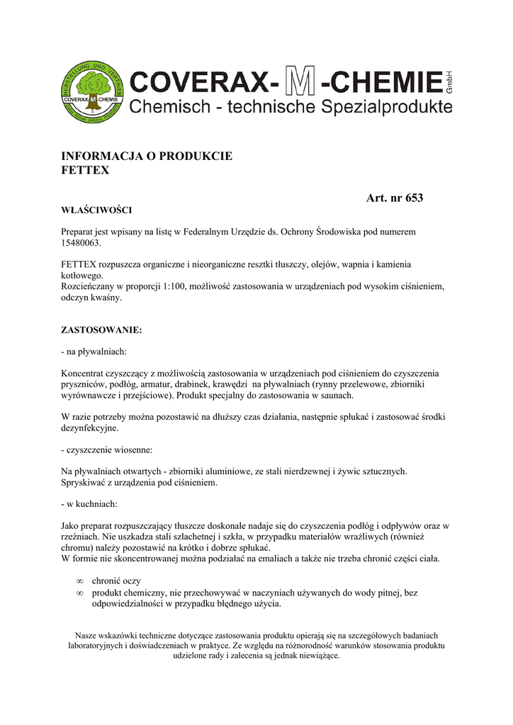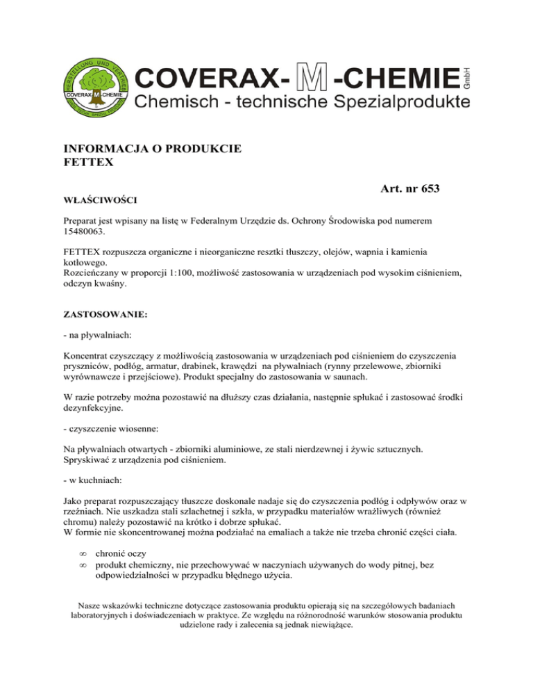INFORMACJA O PRODUKCIE FETTEX Art. nr 653 WŁAŚCIWOŚCI Preparat jest wpisany na listę w Federalnym Urzędzie ds. Ochrony Środowiska pod numerem 15480063. FETTEX rozpuszcza organiczne i nieorganiczne resztki tłuszczy, olejów, wapnia i kamienia kotłowego. Rozcieńczany w proporcji 1:100, możliwość zastosowania w urządzeniach pod wysokim ciśnieniem, odczyn kwaśny. ZASTOSOWANIE: - na pływalniach: Koncentrat czyszczący z możliwością zastosowania w urządzeniach pod ciśnieniem do czyszczenia pryszniców, podłóg, armatur, drabinek, krawędzi na pływalniach (rynny przelewowe, zbiorniki wyrównawcze i przejściowe). Produkt specjalny do zastosowania w saunach. W razie potrzeby można pozostawić na dłuższy czas działania, następnie spłukać i zastosować środki dezynfekcyjne. - czyszczenie wiosenne: Na pływalniach otwartych - zbiorniki aluminiowe, ze stali nierdzewnej i żywic sztucznych. Spryskiwać z urządzenia pod ciśnieniem. - w kuchniach: Jako preparat rozpuszczający tłuszcze doskonale nadaje się do czyszczenia podłóg i odpływów oraz w rzeźniach. Nie uszkadza stali szlachetnej i szkła, w przypadku materiałów wrażliwych (również chromu) należy pozostawić na krótko i dobrze spłukać. W formie nie skoncentrowanej można podziałać na emaliach a także nie trzeba chronić części ciała. • • chronić oczy produkt chemiczny, nie przechowywać w naczyniach używanych do wody pitnej, bez odpowiedzialności w przypadku błędnego użycia. Nasze wskazówki techniczne dotyczące zastosowania produktu opierają się na szczegółowych badaniach laboratoryjnych i doświadczeniach w praktyce. Ze względu na różnorodność warunków stosowania produktu udzielone rady i zalecenia są jednak niewiążące.