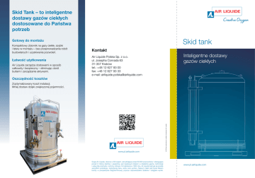 Skid Tank – to inteligentne dostawy gazów ciekłych dostosowane do Państwa potrzeb Skid tank Gotowy do montażu Kompaktowy zbiornik na gazy ciekłe, szybki i łatwy w montażu – bez przeprowadzania robót budowlanych i uzyskiwania pozwoleń. Łatwość użytkowania Air Liquide zarządza dostawami w sposób całkowity i bezpieczny – eliminując obrót butlami i zarządzanie aktywami. Kontakt Inteligentne dostawy gazów ciekłych Air Liquide Polska Sp. z o.o. ul. Josepha Conrada 63 31-357 Kraków tel.: +48 12 627 93 00 fax: +48 12 627 93 33 e-mail: [email protected] Oszczędność kosztów www.pl.airliquide.com Grupa Air Liquide, obecna w 80 krajach, zatrudniająca ponad 50 000 pracowników i obsługująca ponad 2 miliony klientów i pacjentów, jest światowym liderem w dziedzinie gazów, technologii i usług dla przemysłu i ochrony zdrowia. Od założenia w 1902 roku, Air Liquide zajmuje się przede wszystkim produkcją i dystrybucją tlenu, azotu oraz wodoru. Naszym celem jest bycie liderem branży w perspektywie długoterminowej, poprzez odpowiedzialne działanie i osiągane wyniki. ALTOP jest zastrzeżonym znakiem towarowym Air Liquide. Zoptymalizowany koszt instalacji. Mniej dostaw dzięki zwiększonej pojemności. www.pl.airliquide.com WŁAŚCIWOŚCI DOSTAWY GAZU Idealnie dopasowany do Państwa profilu zużycia gazu Kompaktowy zbiornik kriogeniczny: • zintegrowany system magazynowania i dostaw: – zbiornik kriogeniczny, – parownica atmosferyczna, – podstawa (pełniąca rolę fundamentu), • zajmuje mniej niż 4 m2 powierzchni. Air Liquide posiada dsowiadczenie w logistyce gazów ciekłych: • rozległa sieć produkcyjna oraz nowoczesna flota Air Liquide zapewniają niezawodne i elastyczne dostawy gazów ciekłych, • dostawy w ciągu 72 godzin po złożeniu zamówienia. MONTAŻ Szybki i łatwy montaż: 1 dostarczany w całości 2 Dostępny dla gazów: • azot, argon oraz tlen, • kompatybilny z mikserem dynamicznym Air Liquide. Najlepiej dopasowane rozwiązanie w oparciu o ofertę premium Air Liquide: Rozmiar w zależności od potrzeb: • zużycie gazu od 400 do 4000 Nm3/miesiąc • pojemność 3000 l • ciśnienie robocze od 1 do 30 barg • przepływ maksymalny do 100 Nm3/h • zastosowanie: gazowe lub ciekłe LASAL – dla spawania i cięcia laserowego ARCAL – dla spawania i cięcia łukowego ALPHAGAZ – gazy specjalne dla laboratoriów ALIGAL – dla produktów spożywczych (HACCP) FLAMAL – dla spawania i cięcia gazowego TM TM montaż i podłączenie przez Air Liquide 3 gotowy do pierwszego napełnienia Skid tank gotowy do użycia w Państwa zakładzie już w południe! TM TM TM 2,8 m 2 1 1 3 2m Skid tank 3000 l 16 barg (zgodny z PED) 1,6 m Zbiornik 2 Parownica 3 Podstawa Skid tank Air Liquide: bezpieczne i niezawodne dostawy gazów ciekłych