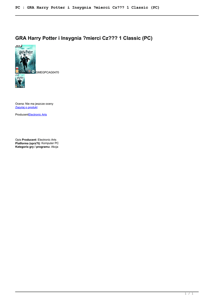 PC : GRA Harry Potter i Insygnia ?mierci Cz??? 1 Classic (PC) GRA Harry Potter i Insygnia ?mierci Cz??? 1 Classic (PC) GMEGPCAG0470 Ocena: Nie ma jeszcze oceny Zapytaj o produkt ProducentElectronic Arts Opis Producent: Electronic Arts Platforma (sprz?t): Komputer PC Kategoria gry / programu: Akcja 1 / 1 Powered by TCPDF (www.tcpdf.org)