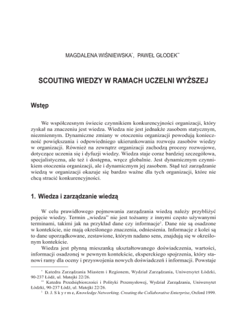 MAGDALENA WIŚNIEWSKA*, PAWEŁ GŁODEK** SCOUTING WIEDZY W RAMACH UCZELNI WYŻSZEJ Wstęp We współczesnym świecie czynnikiem konkurencyjności organizacji, który zyskał na znaczeniu jest wiedza. Wiedza nie jest jednakże zasobem statycznym, niezmiennym. Dynamiczne zmiany w otoczeniu organizacji powodują konieczność powiększania i odpowiedniego ukierunkowania rozwoju zasobów wiedzy w organizacji. Również na zewnątrz organizacji zachodzą procesy rozwojowe, dotyczące uczenia się i dyfuzji wiedzy. Wiedza staje coraz bardziej szczegółowa, specjalistyczna, ale też i dostępna, wręcz globalnie. Jest dynamicznym czynnikiem otoczenia organizacji, ale i dynamicznym jej zasobem. Stąd też zarządzanie wiedzą w organizacji okazuje się bardzo ważne dla tych organizacji, które nie chcą stracić konkurencyjności. 1. Wiedza i zarządzanie wiedzą W celu prawidłowego pojmowania zarządzania wiedzą należy przybliżyć pojęcie wiedzy. Termin „wiedza” nie jest tożsamy z innymi często używanymi terminami, takimi jak na przykład dane czy informacje1. Dane nie są osadzone w kontekście, nie mają określonego znaczenia, odniesienia. Informacje z kolei są to dane uporządkowane, zestawione, którym nadano sens, znajdują się w określonym kontekście. Wiedza jest płynną mieszanką ukształtowanego doświadczenia, wartości, informacji osadzonej w pewnym kontekście, eksperckiego spojrzenia, który stanowi ramy dla oceny i przyswojenia nowych doświadczeń i informacji. Powstaje * Katedra Zarządzania Miastem i Regionem, Wydział Zarządzania, Uniwersytet Łódzki, 90-237 Łódź, ul. Matejki 22/26. ** Katedra Przedsiębiorczości i Polityki Przemysłowej, Wydział Zarządzania, Uniwersytet Łódzki, 90-237 Łódź, ul. Matejki 22/26. 1 D. J. S k y r m e, Knowledge Networking. Creating the Collaborative Enterprise, Oxford 1999. CZĘŚĆ I. UCZELNIANY SCOUTING WIEDZY 12 i wykorzystywana jest w umyśle posiadacza. W organizacji bywa często osadzona w dokumentach, repozytoriach, organizacyjnych rutynach, procesach, praktykach i normach2. Pojęcie wiedzy jest również przez badaczy różnie pojmowane. Niektórzy postrzegają wiedzę jako stan umysłu, definiując ją jako rozumienie i doświadczenie zdobyte podczas studiowania czegoś; sumę lub zakres tego, co jest postrzegane, odkryte albo nauczone3 lub po prostu zakładają, że wiedza to rozumienie4. Definiuje się też wiedzę jako obiekt, a więc rzecz kodyfikowaną, opracowywaną. Przyjmuje się tutaj, że jest ona procesem systematycznego poznawania i stosowania owego poznania5. W literaturze można również spotkać spojrzenie na wiedzę jako na stan posiadania dostępu do informacji czy jako warunek dostępu do nich6. Wiedzę można też rozumieć jako zdolność, potencjał wpływu na działanie7. Przyjęcie określonej perspektywy patrzenia na pojęcie wiedzy implikuje perspektywę rozumienia zarządzania wiedzą i cele owego zarządzania8. Jeśli patrzeć na wiedzę jak na stan umysłu, zarządzanie wiedzą powinno się skupiać na kreowaniu sytuacji, w których mamy do czynienia z potencjalnie użytecznymi informacjami i ułatwianiu przyswajania informacji. Jeśli traktować wiedzę jako obiekt, zarządzanie wiedzą powinno się koncentrować na tworzeniu zasobów wiedzy i zarządzaniu owymi zasobami. Gdyby z kolei przyjąć, że wiedza to proces, zarządzanie wiedzą powinno się skupiać na przepływach wiedzy i procesach jej tworzenia, dzielenia się nią i jej udostępniania. Postrzegając wiedzę jako zdolność, w zarządzaniu wiedzą należy przykładać wagę do kreowania kluczowych kompetencji i rozumienia strategicznej przewagi w formie know-how, a także tworzenia kapitału intelektualnego. Zarządzanie wiedzą można też rozumieć jako proces identyfikacji, zdobywania i pomnażania zbiorowej wiedzy w ramach organizacji w celu podniesienia jej konkurencyjności9. Cel zarządzania wiedzą ma zatem wymiar bardzo praktyczny: T. H. D a v e n p o r t, L. P r u s a k, Working Knowledge. How Organizations Manage What They Know, Massachusetts 1998. 3 P. S c h u b e r t, D. L i n c k e, B. S c h m i d, A Global Knowledge Medium as a Virtual Community: The Net Academy Concept, “Proceedings of the Americas Conference of AIS”, August 1998. 4 R. M c Q u e e n, Four views of Knowledge and Knowledge Management, “Proceedings of the Americas Conference of AIS”, August 1998. 5 M. Z a c k, An Architecture for Managing Explicated Knowledge, “Sloan Management Review”, September 1998. 6 R. M c Q u e e n, op. cit. 7 S. A. C a r l s s o n et al., Gaining Competitive Advantage Through Shared Knowledge Creation: In Search of a New Design Theory For Strategic Information Systems, 4th European Conference on Information Systems, Lisbon 1996. 8 Ibidem. 9 G. v o n K r o u g h, Care in Knowledge Creation, “California Management Review” 1998, Vol. 40, No. 3. 2 Scouting wiedzy w ramach uczelni wyższej 13 poprawić zdolności organizacyjne przez lepsze wykorzystanie indywidualnych oraz zbiorowych zasobów wiedzy w organizacji. Zasoby te obejmują umiejętności, zdolności, doświadczenie, rutynę, normy i technologie10. 2. Komercjalizacja wiedzy z uczelni wyższej Uczelnie wyższe są uczestnikami procesów dzielenia się wiedzą, od dawna ją tworząc i przekazując do szeroko rozumianego otoczenia, głównie w formie publikacji naukowych czy działalności dydaktycznej. Ponadto, w tradycyjnie pojmowanej uczelni wyższej, jeśli posiadało się kontakty ze światem biznesu, zazwyczaj nie były one sformalizowane i polegały głównie na11: –– spotkaniach i dyskusjach w trakcie konferencji, sympozjów oraz targów; –– kontaktach w ramach profesjonalnych stowarzyszeń; –– wykładach gościnnych i konsultacjach; –– przepływie absolwentów, praktykach zawodowych; –– wspólnych publikacjach, studiowaniu literatury specjalistycznej. Taka tradycyjnie rozumiana rola uczelni wyższej jest niewystar