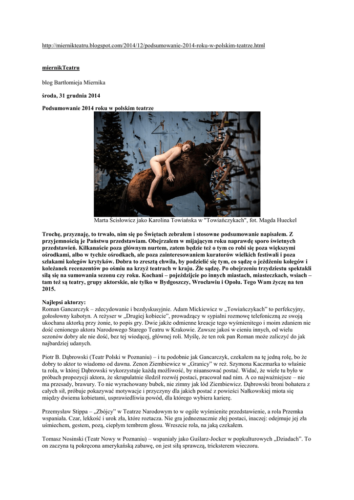 http://miernikteatru.blogspot.com/2014/12/podsumowanie-2014-roku-w-polskim-teatrze.html miernikTeatru blog Bartłomieja Miernika środa, 31 grudnia 2014 Podsumowanie 2014 roku w polskim teatrze Marta Ścisłowicz jako Karolina Towiańska w "Towiańczykach", fot. Magda Hueckel Trochę, przyznaję, to trwało, nim się po Świętach zebrałem i stosowne podsumowanie napisałem. Z przyjemnością je Państwu przedstawiam. Obejrzałem w mijającym roku naprawdę sporo świetnych przedstawień. Kilkanaście poza głównym nurtem, zatem będzie też o tym co robi się poza większymi ośrodkami, albo w tychże ośrodkach, ale poza zainteresowaniem kuratorów wielkich festiwali i poza szlakami kolegów krytyków. Dobra to zresztą chwila, by podzielić się tym, co sądzę o jeżdżeniu kolegów i koleżanek recenzentów po ośmiu na krzyż teatrach w kraju. Źle sądzę. Po obejrzeniu trzydziestu spektakli silą się na sumowania sezonu czy roku. Kochani – pojeździjcie po innych miastach, miasteczkach, wsiach – tam też są teatry, grupy aktorskie, nie tylko w Bydgoszczy, Wrocławiu i Opolu. Tego Wam życzę na ten 2015. Najlepsi aktorzy: Roman Gancarczyk – zdecydowanie i bezdyskusyjnie. Adam Mickiewicz w „Towiańczykach” to perfekcyjny, gołosłowny kabotyn. A reżyser w „Drugiej kobiecie”, prowadzący w sypialni rozmowę telefoniczną ze swoją ukochana aktorką przy żonie, to popis gry. Dwie jakże odmienne kreacje tego wyśmienitego i moim zdaniem nie dość cenionego aktora Narodowego Starego Teatru w Krakowie. Zawsze jakoś w cieniu innych, od wielu sezonów dobry ale nie dość, bez tej wiodącej, głównej roli. Myślę, że ten rok pan Roman może zaliczyć do jak najbardziej udanych. Piotr B. Dąbrowski (Teatr Polski w Poznaniu) – i tu podobnie jak Gancarczyk, czekałem na tę jedną rolę, bo że dobry to aktor to wiadomo od dawna. Zenon Ziembiewicz w „Granicy” w reż. Szymona Kaczmarka to właśnie ta rola, w której Dąbrowski wykorzystuje każdą możliwość, by niuansować postać. Widać, że wiele tu było w próbach propozycji aktora, że skrupulatnie śledził rozwój postaci, pracował nad nim. A co najważniejsze – nie ma przesady, brawury. To nie wyrachowany bubek, nie zimny jak lód Ziembiewicz. Dąbrowski broni bohatera z całych sił, próbuje pokazywać motywacje i przyczyny dla jakich postać z powieści Nałkowskiej miota się między dwiema kobietami, usprawiedliwia powód, dla którego wybiera karierę. Przemysław Stippa – „Zbójcy” w Teatrze Narodowym to w ogóle wyśmienite przedstawienie, a rola Przemka wspaniała. Czar, lekkość i urok zła, które roztacza. Nie gra jednoznacznie złej postaci, inaczej: odejmuje jej zła uśmiechem, gestem, pozą, ciepłym tembrem głosu. Wreszcie rola, na jaką czekałem. Tomasz Nosinski (Teatr Nowy w Poznaniu) – wspaniały jako Guślarz-Jocker w popkulturowych „Dziadach”. To on zaczyna tą pokręcona amerykańską zabawę, on jest siłą sprawczą, tricksterem wieczoru. Wojciech Rogowski (Bałtycki Teatr Dramatyczny w Koszalinie) – za „Plac Waszyngtona”. Ten aktor to fenomen o aparycji herszta bandy z mickiewiczowskiego wiersza. Może zagrać i niespełnionego naukowca w „Love Forever” i despotycznego Austina Slopera w „Placu Waszyngtona”. Scena w której torturuje córkę wykrzykując nazwy europejskich stolic i waląc laską w podłogę, warta jest wszystkie pieniądze. Najlepsze aktorki: Beata Niedziela (Bałtycki Teatr Dramatyczny w Koszalinie) – obejrzałem jednego dnia „Plac Waszyngtona”, w którym gra Catherine – ofiarę swego ojca, zakochaną pierwszą miłością w fotografie Morrisie Townsendzie. Catherine z zahukanej dziewczyny w finale staje się do bólu wyrachowaną kobietą. Po półgodzinie obejrzałem „Kali babki”, gdzie Niedziela kreuje główną postać Janusza – podrywacza, protoplasty postaci Tulipana ze słynnego serialu. Ale mało że wygląda jak tandetny lowelas z lat osiemdziesiątych, mało że śpiewa w rytmach disco, to z lekkością przeistacza się w postaci kobiece. Koncert gry tej aktorki. Danuta Stenka (TR Warszawa) - w „Drugiej kobiecie” kreuje postać starzejącej się aktorki, którą męczą powracające kadry z przeszłości. A w „Koncercie życzeń” to już absolutnie klasa mistrzowska. http://miernikteatru.blogspot.com/2014/12/koncert-zyczen-rez-yana-ross-teatr.html Halina Skoczyńska w „Rzeczy o banalności miłości”, w sumie dość słabym tekście wyreżyserowanym przez Wawrzyńca Kostrzewskiego w Teatrze Dramatycznym w Warszawie. Reżyser słusznie zawierzył doświadczonej artystce, która zagrała postać Hannah Arendt. W scenie z młodym rzekomym studentem jest wielka, jest wspaniała. Tak, wiem, że aktorką jest wybitną. Tu dostała możliwość pokazania wyjątkowej roli. Marta Ścisłowicz – klasa sama w sobie w „Towiańczykach”. Karolina Towiańska to kolejna rola po Carycy Katarzynie, znów u Rubina i znów nago. Lekko i dowcipnie jako muza romantyków na pluszowym koniu wbitym łbem w ścianę, rodem z Podkowińskiego. Gra półprywatnie, istnieje między postaciami. Mirosława Żak (Teatr Dramatyczny w Wałbrzychu) – trzy jakże różne postaci we wspaniałym i skrzącym się od celnego dowcipu stand upie z Wałbrzycha, pt. „Jezus, Gombrowicz, Osiecka”. Kolejne role pokazujące, jakie ogromne możliwości posiada ta aktorka. Julia Kijowska (Teatr Ateneum w Warszawie) – jej Blanche niekiedy popada w śmieszność, niekiedy z premedytacją kłamie, ale gdy pęka to zupełnie spodziewanie. Kijowska krok po kroku prowadzi postać ku zagładzie. Z chirurgiczna precyzją. Wielka kreacja w „Tramwaju zwanym pożądanie”! Anna Konieczna – Prosiak w „Disco Pigs”. Długo kazała czekać, wiele miesięcy, na kolejną świetną rolę. Po „Nieskończonej historii” w Teatrze Nowym w Zabrzu jest rola w niskobudżetowej śląskiej produkcji. Konieczna potrzebuje reżyserki-partne