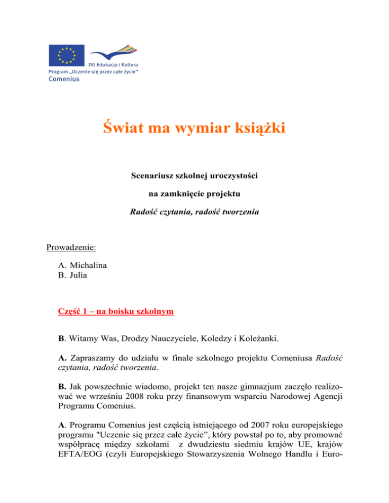 Świat ma wymiar ksiąŜki Scenariusz szkolnej uroczystości na zamknięcie projektu Radość czytania, radość tworzenia Prowadzenie: A. Michalina B. Julia Część 1 – na boisku szkolnym B. Witamy Was, Drodzy Nauczyciele, Koledzy i KoleŜanki. A. Zapraszamy do udziału w finale szkolnego projektu Comeniusa Radość czytania, radość tworzenia. B. Jak powszechnie wiadomo, projekt ten nasze gimnazjum zaczęło realizować we wrześniu 2008 roku przy finansowym wsparciu Narodowej Agencji Programu Comenius. A. Programu Comenius jest częścią istniejącego od 2007 roku europejskiego programu "Uczenie się przez całe Ŝycie”, który powstał po to, aby promować współpracę między szkołami z dwudziestu siedmiu krajów UE, krajów EFTA/EOG (czyli Europejskiego Stowarzyszenia Wolnego Handlu i Euro- pejskiego Obszaru Gospodarczego; oprócz państw UE takŜe: Islandii, Liechtensteinu, Norwegii) oraz kraju kandydującego do członkostwa w Unii Europejskiej - Turcji. B. Szkoły realizujące projekty w ramach programu Comenius mają za zadanie propagowanie wiedzy o kulturach i językach europejskich i wspieranie młodzieŜy w nabywaniu podstawowych umiejętności oraz kompetencji Ŝyciowych niezbędnych do osobistego rozwoju. A. Dobiegający końca dwuletni projekt „Radość czytania, radość tworzenia” realizowaliśmy wspólnie ze szkołami z pięciu krajów: Hiszpanii, Rumunii, Grecji, Litwy i Portugalii. W listopadzie 2008 roku gościliśmy w naszym gimnazjum przedstawicieli wszystkich szkół partnerskich. W kolejnych miesiącach nauczyciele i uczniowie naszej szkoły mieli okazję uczestniczyć jeszcze w pięciu innych spotkaniach z kadrą nauczającą w tych szkołach i uczącą się w nich młodzieŜą. Wszystkie odbyły się juŜ poza granicami naszego kraju, w kaŜdej ze szkół partnerskich po kolei. B. Głównym językiem słuŜącym wzajemnemu porozumiewaniu się był angielski, a pomocniczym – francuski. W trakcie dwuletniej współpracy uczniowie wszystkich szkół pracowali nad wędrującymi ksiąŜkami. Uczniowie kaŜdej ze szkół mieli swój udział w ich powstaniu. A. Obecnie praca nad ich tworzeniem dobiegła końca. Powstały dwie opowieści. KsiąŜka w języku angielskim nosi tytuł Wandering adventure. (pokaz ksiąŜki). B. Gotowa teŜ jest opowieść La légende du chêne, pisana w języku francuskim, trwa jeszcze montaŜ filmu będący jego adaptacją. Wszystkie role odegrali w nim uczniowie naszego gimnazjum. Premiera odbędzie się wkrótce za pośrednictwem szkolnej strony internetowej. A. Pragnąc zachęcić Was, Drogie KoleŜanki i Drodzy Koledzy, do lektury ksiąŜek będących rezultatem naszego europejskiego projektu „Radość czytania, radość tworzenia”, jak i czytania w ogóle, zapraszamy wszystkich do udziału w szkolnym teledysku. B. Mamy nadzieję, Ŝe poprzez wspólny taniec i śpiew zainspirujemy takŜe innych do czytania. Szkolny clip, który za chwilę powstanie z naszym udziałem, znajdzie się takŜe na internetowej stronie szkoły. [Uczniowie kilku klas biorą udział w nagraniu szkolnego teledysku. Inspirację do jego nakręcenia nauczycielom uczestniczącym w re- 2 alizacji projektu i młodzieŜy dostarczyła popularna obecnie w Stanach Zjednoczonych akcja „Musisz czytać”. Z takim niekonwencjonalnym sposobem na promowanie czytelnictwa szkoła zetknęła się za pośrednictwem serwisu YouTube: http://www.youtube.com/watch?v=x6D9jiEYxzs&feature=player_ embedded W celu uzyskania bliŜszych informacji o akcji za pośrednictwem poczty elektronicznej skontaktowała się z Ocoee Middle School na Florydzie.] Po nakręceniu clipu: Część 2 – w sali gimnastycznej A. Częścią europejskiego projektu Comenius były wyjazdy zagraniczne i spotkania z młodzieŜą i nauczycielami ze szkół partnerskich. A. Pora teraz na chwilę wspomnień i pokaz slajdów obrazujących przebieg spotkań w poszczególnych szkołach biorących udział w projekcie Radość czytania, radość tworzenia. [Prezentacja multimedialna – pokaz zdjęć obrazujących spotkania i wyjazdy zrealizowane w trakcie trwania projektu, przedstawienie wspomnień ich uczestników.] B. W centrum realizowanego przez naszą szkołę projektu Radość czytania, radość tworzenia były oczywiście ksiąŜki i czytanie. A. Wprawdzie rok szkolny dobiega końca, rozpoczynają się wakacje, ale to wcale nie znaczy, Ŝe mamy przez najbliŜsze dwa miesiące całkowicie zrezygnować z czytania. Do wakacyjnego plecaka moŜna i warto wrzucić kilka dobrych ksiąŜek. Będzie moŜna do nich zajrzeć w długie deszczowe, letnie dni. Jakie to ksiąŜki? Pewne propozycje znajdziecie w najnowszym, specjalnym wydaniu szkolnej gazetki „Kredą pisane”. B. Jednym z najwybitniejszych twórców literatury dla młodzieŜy jest Edward Niziurski. Jego ksiąŜki, na przykład Niewiarygodne przygody Marka Piegusa, „Siódme wtajemniczenie” czy Naprzód wspaniali cieszą się ogromną popularnością, przetłumaczono je na wiele języków. Posłuchajcie krótkiego fragmentu innej ksiąŜki tego pisarza – Adelo zrozum mnie!. Przeczyta go dla was Bartek z I „f”. 3 [Uczeń czyta fragment ksiąŜki Adelo zrozum mnie (w trakcie czytania pokaz obrazów nawiązujących do tekstu).] A. Spotkania i wyjazdy zagraniczne w ramach projektu Comeniusa Radość czytania, radość tworzenia sprawiły, Ŝe ich uczestnicy nabrali większej biegłości w posługiwaniu się językami obcymi, zwłaszcza angielskim. B. Będąc w róŜnych krajach Europy, mieli teŜ moŜliwość poznać nieco języki mniej popularne – litewski czy choćby portugalski. Uczestnicy spotkania w portugalski Faro zaśpiewają teraz piosenkę, której nauczyli się zupełnie niedawno. Motywacją do jej przyswojenia sobie przez nich był właśnie wyjazd do Portugalii. Wystąpią teraz przed wami Bartosz i Asia, którzy zaśpiewają po portugalsku. [Uczniowie śpiewają piosenkę w języku portugalskim.] A. Udział w projekcie wi