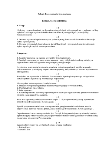 Polskie Porozumienie Kynologiczne REGULAMIN SĘDZIÓW 1.Wstęp §1 Niniejszy regulamin odnosi się do osób wpisanych bądź ubiegających się o wpisanie na listę sędziów kynologicznych w Polskim Porozumieniu Kynologicznym (zwanej dalej Porozumieniem). §2 1. Ocen na wystawach psów rasowych, próbach pracy, konkursach i zawodach dokonuje sędzia kynologiczny. 2. Ocen na przeglądach hodowlanych, kwalifikacyjnych i przeglądach miotów dokonuje sędzia kynologiczny lub osoba uprawniona. 2.Asystenci §3 1. Sędziów rekrutuje się z grona asystentów kynologicznych. 2. Sędzią kynologicznym może zostać asystent , który odbył staż określony niniejszym regulaminem oraz zdał egzamin na sędziego kynologicznego. §4 Asystentem może zostać wyłącznie pełnoletni członek organizacji współpracującej z Porozumieniem, posiadający nieposzlakowaną opinię, który ukończył kurs na asystenta oraz zdał egzamin. §5 Kandydaci na asystentów w Polskim Porozumieniu Kynologicznym mogą ubiegać się o status asystenta zgodnie z § 4 niniejszego regulaminu. §6 Aby uzyskać status asystenta, kandydat musi: 1. Przedstawić opinię organizacji macierzystej dotyczącą osoby kandydata, 2. Ukończyć kurs na asystenta, 3. Zdać egzamin , 4. Rozpocząć staż na dowolnej wystawie psów rasowych organizowanej przez Porozumienie lub inną organizację kynologiczną. §7 Kurs oraz egzaminy, o których mowa w §6 pkt. 2 i 3 przeprowadzają osoby uprawnione przez Polskie Porozumienie Kynologiczne . §8 Sposób przeprowadzania kursu oraz egzaminów, przyjmowania kandydatów określa odpowiednia uchwała wydana przez Zarząd Polskiego Porozumienia Kynologicznego . §9 Organizatorem kursu oraz egzaminów jest Zarząd , który powołuje mocą uchwały komisje egzaminacyjną odpowiedzialną za przeprowadzenie kursów oraz egzaminów w skład której mogą wejść członkowie Porozumienia. § 10 Egzamin teoretyczny na asystenta obejmuje wiedzę z zakresu: – fizjologii psa, – anatomii psa, – genetyki, – podstawowej znajomości wzorców ras psów, – znajomości prowadzenia przeglądów: hodowlanych, miotów oraz kwalifikacyjnych, – znajomości podstaw zoopsychologii. – znajomość Statutu oraz Regulaminów Porozumienia, Egzamin praktyczny obejmuje: Wykorzystanie wcześniej nabytej wiedzy w: – ocenie psów na ringu wystawowym – podczas przeglądu hodowlanego i kwalifikacyjnego – podczas przeglądu miotu. Sprawdzenie znajomości: – obowiązków osób funkcyjnych na ringu wystawowym. § 11 Po zaliczeniu egzaminu , kandydat otrzymuje nominację na asystenta. § 12 Nominacja, o której mowa w § 11 uprawnia asystenta do przebywania na ringu podczas wystawy w charakterze asystenta sędziego kynologicznego, sekretarza ringowego oraz opiekuna ringu. § 13 1. Staż sędziego nie może trwać dłużej niż 2 lata od momentu otrzymania nominacji na sędziego stażystę. 2. W czasie trwania stażu, sędzia zobowiązany jest to zaliczenia określonej ilości asyst, przeglądów, sekretarzowania oraz opiekuna ringu. . Po okresie dwóch lat od momentu otrzymania nominacji, w przypadku braku podejścia do egzaminu na sędziego kynologicznego, nominacja zostaje anulowana. 4. Nominacja może zostań również anulowana za niezaliczenie egzaminu na sędziego kynologicznego, nieprzestrzeganie Statutu oraz Regulaminów Porozumienia lub nieprzestrzeganie rozporządzeń, decyzji, nałożonych kar oraz uchwał wydanych przez władze Porozumienia. § 14 1. Asystenta na równi z sędzią kynologicznym obowiązuje Kodeks Etyki Sędziego, który jest integralną częścią niniejszego regulaminu, 2. Asystent powinien wykonywać prace społeczne na rzecz Polskiego Porozumienia Kynologicznego oraz macierzystej organizacji. § 15 W przypadku zaliczenia przez asystenta stażu w okresie do 2 lat od momentu otrzymania nominacji, może on przystąpić do egzaminu na sędziego kynologicznego. § 16 1. Sposób przeprowadzania egzaminu na sędziego kynologicznego wydaje w drodze uchwały Zarząd Porozumienia. 2. Zakres egzaminu na sędziego kynologicznego obejmuje m. in.: – rozszerzoną znajomość wzorców ras psów, – znajomość wzorców ras wybranej specjalizacji, – znajomość Statutu oraz Regulaminów Porozumienia, – znajomość wybranych zagadnień w hodowli psów rasowych, – wykorzystanie wiedzy w praktycznej ocenie eksterieru, – znajomość prowadzenia dokumentacji hodowlanej. § 17 1. Zaliczenie egzaminu na sędziego kynologicznego jest podstawą do wydania nominacji na sędziego kynologicznego. Nominacja, o której tu mowa wydawana jest przez Zarząd Porozumienia i wiąże się z wpisaniem na listę sędziów kynologicznych Polskiego Porozumienia Kynologicznego 2. W przypadku niezaliczenia egzaminu kandydat na sędziego kynologicznego może ponownie przystąpić do egzaminu jednak nie wcześniej jak po upływie sześciu miesięcy od daty ostatniego egzaminu. 3. Wpisanie na listę sędziów kynologicznych, o którym mowa w § 17 pkt. 1 umożliwia osobie wpisanej samodzielne podejmowanie decyzji, o których mowa w § 2 niniejszego regulaminu. 3.Sędziowie kynologiczni § 18 Sędziowie kynologiczni dzielą się na sędziów międzynarodowych, sędziów ras oraz sędziów prób pracy psów. 1. Sędzią międzynarodowym zostaje osoba, która zdała egzamin na sędziego kynologicznego i została wpisana na listę sędziów kynologicznych Porozumienia. Sędzia kynologiczny może dokonywać oceny na krajowych i międzynarodowych wystawach psów rasowych, próbach pracy, konkursach, zawodach, wykonywać przeglądy hodowlane, kwalifikacyjne, przeglądy miotów oraz oceny hodowli. Sędzia międzynarodowy może oceniać psy na wystawach międzynarodowych, na które otrzymał zaproszenie. . 2. Sędzia ras – to sędzia, który posiada odpowiednią wiedzę i uprawnienia do dokonywania oceny określonej rasy, kilku ras, bądź wszystkich ras. Sędzia wszystkich ras – to sędzia, który posiada odpowiednią