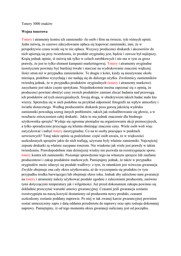 Tonery 3000 znaków Wojna tonerowa Tonery i atramenty kontra ich zamienniki- ile osób i firm na świecie, tyle różnych opinii. Jedni mówią, że cenowo zdecydowanie opłaca się kupować zamienniki, inni, że w perspektywie czasu wcale się to nie opłaca. Wszyscy producenci drukarek i akcesoriów do nich upierają się przy twierdzeniu, że produkt oryginalny jest, będzie i zawsze był najlepszy. Krążą jednak opinie, iż mówią tak tylko w celach zarobkowych i nie ma w tym za grosz prawdy, że jest to tylko element kampanii marketingowej. Tonery i atramenty oryginalne teoretycznie powinny być bardziej trwałe i starczać na wydrukowanie znacznie większej ilości stron niż w przypadku zamienników. Te drugie z kolei, kiedy są nieużywane około miesiąca, podobno wysychają i nie nadają się do dalszego użytku. Zwolennicy zamienników twierdzą jednak, że w przypadku produktów oryginalnych (tonery i atramenty markowe) zasychanie jest także często spotykane. Niejednokrotnie można zapoznać się z opinią, że producenci powinni obniżyć ceny swoich produktów zamiast zlecać badania nad przewagą ich produktów od tych nieoryginalnych. Swoją drogą, w obiektywizm takich badać mało kto wierzy. Sprawdza się w nich podobno na przykład odporność fotografii na wpływ atmosfery i światła słonecznego. Według producentów drukarek poza gorszą jakością wydruku zamienniki powodują szereg innych problemów, takich jak rozkalibrowanie się głowic, a w rezultacie zniszczeniem całej drukarki. Jakie to ma jednak znaczenie dla biednego użytkownika sprzętu? Wydaje się ogromne pieniądze na organizowanie akcji promocyjnych, a tylko sporadycznie przyciąga się klienta obniżając znacznie ceny. Wiele osób woli więc zaryzykować i nabyć tonery nieoryginalne. Co na to osoby pracujące w punktach serwisowych? Tutaj także opinie są podzielone: część osób uważa, że w większości uszkodzonych sprzętów jakie do nich trafiają, używane były właśnie zamienniki. Najczęściej zepsute drukarki są właśnie zasypane tonerem. Nie wiadomo jak wiele jest prawdy w takim twierdzeniu. Prawdopodobnie stan dzisiejszej wiedzy nie pozwala na rozstrzygnięcie sporu: tonery kontra ich zamienniki. Pozostaje sprawdzenie tego na własnym sprzęcie lub zaufanie producentowi i zakup produktów markowych. Pamiętajmy jednak, że także w przypadku oryginałów może zdarzyć się produkt wadliwy- z tym, że ratunkiem jest wówczas gwarancja. Zwykle obejmuje ona cały okres użytkowania, aż do wyczerpania się produktu (w tym przypadku środka barwiącego) lub obejmuje okres roku. Jednak aby udzielono nam gwarancji na tonery i atramenty należy użytkować produkt zgodnie z zaleceniami producenta, zarówno tymi dotyczącymi temperatury jak i wilgotności. Już przed dokonaniem zakupu powinno się dokładnie przeczytać warunki umowy gwarancyjnej. Czasami jeśli gwarancja zostanie rozstrzygnięta na naszą korzyść dostaniemy od producenta nowy produkt, czasami uszkodzony zostanie poddany naprawie. Po niej w tak zwanej karcie gwarancyjnej powinien zostać umieszczony zapis z datą oddania przedmiotu do naprawy oraz opis rodzaju dokonanej naprawy. Pamiętajmy, iż od tego momentu okres gwarancji naliczany jest od początku. Jak drukarka to robi, że drukuje Jeśli zdajecie sobie sprawę z tego, jak działają popularne maszyny do ksero, łatwo będzie Wam zrozumieć także sposób działania drukarek laserowych (nieuderzeniowych), których nieodłączną częścią muszą być tonery. Analogia jest bardzo widoczna, ale o tym poniżej. Po pierwsze część drukarki zwana wałkiem musi być odpowiednio przygotowana, czyli elektryzowana. Na wałek położony jest krzem amorficzny lub materiał światłoczuły. Następnym etapem jest naświetlenie owego wałka laserem bądź linijką diodową (diodą świecącą LED). W efekcie te punkty, które zostały naświetlone pozbywają się ładunku elektrycznego i nie przyciągają proszku. Tonery odkładane są na bębnie przy obracaniuporuszający się dalej dookoła bęben nakłada już proszek na kartkę papieru, która następnie musi zostać utrwalona. Wygląda to w sposób następujący: rozgrzane wałki (jeden do temperatury 200 stopni Celsjusza) przepuszczają przez siebie ową kartkę, dzięki czemu tak rozgrzany proszek przywiera na stałe do papieru. Pozostaje już tylko rozelektryzować wałek i za pomocą specjalnej szczotki oczyścić go z toneru, który nie został przeniesiony na papier. Tak przygotowana maszyna jest gotowa do ponownego procesu, w tym przypadku wydrukowania kolejnej kartki papieru. Wszystko dzieję się oczywiście w mgnieniu oka, aż trudno uwierzyć patrząc na wydruk, że są to po prostu tonery. W celu otrzymania wydruku kolorowego drukarka musi być wyposażona w cztery układy służące do nanoszenia proszku, każdy w innym kolorze. W tym przypadku wystarcza jeden przebieg aby uzyskać wydruk. Jest też inny sposób: tonery w czterech kolorach znajdują się w specjalnych pojemniczkach już na wałku i nanoszone są podczas kolejnych czterech przebiegów. Czym charakteryzuje się ponadto drukarka laserowa? Przede wszystkim jakość zadrukowanych kartek jest rewelacyjna, a sam proces druku, jak już wspomniane było wyżej, następuje bardzo szybko. W przypadku, gdy kartka ulegnie namoczeniu, druk nam się „nie rozpłynie”. Mimo, że drukarki laserowe są w dalszym ciągu droższe niż atramentowe (choć już coraz mniej), koszty maleją w trakcie eksploatacji. Profesjonalne firmy, którym zależy na szybkiej i efektownej pracy drukarek inwestują właśnie w ten ich rodzaj. Przed dokonaniem zakupy można obliczyć mniej więcej koszt eksploatacji danej drukarki. Należy wziąć pod uwagę: jak wydajne są tonery zastosowane w niej, jaka jest jakość bębna, ile stron wydruku jest w stanie „przetrzymać”, a także rodzaj papieru, jakiego będziemy używać w pracy. Warto także przetestowa