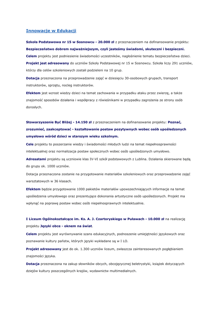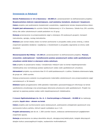 Innowacje w Edukacji Szkoła Podstawowa nr 15 w Sosnowcu - 20.000 zł z przeznaczeniem na dofinansowanie projektu: Bezpieczeństwo dobrem najwaŜniejszym, czyli jesteśmy świadomi, skuteczni i bezpieczni. Celem projektu jest podniesienie świadomości uczestników, nagłośnienie tematu bezpieczeństwa dzieci. Projekt jest adresowany do uczniów Szkoły Podstawowej nr 15 w Sosnowcu. Szkoła liczy 291 uczniów, którzy dla celów szkoleniowych zostali podzieleni na 10 grup. Dotacja przeznaczona na przeprowadzenie zajęć w dziesięciu 30-osobowych grupach, transport instruktorów, sprzętu, nocleg instruktorów. Efektem jest wzrost wiedzy dzieci na temat zachowania w przypadku ataku przez zwierzę, a takŜe znajomość sposobów działania i współpracy z rówieśnikami w przypadku zagroŜenia ze strony osób dorosłych. Stowarzyszenie Być BliŜej - 14.150 zł z przeznaczeniem na dofinansowanie projektu: Poznać, zrozumieć, zaakceptować - kształtowanie postaw pozytywnych wobec osób upośledzonych umysłowo wśród dzieci w starszym wieku szkolnym. Cele projektu to poszerzanie wiedzy i świadomości młodych ludzi na temat niepełnosprawności intelektualnej oraz normalizacja postaw społecznych wobec osób upośledzonych umysłowo. Adresatami projektu są uczniowie klas IV-VI szkół podstawowych z Lublina. Działania skierowane będą do grupy ok. 1000 uczniów. Dotacja przeznaczona zostanie na przygotowanie materiałów szkoleniowych oraz przeprowadzenie zajęć warsztatowych w 36 klasach. Efektem będzie przygotowanie 1000 pakietów materiałów upowszechniających informacje na temat upośledzenia umysłowego oraz prezentujące dokonania artystyczne osób upośledzonych. Projekt ma wpłynąć na poprawę postaw wobec osób niepełnosprawnych intelektualnie. I Liceum Ogólnokształcące im. Ks. A. J. Czartoryskiego w Puławach - 10.000 zł na realizację projektu Języki obce - oknem na świat. Celem projektu jest wyrównywanie szans edukacyjnych, podnoszenie umiejętności językowych oraz poznawanie kultury państw, których języki wykładane są w I LO. Projekt adresowany jest do ok. 1.300 uczniów liceum, zwłaszcza zainteresowanych pogłębianiem znajomości języka. Dotacja przeznaczona na zakup słowników obcych, obcojęzycznej beletrystyki, ksiąŜek dotyczących dziejów kultury poszczególnych krajów, wydawnictw multimedialnych. Zamierzone efekty konkursu prezentowane są przez jego motto -"Granice mego języka oznaczają granice mego świata" (L. Wittgenstein). Organizatorzy wierzą, Ŝe pogłębianie znajomości języków i kultury innych państw poszerzy horyzonty i moŜliwości uczniów liceum. Gimnazjum w Zbąszyniu - 11.180 zł z przeznaczeniem na dofinansowanie projektu: Otwarta kurtyna - projekt grupy językowo - teatralnej ACE "All Clear to English". Celem projektu jest doskonalenie kompetencji językowej i komunikacyjnej uczniów, ułatwiającej mu porozumienie się w języku angielskim. Projekt adresowany jest do 70 uczniów szkół anglojęzycznych. Dotacja przeznaczona została na materiały niezbędne do realizacji projektu, zakup mikrofonów oraz wynagrodzenie opiekunów. Efektem realizacji przedsięwzięcia jest ugruntowanie własnych moŜliwości twórczych i językowych poprzez prezentację efektów swojej pracy przed profesjonalistami w dziedzinie teatru anglojęzycznego na forum kraju. Fundacja Pomocy Matematykom i Informatykom Niesprawnym Ruchowo - 31.804 zł z przeznaczeniem na dofinansowanie projektu: Przygotowanie osób niepełnosprawnych do zdobycia Europejskiego Certyfikatu Umiejętności Komputerowych ECDL - European Komputer Driving Licence (edukacja zdalna i szkolenia stacjonarne w ramach punktu konsultacyjno szkoleniowego). Celem projektu jest przygotowanie uczestników szkoleń do zdobycia certyfikatu ECDL. Adresatami projektu jest 120 osób niepełnosprawnych (ruchowo, ze schorzeniami sprzęŜonymi oraz innymi dysfunkcjami), szczególnie z niepełnosprawnością w stopniu znacznym i umiarkowanym. Dotacja przeznaczona została na pokrycie kosztów programowych. Efektem projektu jest zdobycie przez uczestników 20 certyfikatów (aby go zdobyć naleŜy w ciągu 3 lat zdać 7 egzaminów). Fundacja Przedsiębiorczości Społecznej - 10.350 zł z przeznaczeniem na dofinansowanie projektu: Excel - podręcznik dla niewidomych uŜytkowników komputerów. Cel projektu to umoŜliwienie rozwijania umiejętności pracy z komputerem osób niewidomych. Projekt adresowany jest do 200 niewidomych uŜytkowników komputerów. Dotacja przeznaczona na wynagrodzenie autora podręcznika oraz konsultantów. Efektem realizacji przedsięwzięcia jest publikacja podręcznika w internecie z moŜliwością samodzielnego pobrania z serwera dostępnego dla osób niewidomych. Projekt rekomendowany przez warszawski oddział Citi Handlowy. Stowarzyszenie Dziedzictwo Podlasia - 4.130 zł z przeznaczeniem na dofinansowanie projektu: Poznać zrozumieć zaakceptować. Celem projektu jest podniesienie wiedzy na temat kultur sąsiedzkich: Ŝydowskiej, ukraińskiej i białoruskiej, wśród polskiej młodzieŜy z Bielska Podlaskiego. Projekt adresowany jest do 334 uczniów, z których 29 bierze udział w wycieczce a pozostali w spotkaniach z osobami zaproszonymi. Dotacja została przeznaczona na honoraria dla ekspertów i prowadzących oraz na materiały biurowe niezbędne do organizacji przedsięwzięcia. Efektem realizacji projektu jest zdobycie przez młodzieŜ nowego doświadczenia związanego z tolerancją, dzięki temu zaszczepienie jej w środowisku lokalnym. Zespół Szkół w Jedliczu - 15.000 zł z przeznaczeniem na dofinansowanie projektu: Nauka języka obcego - oknem na świat. Cel projektu to stworzenie ciekawych i róŜnorodnych warunków do nauki języka angielskiego. Projekt adresowany jest do 409 uczniów gimnazjum. Dotacja przeznaczona na materiały niezbędne do realizacji projektu, zakup mikrofonów oraz wynagrodzenie opiekunów. Efektem realizacji przedsi
