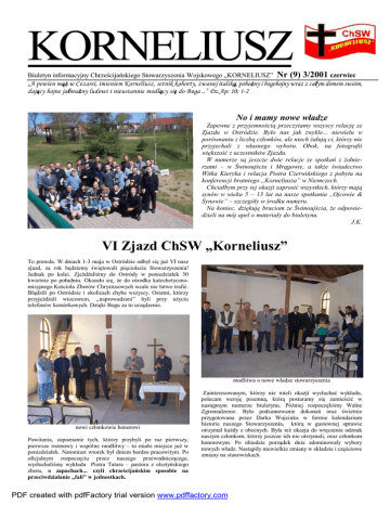 KORNELIUSZ Biuletyn informacyjny Chrześcijańskiego Stowarzyszenia Wojskowego „KORNELIUSZ” Nr (9) 3/2001 czerwiec „A pewien mąż w Cezarei, imieniem Korneliusz, setnik kohorty, zwanej italską, pobożny i bogobojny wraz z całym domem swoim, dający hojne jałmużny ludowi i nieustannie modlący się do Boga ..” Dz.Ap: 10; 1-2 No i mamy nowe władze Zapewne z przyjemnością przeczytamy wszyscy relację ze Zjazdu w Ostródzie. Było nas jak zwykle... niewielu w porównaniu z liczbą członków, ale niech żałują ci, którzy nie przyjechali z własnego wyboru. Obok, na fotografii większość z uczestników Zjazdu. W numerze są jeszcze dwie relacje ze spotkań z żołnierzami – w Świnoujściu i Mrągowie, a także świadectwo Witka Kieryka i relacja Piotra Czerwińskiego z pobytu na konferencji bratniego „Korneliusza” w Niemczech. Chciałbym przy tej okazji zaprosić wszystkich, którzy mają synów w wieku 5 – 13 lat na nasze spotkania „Ojcowie & Synowie” – szczegóły w środku numeru. Na koniec, dziękuję braciom ze Świnoujścia, że odpowiedzieli na mój apel o materiały do biuletynu. J.K. VI Zjazd ChSW „Korneliusz” To prawda. W dniach 1-3 maja w Ostródzie odbył się już VI nasz zjazd, za rok będziemy świętowali pięciolecie Stowarzyszenia! Jednak po kolei. Zjeżdżaliśmy do Ostródy w poniedziałek 30 kwietnia po południu. Okazało się, że do ośrodka katechetycznomisyjnego Kościoła Zborów Chrystusowych wcale nie łatwo trafić. Błądzili po Ostródzie i okolicach chyba wszyscy. Ostatni, którzy przyjeżdżali wieczorem, „naprowadzani” byli przy użyciu telefonów komórkowych. Dzięki Bogu za to urządzenie. modlitwa o nowe władze stowarzyszenia nowi członkowie honorowi Powitania, zapoznanie tych, którzy przybyli po raz pierwszy, pierwsze rozmowy i wspólne modlitwy – to miało miejsce już w poniedziałek. Natomiast wtorek był dniem bardzo pracowitym. Po oficjalnym rozpoczęciu przez naszego przewodniczącego, wysłuchaliśmy wykładu Piotra Tatara – pastora z olsztyńskiego zboru, o zapachach... czyli chrześcijańskim sposobie na przeciwdziałanie „fali” w jednostkach. Zainteresowanym, którzy nie mieli okazji wysłuchać wykładu, polecam wersję pisemną, którą postaramy się zamieścić w następnym numerze biuletynu. Później rozpoczęliśmy Walne Zgromadzenie. Było podsumowanie dokonań oraz świetnie przygotowana przez Darka Wujciuka w formie kalendarium historia naszego Stowarzyszenia, którą w gustownej oprawie otrzymał każdy z obecnych. Była też okazja do wręczenia odznak naszym członkom, którzy jeszcze ich nie otrzymali, oraz członkom honorowym. Po obiedzie porządek dnia zdominowały wybory nowych władz. Nastąpiły niewielkie zmiany w składzie i częściowe zmiany na stanowiskach. PDF created with pdfFactory trial version www.pdffactory.com niemieckiego CoV członek władz ACCTS, oraz wiceprezydent AMCF płk. Torbjőrn Bostrőm ze Szwecji. Wieczorem, z udziałem żołnierzy z ostródzkiego garnizonu, przy ognisku piekliśmy kiełbaski. To był czas na swobodne rozmowy, świadectwa składane żołnierzom i snucie planów. Zresztą planów nie brakowało przy wszystkich rozmowach. nowy zarząd i komisja rewizyjna Zarząd i komisję rewizyjną, w nowym składzie przedstawia powyższa fotografia. Od prawej stoją: mł.chor.szt.mar. Piotr Czerwiński – członek komisji rewizyjnej, chor. Jacek Dankiewicz – sekretarz zarządu, ppłk rez. Jerzy Semrau – członek zarządu, kpt.rez. Ryszard Grochowski – przewodniczący komisji rewizyjnej, mjr pil. Darek Wujciuk – przewodniczący zarządu, sierż.szt. Adam Szopa – członek komisji rewizyjnej, kpt.rez. Jerzy Kurdek – skarbnik zarządu, mł.chor.szt. Tomasz Buraczek – członek zarządu. Wiceprzewodniczącym zarządu został wybrany płk dr Igor Sawicki, nieobecny na fotografii. przy ognisku Niedzielne nabożeństwo wspólnie prowadzili: Tadeusz Jelinek i Piotr Tatar, z tradycyjną już Wieczerzą Pańską „w kręgu”. Potem obiad, pożegnania i wyjazdy do domu. Goście zagraniczni i nasz przewodniczący zostali jeszcze na następny dzień i radzili o przygotowaniach do AMCF European Conference 2002, która odbędzie się w Warszawie. przy stole W środę pogoda dalej dopisywała, więc przed południem wyjechaliśmy na wycieczkę – na pobliskie pola upamiętniające Bitwę Grunwaldzką. Zwiedziliśmy też skansen w niedalekim Olsztynku. wręczenie odznak członkowskich Oczywiście należy tu koniecznie dopisać o zajęciach dla naszych dzieci, które uczestniczyły w nocnym szkoleniu wojskowym i marszach dookoła jeziora. Resztę obejrzyjcie na fotografiach. J.K. kaplica, zwana „stodołą” Po obiedzie, przy udziale Piotra Tatara jako tłumacza, głos mieli goście zagraniczni: mjr.rez. Homfray Vines – dyrektor na Europejskiego oddziału ACCTS, płk.rez. Reiner Thorun – z PDF created with pdfFactory trial version www.pdffactory.com zajęcia nocne Gedeon i Korneliusz w Świnoujściu Dnia 16 marca w Świnoujściu odbyło się spotkanie ewangelizacyjne dla marynarzy Komendy Portu Wojennego Świnoujście. Na spotkanie zaproszony został przewodniczący naszego Stowarzyszenia mjr Darek Wujciuk. Dzięki Panu naszemu mogłem zorganizować to spotkanie, choć było wiele niewiadomych. Jednak wszystko się ułożyło we właściwy sposób. Pan nas prowadził. Współorganizatorami tego spotkania byli "Korneliusze" ze Świnoujścia: Gabriel Kosętka wraz z żoną Asią, Tomasz Szajek i Piotr Warwas. Darek opowiadał marynarzom o swojej pracy, dzielił się też tym, co Bóg czyni w jego życiu. Przedstawił też pokrótce nasze Stowarzyszenie i jego członków. Świadectwami podzielili się również Gabriel Kosętka i Piotr Warwas. Mogliśmy rozdać wiele traktatów i książek chrześcijańskich oraz, co najważniejsze, każdy z marynarzy otrzymał Nowy Testament ofiarowany przez świnoujski obóz Gedeonitów. Również w tej organi