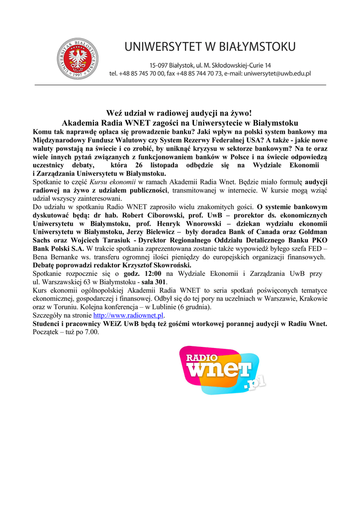 Weź udział w radiowej audycji na żywo! Akademia Radia WNET zagości na Uniwersytecie w Białymstoku Komu tak naprawdę opłaca się prowadzenie banku? Jaki wpływ na polski system bankowy ma Międzynarodowy Fundusz Walutowy czy System Rezerwy Federalnej USA? A także - jakie nowe waluty powstają na świecie i co zrobić, by uniknąć kryzysu w sektorze bankowym? Na te oraz wiele innych pytań związanych z funkcjonowaniem banków w Polsce i na świecie odpowiedzą uczestnicy debaty, która 26 listopada odbędzie się na Wydziale Ekonomii i Zarządzania Uniwersytetu w Białymstoku. Spotkanie to część Kursu ekonomii w ramach Akademii Radia Wnet. Będzie miało formułę audycji radiowej na żywo z udziałem publiczności, transmitowanej w internecie. W kursie mogą wziąć udział wszyscy zainteresowani. Do udziału w spotkaniu Radio WNET zaprosiło wielu znakomitych gości. O systemie bankowym dyskutować będą: dr hab. Robert Ciborowski, prof. UwB – prorektor ds. ekonomicznych Uniwersytetu w Białymstoku, prof. Henryk Wnorowski – dziekan wydziału ekonomii Uniwersytetu w Białymstoku, Jerzy Bielewicz – były doradca Bank of Canada oraz Goldman Sachs oraz Wojciech Tarasiuk - Dyrektor Regionalnego Oddziału Detalicznego Banku PKO Bank Polski S.A. W trakcie spotkania zaprezentowana zostanie także wypowiedź byłego szefa FED – Bena Bernanke ws. transferu ogromnej ilości pieniędzy do europejskich organizacji finansowych. Debatę poprowadzi redaktor Krzysztof Skowroński. Spotkanie rozpocznie się o godz. 12:00 na Wydziale Ekonomii i Zarządzania UwB przy ul. Warszawskiej 63 w Białymstoku - sala 301. Kurs ekonomii ogólnopolskiej Akademii Radia WNET to seria spotkań poświęconych tematyce ekonomicznej, gospodarczej i finansowej. Odbył się do tej pory na uczelniach w Warszawie, Krakowie oraz w Toruniu. Kolejna konferencja – w Lublinie (6 grudnia). Szczegóły na stronie http://www.radiownet.pl. Studenci i pracownicy WEiZ UwB będą też gośćmi wtorkowej porannej audycji w Radiu Wnet. Początek – tuż po 7.00.