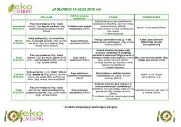 JADŁOSPIS 16-26.02.2016 rok ZUPA na wywarze warzywnym ŚNIADANIE Poniedziałek 16.02.2016r. Pieczywo mieszane (60g), masło roślinne (10g), szynka miodowa (40g), rzodkiewka gotowana (30g), herbata (200ml). Chleb graham (60g), masło roślinne Wtorek (10g), krakowska parzona (20g), pomidor 17.02.2016r. bez skórki (20g), mus jabłkowy (20g), herbata zielona (200ml). Pieczywo mieszane (60g), masło Środa roślinne (10g), parówka z szynki (80%) 18.02.2016r. (2 szt.), ketchup łagodny (10g), papryka (15g), herbata (200ml). Kąski drobiowe w sosie pomidorowym niezabielanym (60g/60g), ziemniaki (100g), Delikatna zupa wiejska kompot owocowy (200ml). niezabielana (250ml) *2 x kąski drobiowe w sosie niezabielanym bez czosnku * 1 x bitka wieprzowa PODWIECZOREK Banan ( 1 szt) herbata (200ml). Zupa kalafiorowa niezabielana (250ml) Pierogi z ziemniakami bez jaj ( 4 szt), bukiet warzyw gotowanych (40g), kompot owocowy (200ml). Zupa rosół z makaronem (250ml) Kolpsik drobiowy bez jaj w sosie ziołowym niezabielanym ( 60g/60g) ziemniaki z koperkiem(100g) surówka ze świeżych warzyw mieszanych bez nabiału Mus owocowy bez nabiału 150g (40g), kompot owocowy (200ml). ciastka bezcukrowe (2 szt) * 2x klops drobiowy bez czosnku w sosie ziołowym niezabielanym *1 x klopsik wieprzowy Bułka grahamka (1 szt), masło roślinne Zupa ogórkowa z Czwartek (10g), pasztet wp.(20g), pasta z cieciorki i koperkiem niezabielana 19.02.2016r. warzyw bez nabiału (20g), pomidor bez (250ml) skórki (30g), herbata owocowa (200ml). Pieczywo mieszane (60g), masło Piątek roślinne(10g), szynka drobiowa (30g), 20.02.2016r. polędwica sopocka (20g), ogórek świeży (20g), herbata (200ml). II DANIE Zupa jarzynowa niezabielana (250ml) Ryż zapiekany z jabłkami i polewą truskawkową bez nabiału, kompot owocowy (200ml). Kisiel z brzoskwiniami (150ml/50g), chrupki kukurydziane 5g Jabłko ( 1 szt), chrupki kukurydziane ( 5 g) Kotleciki rybne bez jaj z brokułem w sosie pomidorowym niezabielanym (60g/60ml), ziemniaki (100g), bukiet warzyw Ciastka bezcukrowe 4 szt, dżem 10 gotowanych (40g), kompot owocowy g, herbata (200ml) (200ml). *2 x kotleciki rybne bez czosnku i jaj w sosie niezabielanym * produkt alergizujący/ zawierający alergeny ZUPA na wywarze warzywnym ŚNIADANIE II DANIE Zapiekanka makaronowa (makaron bezjajeczny) z sezonowymi warzywami i Pieczywo mieszane (60g), masło mięsem drobiowym bez Poniedziałek roślinne (10g), szynka ogonówka (20g), Zupa ryżowa na nabiału(150g/50g/50g), sos pomidorowy 22.02.2016r. listek sałaty, pomidor bez skórki (20g), rosołku (250ml) nie zabielany (70ml), kompot owocowy dżem (20g), herbata z cytryną (200ml). (200ml). *1 x zapiekanka z mięsem wieprzowym *2x zapiekanka bez czosnku i nabiału Stek drobiowy bez jaj w sosie koperkowym niezabielany(60g/60g) kasza jęczmienna (100g), surówka z Bułka grahamka (1 szt), masło roślinne Zupa koperkowa z Wtorek marchewki bez nabiału (40g), kompot (10g), powidła (20g), ogonówka (20g), ziemniaczkami 23.02.2016r. owocowy (200ml). herbata (200ml). niezabielana (250ml) *2 x stek drobiowy bez czosnku w sosie niezabielanym *1 x stek wieprzowy PODWIECZOREK Kaszka manna z owocami ( bez mleka) (150ml/50g.), herbatniki (2szt.), herbata zielona (200ml). Mus owocowy bez nabiału (200ml), krążek ryżowy (1szt.). Pieczywo mieszane (60g), masło Środa roślinne (10g), szynka wieprzowa (20g) 24.02.2016r. szczypiorek (5g), ogórek świeży (15g), herbata (200ml). Zupa z fasolki szparagowej niezabielana (250ml) Makaron bezjajeczny z owocami polewa owocowa bez nabiału( 80 ml), kompot owocowy (200ml). Szwedzki stół: bułka kajzerka (1szt.), Czwartek masło roślinne (10g), szynka chłopska 25.02.2016r. (40g),listek sałaty, papryka (20g), herbata (200ml). Zupa pomidorowa z ryżem nie zabielana (250ml) Udko trybowane bez skóry (60g), Wafel ryżowy (1szt.) , miód (10g), ziemniaki z koperkiem (100g), warzywa herbata (200ml). gotowane (40g), kompot owocowy (200ml). Banan (1/2szt.), ciastka owsiane (3szt.), herbata (200ml). Pieczywo mieszane (60g), masło roślinnr (10g), szynka drobiowa (20g), Kotleciki rybne bez jaj (60g),ziemniaki z Owsianka z owocami-bez mleka Piątek Barszcz czerwony nie polędwica sopocka (20g), pomidor bez koperkiem(100g) kompot owocowy (200ml). (150g/50g), herbata rumiankowa 26.02.2016r. zabielany (250ml) skórki (30g), szczypiorek (3g), herbata *2 x kotleciki rybne bez czosnku (200ml). owocowa (200ml). * produkt alergizujący/ zawierający alergeny