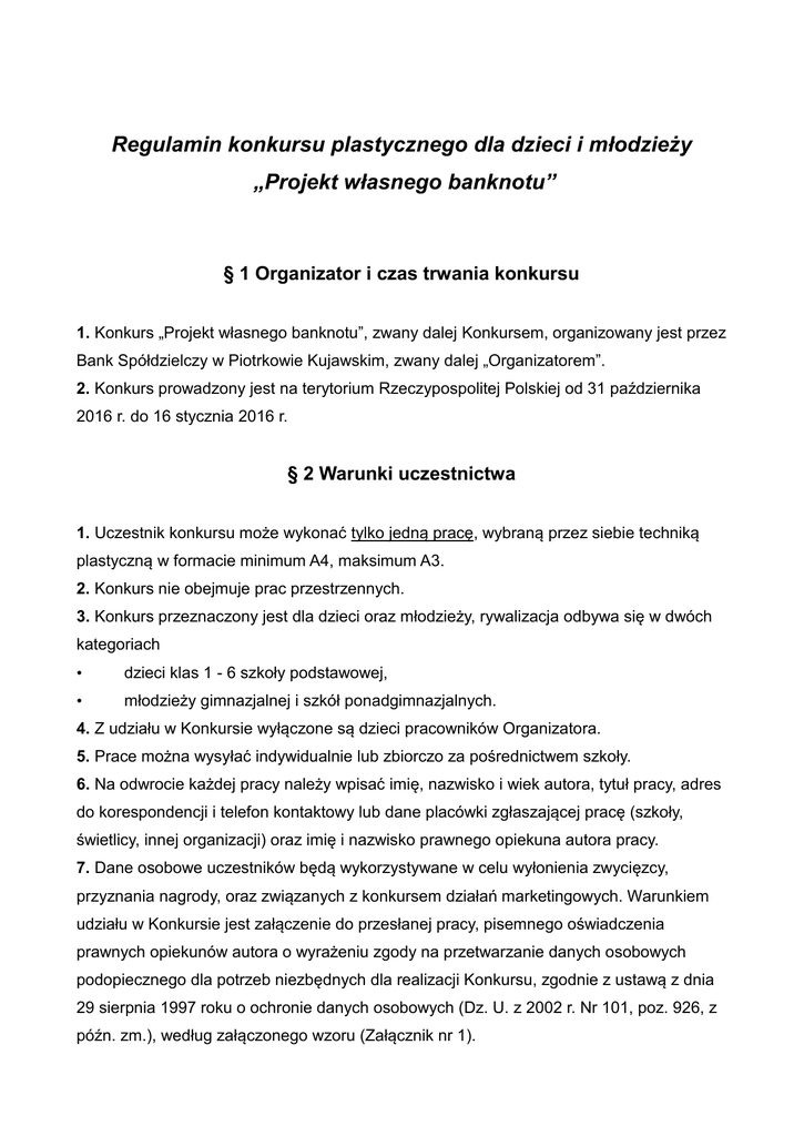 Regulamin konkursu plastycznego dla dzieci i młodzieży „Projekt własnego banknotu” § 1 Organizator i czas trwania konkursu 1. Konkurs „Projekt własnego banknotu”, zwany dalej Konkursem, organizowany jest przez Bank Spółdzielczy w Piotrkowie Kujawskim, zwany dalej „Organizatorem”. 2. Konkurs prowadzony jest na terytorium Rzeczypospolitej Polskiej od 31 października 2016 r. do 16 stycznia 2016 r. § 2 Warunki uczestnictwa 1. Uczestnik konkursu może wykonać tylko jedną pracę, wybraną przez siebie techniką plastyczną w formacie minimum A4, maksimum A3. 2. Konkurs nie obejmuje prac przestrzennych. 3. Konkurs przeznaczony jest dla dzieci oraz młodzieży, rywalizacja odbywa się w dwóch kategoriach • dzieci klas 1 - 6 szkoły podstawowej, • młodzieży gimnazjalnej i szkół ponadgimnazjalnych. 4. Z udziału w Konkursie wyłączone są dzieci pracowników Organizatora. 5. Prace można wysyłać indywidualnie lub zbiorczo za pośrednictwem szkoły. 6. Na odwrocie każdej pracy należy wpisać imię, nazwisko i wiek autora, tytuł pracy, adres do korespondencji i telefon kontaktowy lub dane placówki zgłaszającej pracę (szkoły, świetlicy, innej organizacji) oraz imię i nazwisko prawnego opiekuna autora pracy. 7. Dane osobowe uczestników będą wykorzystywane w celu wyłonienia zwycięzcy, przyznania nagrody, oraz związanych z konkursem działań marketingowych. Warunkiem udziału w Konkursie jest załączenie do przesłanej pracy, pisemnego oświadczenia prawnych opiekunów autora o wyrażeniu zgody na przetwarzanie danych osobowych podopiecznego dla potrzeb niezbędnych dla realizacji Konkursu, zgodnie z ustawą z dnia 29 sierpnia 1997 roku o ochronie danych osobowych (Dz. U. z 2002 r. Nr 101, poz. 926, z późn. zm.), według załączonego wzoru (Załącznik nr 1). 8. Zgłoszenie pracy do konkursu jest związane z nieodpłatnym przeniesieniem autorskich praw majątkowych do pracy na rzecz Organizatora, zgodnie z przepisami ustawy z dnia 4 lutego 1994 r. o prawie autorskim i prawach pokrewnych (Dz. U. z 2006 r. Nr 90, poz. 631, z późn. zm.), oraz zgody na publikację w wydawnictwach wszelkiego typu, wydawanych przez Organizatora, oraz w Internecie. § 3 Termin i warunki nadsyłania prac 1. Pracę wraz z załączonym formularzem zgłoszeniowym należy dostarczyć do najbliższej placówki Organizatora z dopiskiem „Konkurs plastyczny” do dnia 9 grudnia 2016 r. lub przesłać na adres organizatora: Bank Spółdzielczy w Piotrkowie Kujawskim ul Poznańska 13 88-230 Piotrków Kujawski 2. Organizator zastrzega sobie prawo wydłużenia terminu nadsyłania prac. 3. Prace przesłane po terminie nie będą oceniane. Obowiązuje data dostarczenia do siedziby organizatora. 4. Organizator nie ponosi odpowiedzialności za uszkodzenia powstałe podczas wysyłki. 5. Prace przechodzą na własność organizatora i nie będą odsyłane. § 4 Zasady przyznawania nagród 1. Wszystkie prace uczestników zostaną umieszczone na profilu Organizatora konkursu portalu społecznościowego Facebook, znajdującego się pod adresem: www.facebook.com/bspiotrkowkuj. 2. Prace będą oceniane przez użytkowników portalu społecznościowego Facebook. 3. Nagrodzone zostaną 3 najwyżej ocenione prace w każdej z kategorii wiekowych. 4. Głosować na pracę można poprzez „polubienie” jej na profilu Banku Spółdzielczego w Piotrkowie Kujawskim portalu Facebook. 5. Prace zostaną zamieszczone na profilu organizatora na portalu Facebook w dniu 16.12.2016 i wtedy też rozpocznie się głosowanie. Zakończenie głosowania ustala się na godzinę 9.00 dnia 16.01.2017 roku. § 5 Nagrody 1. Organizator Konkursu przewiduje niżej wymienione nagrody za trzy najwyżej ocenione prace w każdej z kategorii wiekowych Uczestników Konkursu 1 miejsce – aparat Fotograficzny 2 miejsce – Słuchawki bezprzewodowe bluetooth 3 miejsce – kalkulator naukowy 2. Organizator Konkursu przewiduje niżej wymienione nagrody dla opiekunów zwycięzców konkursu z ramienia szkoły, do której uczęszcza laureat z każdej kategorii wiekowej: 1 miejsce - aparat fotograficzny 3. Podatek od nagród rzeczowych zostanie opłacony przez Organizatora Konkursu, zgodnie z Ustawą z dnia 26 lipca 1991 r. o podatku dochodowym. 4. Laureatom Konkursu, oraz ich opiekunom nie przysługują roszczenia o wypłatę równowartości pieniężnej uzyskanych nagród. 5. Warunkiem wręczenia nagrody Uczestnikowi Konkursu jest podpisanie przez rodzica lub opiekuna prawnego Uczestnika Konkursu protokołu odbioru nagrody (Załącznik 2) 6. Rozstrzygnięcie konkursu nastąpi w dniu 16 stycznia 2017 roku 7. Informacja o wynikach, terminie i miejscu wręczenia nagród zostanie podana po rozstrzygnięciu konkursu na stronie internetowej Organizatora, oraz na profilu organizatora na portalu Facebook. 8. Laureaci konkursu zostaną powiadomieni o przyznaniu nagród oraz terminie i miejscu ich wręczenia telefonicznie lub drogą pocztową 9. Laureaci konkursu, którzy nie będą mogli uczestniczyć w uroczystości wręczenia nagród, będą mogli odebrać nagrody w terminie późniejszym w siedzibie Organizatora. W uzasadnionych przypadkach nagrody mogą zostać przesłane laureatom konkursu pocztą. § 6 Postanowienia końcowe 1. Organizator zastrzega sobie prawo przerwania, zmiany warunków lub przedłużenia Konkursu, o ile uzna za konieczne wprowadzenie takich zmian. 2. Przystąpienie Uczestnika do Konkursu jest równoznaczne z akceptacją Regulaminu Konkursu. 3. W związku z organizacją Konkursu (tworzenie listy uczestników, ogłoszenie wyników) zgodę na zbieranie, przetwarzanie i wykorzystanie danych osobowych dziecka – Uczestnika Konkursu, zobowiązany jest wyrazić rodzic lub opiekun prawny, dokonujący zgłoszenia Uczestnika Konkursu zgodnie z Ustawą z dnia 29 sierpnia 1997 r. o ochronie danych osobowych (Dz. U. Z 2002, Nr 101, poz. 926 z późn. zm.) Dane osobowe Uczestników Konkursu będą wykorzystywane tylko i wyłąc