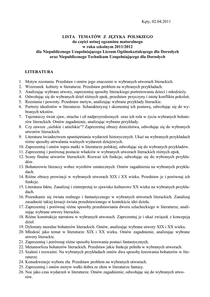 Kęty, 02.04.2011 LISTA TEMATÓW Z JĘZYKA POLSKIEGO do części ustnej egzaminu maturalnego w roku szkolnym 2011/2012 dla Niepublicznego Uzupełniającego Liceum Ogólnokształcącego dla Dorosłych oraz Niepublicznego Technikum Uzupełniającego dla Dorosłych LITERATURA 1. 2. 3. 4. 5. 6. Motyw rozstania. Przedstaw i omów jego znaczenie w wybranych utworach literackich. Wizerunek kobiety w literaturze. Przedstaw problem na wybranych przykładach. Analizując wybrane utwory, zaprezentuj sposoby literackiego portretowania dzieci i młodzieży. Odwołując się do wybranych dzieł różnych epok, przedstaw przyczyny i istotę konfliktu pokoleń. Rozstania i powroty. Przedstaw motyw, analizując wybrane przykłady literackie. Portrety idealistów w literaturze. Scharakteryzuj i skomentuj ich postawę, odwołując się do wybranych tekstów. 7. Tajemniczy świat zjaw, strachu i sił nadprzyrodzonych oraz ich rola w życiu wybranych bohaterów literackich. Omów zagadnienie, analizując wybrane przykłady. 8. Czy zawsze „sielskie i anielskie”? Zaprezentuj obrazy dzieciństwa, odwołując się do wybranych utworów literackich. 9. Literatura świadectwem upamiętniania wydarzeń historycznych. Ukaż na wybranych przykładach różne sposoby utrwalania ważnych wydarzeń dziejowych. 10. Zaprezentuj i omów topos matki w literaturze polskiej, odwołując się do wybranych przykładów. 11. Zaprezentuj i porównaj postacie władców w wybranych utworach literackich różnych epok. 12. Sceny finalne utworów literackich. Rozważ ich funkcje, odwołując się do wybranych przykładów. 13. Bohaterowie literaccy wobec wyrobów ostatecznych. Omów zagadnienia na wybranych przykładach. 14. Różne obrazy prowincji w wybranych utworach XIX i XX wieku. Przedstaw je i porównaj ich funkcje. 15. Literatura faktu. Zanalizuj i zinterpretuj to zjawisko kulturowe XX wieku na wybranych przykładach. 16. Przenikanie się świata realnego i fantastycznego w wybranych utworach literackich. Zanalizuj zasadność takiej kreacji świata przedstawionego w kontekście idei dzieła. 17. Zaprezentuj i porównaj różne sposoby przedstawiania dworu szlacheckiego w literaturze, analizując wybrane utwory literackie. 18. Różne konstrukcje narratora w wybranych utworach. Zaprezentuj je i ukaż związek z koncepcją dzieł. 19. Dylematy moralne bohaterów literackich. Omów, analizując wybrane utwory XIX i XX wieku. 20. Młodość jako temat w literaturze XIX i XX wieku. Omów zagadnienie, analizując wybrane utwory literackie. 21. Zaprezentuj i porównaj różne sposoby kreowania postaci fantastycznych. 22. Metamorfoza bohaterów literackich. Przedstaw jakie funkcje pełniła w wybranych utworach. 23. Szaleni i rozważni. Na wybranych przykładach omów dwa sposoby kreowania bohaterów w literaturze. 24. Konsekwencje wyboru zła. Przedstaw problem na wybranych utworach. 25. Zaprezentuj i omów motyw walki dobra ze złem w literaturze fantasy. 26. Noc jako czas wydarzeń w literaturze. Omów zagadnienie, odwołując się do wybranych utworów. ZWIĄZKI LITERATURY Z INNYMI DZIEDZINAMI SZTUKI 1. Problem adaptacji filmowej. Porównaj film z jego literackim pierwowzorem, oceń adaptację. 2. Historia narodu polskiego jako ważne źródło inspiracji w literaturze i sztuce. Omów na wybranych przykładach. 3. Dramat postaw moralnych wobec okrucieństwa wojny. Omów temat odwołując się do wybranych utworów literackich i filmowych. 4. Ideał urody kobiecej. Omów temat, analizując wybrane teksty kultury. 5. Przedstaw różnorodne ujęcia motywu dziecka w literaturze i malarstwie, odwołując się do wybranych przykładów. 6. Impresjonizm w literaturze i malarstwie. Porównaj dzieła różnych twórców. 7. Przedstaw i porównaj obraz powstań narodowych w literaturze i malarstwie XIX i XX wieku, odwołując się do wybranych przykładów. 8. Sposoby przedstawiania śmierci w literaturze i sztuce. Dokonaj analizy wybranych dzieł. 9. Wizje „końca świata” – zaprezentuj różne ujęcia tego motywu w literaturze i innych tekstach kultury. 10. Motyw maryjny i jego funkcjonowanie. Omów analizując wybrane teksty kultury. 11. Walka dobra ze złem. Omów problem, analizując wybrane przykłady literackie i filmowe. 12. Literatura i film (serial telewizyjny) świadectwem upamiętnienia wydarzeń historycznych, przedstaw na wybranych przykładach różne sposoby utrwalania ważnych wydarzeń dziejowych. JĘZYK 1. Scharakteryzuj język w Internecie na tle współczesnej polszczyzny (np.: blogi, czaty, forum). 2. Dokonaj analizy językowej i kulturalnej przysłów polskich na wybranych przykładach. 3. Mowa mieszkańców Twojej miejscowości. Zbadaj język różnych grup pokoleniowych i zaprezentuj spostrzeżenia i wnioski. 4. Zanalizuj i oceń językowe elementy perswazji w wybranych reklamach. 5. Zróżnicowanie polszczyzny – język w domu, pracy i szkole. Omów jego odmiany na przykładach. 6. Scharakteryzuj różne typy stylizacji językowej i ich funkcje. Omów na przykładach wybranych utworów literatury polskiej. 7. Zapożyczenia językowe. Omów problem i oceń zasadność najnowszych zapożyczeń w języku polskim. 8. Język mówiony jako tworzywo literatury. Dokonaj analizy celowo dobranego materiału. 9. Scharakteryzuj język wybranych bohaterów literackich. Uwzględnij cechy ujawniające ich przynależność środowiskową i charakter. Opracowana przez nauczycieli języka polskiego