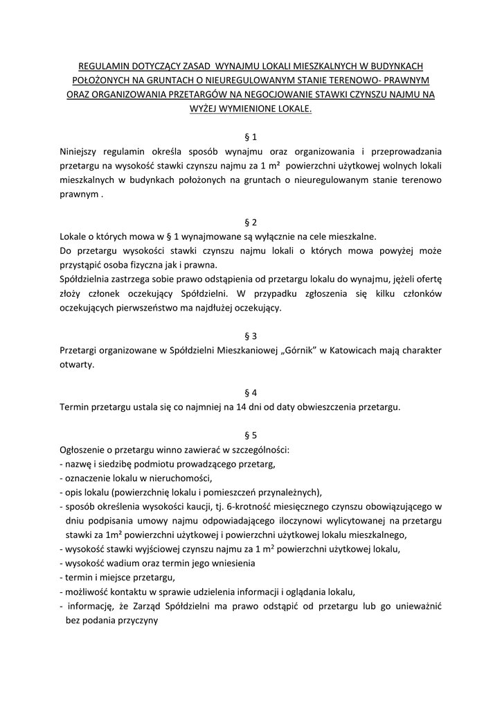 REGULAMIN DOTYCZĄCY ZASAD WYNAJMU LOKALI MIESZKALNYCH W BUDYNKACH POŁOŻONYCH NA GRUNTACH O NIEUREGULOWANYM STANIE TERENOWO- PRAWNYM ORAZ ORGANIZOWANIA PRZETARGÓW NA NEGOCJOWANIE STAWKI CZYNSZU NAJMU NA WYŻEJ WYMIENIONE LOKALE. §1 Niniejszy regulamin określa sposób wynajmu oraz organizowania i przeprowadzania przetargu na wysokość stawki czynszu najmu za 1 m² powierzchni użytkowej wolnych lokali mieszkalnych w budynkach położonych na gruntach o nieuregulowanym stanie terenowo prawnym . §2 Lokale o których mowa w § 1 wynajmowane są wyłącznie na cele mieszkalne. Do przetargu wysokości stawki czynszu najmu lokali o których mowa powyżej może przystąpić osoba fizyczna jak i prawna. Spółdzielnia zastrzega sobie prawo odstąpienia od przetargu lokalu do wynajmu, jężeli ofertę złoży członek oczekujący Spółdzielni. W przypadku zgłoszenia się kilku członków oczekujących pierwszeństwo ma najdłużej oczekujący. §3 Przetargi organizowane w Spółdzielni Mieszkaniowej „Górnik” w Katowicach mają charakter otwarty. §4 Termin przetargu ustala się co najmniej na 14 dni od daty obwieszczenia przetargu. §5 Ogłoszenie o przetargu winno zawierać w szczególności: - nazwę i siedzibę podmiotu prowadzącego przetarg, - oznaczenie lokalu w nieruchomości, - opis lokalu (powierzchnię lokalu i pomieszczeń przynależnych), - sposób określenia wysokości kaucji, tj. 6-krotność miesięcznego czynszu obowiązującego w dniu podpisania umowy najmu odpowiadającego iloczynowi wylicytowanej na przetargu stawki za 1m² powierzchni użytkowej i powierzchni użytkowej lokalu mieszkalnego, - wysokość stawki wyjściowej czynszu najmu za 1 m2 powierzchni użytkowej lokalu, - wysokość wadium oraz termin jego wniesienia - termin i miejsce przetargu, - możliwość kontaktu w sprawie udzielenia informacji i oglądania lokalu, - informację, że Zarząd Spółdzielni ma prawo odstąpić od przetargu lub go unieważnić bez podania przyczyny §6 Komisję przetargową powołuje każdorazowo Prezes Zarządu w co najmniej trzy osobowym składzie tj. przedstawiciel Zarządu Spółdzielni i dwóch pracowników Działu Członkowsko – Mieszkaniowego i Organizacyjno Samorządowego Spółdzielni. §7 Komisja wyłania ze swego grona Przewodniczącego, osobę prowadzącą przetarg oraz sporządzającą protokół. §8 Przetarg odbywa się publicznie ustnie a z jego przebiegu winien być sporządzony protokół który po zakończeniu przetargu podpisuje cała komisja. §9 Przystępujący do przetargu składają pisemne oświadczenia o zapoznaniu się z warunkami przetargu i niniejszymi zasadami wynajmu oraz winni uczestniczyć w przetargu osobiście. § 10 Przystępujący do przetargu zobowiązani są wnieść wadium w wysokości 1000,- zł. Wpłata wadium winna być dokonana najpóźniej na godzinę przed rozpoczęciem przetargu w kasie Spółdzielni. § 11 Przed rozpoczęciem przetargu prowadzący podaje do wiadomości: - adres lokalu mieszkalnego do wynajmu, - opis lokalu (powierzchnię lokalu i pomieszczeń przynależnych), - wyjściową wysokość stawki czynszu najmu za 1 m² powierzchni użytkowej wynajmowanego lokalu § 12 Wysokość postąpień ustalona zostaje na kwotę 50% wyjściowej stawki czynszu najmu za 1 m² powierzchni użytkowej wynajmowanego lokalu. § 13 Prowadzący przetarg nie może rozpocząć przetargu na wysokość stawki czynszu najmu następnego lokalu do wynajmu o ile nie zostanie zakończony przetarg na wysokość stawki czynszu najmu poprzedniego lokalu do wynajmu. § 14 Zaoferowana stawka czynszu najmu za 1 m² powierzchni użytkowej lokalu mieszkalnego przestaje wiązać gdy inny uczestnik zaoferuje wyższą stawkę. § 15 Po ustaniu postąpień prowadzący przetarg uprzedza obecnych, że po trzecim powtórzeniu ostatnio zaoferowanej stawki czynszu najmu za 1 m² powierzchni użytkowej lokalu mieszkalnego, dalsze postąpienia nie będą przyjmowane. § 16 Wygrywający przetarg wynajmuje lokal w stanie technicznym w jakim znajduje się w dniu przetargu a koszty remontu obciążają wygrywającego przetarg (najemcę). § 17 Wygrywający przetarg (najemca) pokrywa koszty: - naprawy spękań podłoża pod posadzkami i podłogami, konserwacji, naprawy lub wymiany podłóg, posadzek i wykładzin, - naprawy ubytku tynków na ścianach i sufitach, - konserwacji, naprawy i wymiany okien, drzwi wewnętrznych i zewnętrznych w lokalu oraz mebli wbudowanych, uzupełnienia wybitych i pękniętych szyb, - konserwacji, naprawy i wymiany trzonów kuchennych, podgrzewaczy wody, pieców c.o. i ciepłej wody oraz urządzeń techniczno-sanitarnych (wanien, zlewozmywaków, umywalek, brodzików, muszli ustępowych, sedesów, urządzeń spłukujących z kompletnym wyposażeniem) wraz z syfonami, bateriami, zaworami czerpalnymi, przewodami elastycznymi, - malowania, tapetowania ścian i sufitów (w tym loggi i balkonów) malowania olejnego okien, drzwi, wbudowanych mebli, urządzeń kuchennych, sanitarnych i grzewczych, powyższe dotyczy również przypadków po wykonaniu awaryjnych napraw lub remontów wykonywanych przez Wynajmującego, - naprawy lub wymiany kratek wentylacyjnych oraz doprowadzenia odpowiedniej ilości powietrza do lokalu (rozszczelnienie lokalu) między innymi poprzez tzw. mikrouchyłów w stolarce okiennej lub zamontowanie stosownych nawiewników okiennych zgodnie z zaleceniami zawartymi w protokołach kominiarskich. W przypadku zamontowanych w łazienkach gazowych podgrzewaczy wody, również umożliwienie doprowadzenia tam odpowiedniej ilości powietrza, poprzez między innymi zabudowanie w drzwiach kratki wentylacyjnej o powierzchni nieosłoniętego przekroju min. 220 cm². Za skutki niewywiązania się z w/w obowiązków tzn. powstałe zawilgocenia, pleśnie, grzyby, zatrucia – odpowiada Najemca lokalu, - naprawy i wymiany kanalizacyjnych przewodów odpływowych na odcinku od urządzeń sanitarnych do pionów zbiorczych oraz niezwłoczne us