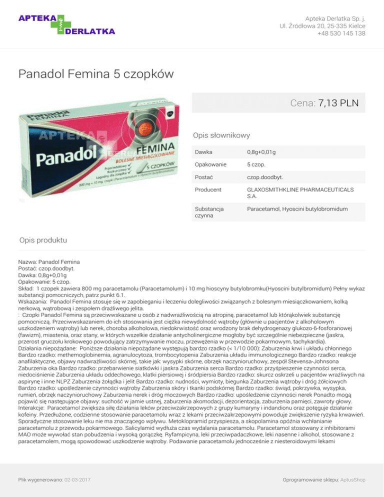 Apteka Derlatka Sp. j. Ul. Źródłowa 20, 25-335 Kielce +48 530 145 138 Panadol Femina 5 czopków Cena: 7,13 PLN Opis słownikowy Dawka 0,8g+0,01g Opakowanie 5 czop. Postać czop.doodbyt. Producent GLAXOSMITHKLINE PHARMACEUTICALS S.A. Substancja czynna Paracetamol, Hyoscini butylobromidum Opis produktu Nazwa: Panadol Femina Postać: czop.doodbyt. Dawka: 0,8g+0,01g Opakowanie: 5 czop. Skład: 1 czopek zawiera 800 mg paracetamolu (Paracetamolum) i 10 mg hioscyny butylobromku(Hyoscini butylbromidum) Pełny wykaz substancji pomocniczych, patrz punkt 6.1. Wskazania: Panadol Femina stosuje się w zapobieganiu i leczeniu dolegliwości związanych z bolesnym miesiączkowaniem, kolką nerkową, wątrobową i zespołem drażliwego jelita. : Czopki Panadol Femina są przeciwwskazane u osób z nadwrażliwością na atropinę, paracetamol lub którąkolwiek substancję pomocniczą. Przeciwwskazaniem do ich stosowania jest ciężka niewydolność wątroby (głównie u pacjentów z alkoholowym uszkodzeniem wątroby) lub nerek, choroba alkoholowa, niedokrwistość oraz wrodzony brak dehydrogenazy glukozo-6-fosforanowej (fawizm), miastenia, oraz stany, w których wszelkie działanie antycholinergiczne mogłoby być szczególnie niebezpieczne (jaskra, przerost gruczołu krokowego powodujący zatrzymywanie moczu, przewężenia w przewodzie pokarmowym, tachykardia). Działania niepożądane: Poniższe działania niepożądane występują bardzo rzadko (< 1/10 000): Zaburzenia krwi i układu chłonnego Bardzo rzadko: methemoglobinemia, agranulocytoza, trombocytopenia Zaburzenia układu immunologicznego Bardzo rzadko: reakcje anafilaktyczne, objawy nadwrażliwości skórnej, takie jak: wysypki skórne, obrzęk naczynioruchowy, zespół Stevensa-Johnsona Zaburzenia oka Bardzo rzadko: przebarwienie siatkówki i jaskra Zaburzenia serca Bardzo rzadko: przyśpieszenie czynności serca, niedociśnienie Zaburzenia układu oddechowego, klatki piersiowej i śródpiersia Bardzo rzadko: skurcz oskrzeli u pacjentów wrażliwych na aspirynę i inne NLPZ Zaburzenia żołądka i jelit Bardzo rzadko: nudności, wymioty, biegunka Zaburzenia wątroby i dróg żółciowych Bardzo rzadko: upośledzenie czynności wątroby Zaburzenia skóry i tkanki podskórnej Bardzo rzadko: świąd, pokrzywka, wysypka, rumień, obrzęk naczynioruchowy Zaburzenia nerek i dróg moczowych Bardzo rzadko: upośledzenie czynności nerek Ponadto mogą pojawić się następujące objawy: suchość w jamie ustnej, zaburzenia akomodacji, dezorientacja, zaburzenia pamięci, zawroty głowy. Interakcje: Paracetamol zwiększa siłę działania leków przeciwzakrzepowych z grupy kumaryny i indandionu oraz potęguje działanie kofeiny. Przedłużone, codzienne stosowanie paracetamolu wraz z lekami przeciwzakrzepowymi powoduje zwiększenie ryzyka krwawień. Sporadyczne stosowanie leku nie ma znaczącego wpływu. Metoklopramid przyspiesza, a skopolamina opóźnia wchłanianie paracetamolu z przewodu pokarmowego. Salicylamid wydłuża czas wydalania paracetamolu. Paracetamol stosowany z inhibitorami MAO może wywołać stan pobudzenia i wysoką gorączkę. Ryfampicyna, leki przeciwpadaczkowe, leki nasenne i alkohol, stosowane z paracetamolem, mogą spowodować uszkodzenie wątroby. Podawanie paracetamolu jednocześnie z niesteroidowymi lekami Plik wygenerowano: 02-03-2017 Oprogramowanie sklepu: AptusShop Apteka Derlatka Sp. j. Ul. Źródłowa 20, 25-335 Kielce +48 530 145 138 przeciwzapalnymi u pacjentów z niewydolnością nerek może nasilać chorobę nerek. Trójpierścieniowe leki przeciwdepresyjne, inhibitory MAO, chinidyna, amantydyna, dyzopiramid i butyrofenon mogą podwyższać działanie antycholinergiczne, wywołać stan pobudzenia i wysoką gorączkę. Butylobromek hioscyny obniżając motorykę i wydzielanie w przewodzie pokarmowym może obniżać absorpcję i efekt farmakologiczny innych równocześnie stosowanych doustnie leków. Antagoniści dopaminy np. metoklopramid może zmniejszać działanie leku na przewód pokarmowy. Dawkowanie: Dorośli i młodzież powyżej 12 lat: 1 czopek (co odpowiada 800 mg paracetamolu i 10 mg butylobromku hioscyny), o ile jest to wskazane 3 do 4 razy na dobę, co 6 godzin. Nie stosować więcej niż 4 czopków na dobę (co odpowiada 3200 mg paracetamolu i 40 mg butylobromku hioscyny). Dzieci i młodzież: Produktu leczniczego nie należy stosować u dzieci w wieku poniżej 12 lat. Maksymalna dawka dobowa paracetamolu dla dorosłych podczas leczenia krótkotrwałego wynosi 4000 mg, a podczas leczenia długotrwałego 2600 mg. Nie należy stosować dawki większej niż zalecana. Nie należy stosować z innymi lekami zawierającymi paracetamol. Bez konsultacji z lekarzem leku nie należy stosować regularnie dłużej niż przez 3 dni. Środki ostrożności: Zalecana jest ostrożność stosowania czopków Panadol Femina u pacjentów ze zwężeniem ujścia zastawki mitralnej, chorobą tętnic wieńcowych oraz ostrym zawałem serca. U pacjentów z owrzodzeniem jelit mogą obniżać motorykę i powodować zaparcia. Należy również ostrożnie stosować lek u pacjentów z refluksem żołądkowo-przełykowym i innymi przewlekłymi zaburzeniami motoryki mięśni gładkich górnego odcinka przewodu pokarmowego lub zwężeniem odźwiernika. U osób w podeszłym wieku Panadol Femina może powodować zaburzenia ze strony OUN, suchość w jamie ustnej i, szczególnie u mężczyzn, zatrzymanie moczu. Jeżeli objawy są poważne należy przerwać podawanie produktu. Terapia powinna być również przerwana, jeżeli pacjent zgłasza jakiekolwiek zaburzenia ostrości widzenia lub ból spowodowany podwyższeniem ciśnienia w gałce ocznej. W czasie stosowania produktu leczniczego Panadol Femina nie należy jednocześnie spożywać alkoholu. Niewskazane jest jednoczesne stosowanie kilku leków zawierających paracetamol (acetaminofen), ponieważ może dojść do przedawkowania paracetamolu. Stosować ostrożnie u osób z niewydolności