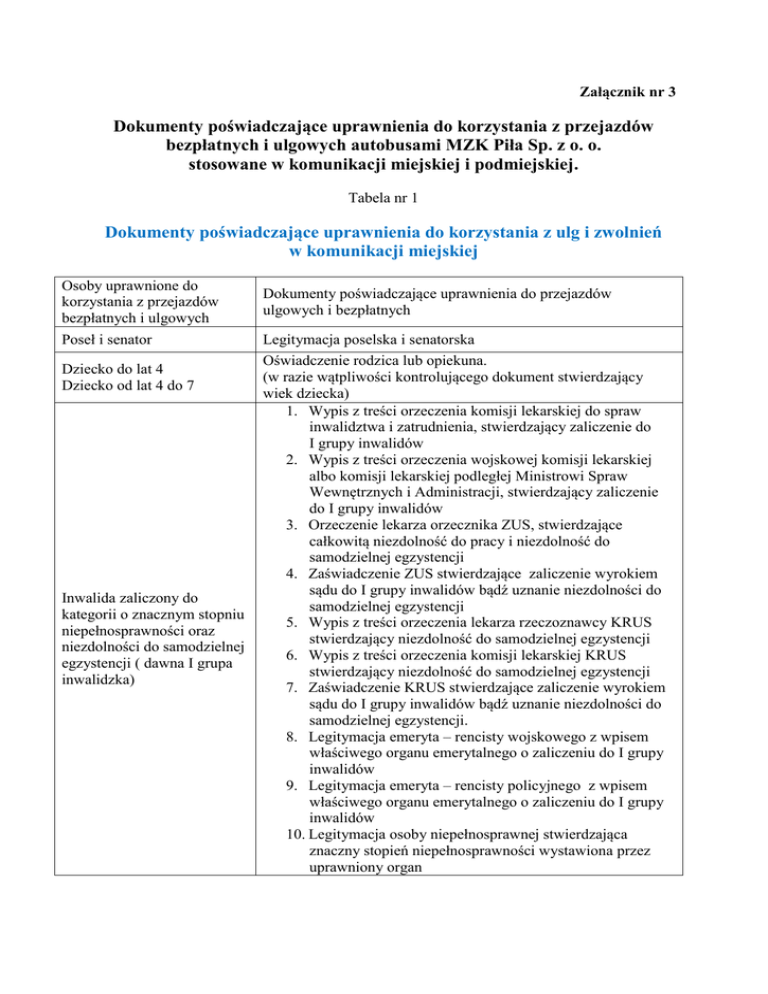 Załącznik nr 3 Dokumenty poświadczające uprawnienia do korzystania z przejazdów bezpłatnych i ulgowych autobusami MZK Piła Sp. z o. o. stosowane w komunikacji miejskiej i podmiejskiej. Tabela nr 1 Dokumenty poświadczające uprawnienia do korzystania z ulg i zwolnień w komunikacji miejskiej Osoby uprawnione do korzystania z przejazdów bezpłatnych i ulgowych Poseł i senator Dziecko do lat 4 Dziecko od lat 4 do 7 Inwalida zaliczony do kategorii o znacznym stopniu niepełnosprawności oraz niezdolności do samodzielnej egzystencji ( dawna I grupa inwalidzka) Dokumenty poświadczające uprawnienia do przejazdów ulgowych i bezpłatnych Legitymacja poselska i senatorska Oświadczenie rodzica lub opiekuna. (w razie wątpliwości kontrolującego dokument stwierdzający wiek dziecka) 1. Wypis z treści orzeczenia komisji lekarskiej do spraw inwalidztwa i zatrudnienia, stwierdzający zaliczenie do I grupy inwalidów 2. Wypis z treści orzeczenia wojskowej komisji lekarskiej albo komisji lekarskiej podległej Ministrowi Spraw Wewnętrznych i Administracji, stwierdzający zaliczenie do I grupy inwalidów 3. Orzeczenie lekarza orzecznika ZUS, stwierdzające całkowitą niezdolność do pracy i niezdolność do samodzielnej egzystencji 4. Zaświadczenie ZUS stwierdzające zaliczenie wyrokiem sądu do I grupy inwalidów bądź uznanie niezdolności do samodzielnej egzystencji 5. Wypis z treści orzeczenia lekarza rzeczoznawcy KRUS stwierdzający niezdolność do samodzielnej egzystencji 6. Wypis z treści orzeczenia komisji lekarskiej KRUS stwierdzający niezdolność do samodzielnej egzystencji 7. Zaświadczenie KRUS stwierdzające zaliczenie wyrokiem sądu do I grupy inwalidów bądź uznanie niezdolności do samodzielnej egzystencji. 8. Legitymacja emeryta – rencisty wojskowego z wpisem właściwego organu emerytalnego o zaliczeniu do I grupy inwalidów 9. Legitymacja emeryta – rencisty policyjnego z wpisem właściwego organu emerytalnego o zaliczeniu do I grupy inwalidów 10. Legitymacja osoby niepełnosprawnej stwierdzająca znaczny stopień niepełnosprawności wystawiona przez uprawniony organ Dzieci i młodzież niepełnosprawna do 16 roku życia Opiekun inwalidy, inwalidy wojennego ( wojskowego) zaliczonego do kategorii o znacznym stopniu niepełnosprawności oraz niezdolności do samodzielnej egzystencji ( dawna I grupa inwalidzka), opiekunowie dzieci i młodzieży niepełnosprawnej do 16 roku życia, towarzyszący im w podróży 11. Orzeczenie Powiatowego Zespołu ds. Orzekania o Niepełnosprawności o znacznym stopniu niepełnosprawności lub legitymacja osoby niepełnosprawnej, wydana przez PZON. (dokumenty o których mowa w pkt. 1 – 7 okazuje się wraz z dowodem osobistym lub innym dokumentem poświadczającym tożsamość) a)Dzieci i młodzież uczęszczające do szkoły 1. Legitymacja szkolna dla uczniów dotkniętych inwalidztwem lub niepełnosprawnych 2. Legitymacja szkolna wraz z dokumentem wymienionym poniżej ( pkt. b) ) 3. Legitymacja osoby niepełnosprawnej, która nie ukończyła 16 roku życia, wystawiona przez uprawniony organ 4. Orzeczenie o niepełnosprawności wydane przez uprawniony organ. b)Dzieci i młodzież nie uczęszczające do szkoły 1. Legitymacja osoby niepełnosprawnej, która nie ukończyła 16 roku życia, wystawiona przez uprawniony organ 2. Wypis z treści orzeczenia komisji lekarskiej do spraw inwalidztwa i zatrudnienia stwierdzający zaliczenie do jednej z grup inwalidów 3. Wypis z treści orzeczenia lekarza orzecznika ZUS stwierdzający częściową niezdolność do pracy, całkowitą niezdolność do pracy i niezdolność do samodzielnej egzystencji 4. Orzeczenie o niepełnosprawności wydane przez uprawniony organ. 1. Oświadczenie inwalidy zaliczonego do kategorii o znacznym stopniu niepełnosprawności oraz niezdolności do samodzielnej egzystencji ( dawna I grupa) 2. Oświadczenie inwalidy wojennego (wojskowego) 3. Oświadczenie opiekuna dziecka niepełnosprawnego do 16 roku życia o sprawowaniu faktycznej opieki nad dzieckiem niepełnosprawnym. Osoby, które ukończyły 70 lat Dowód osobisty lub inny imienny dokument tożsamości poświadczający osiągnięcie przez osobę wymaganego wieku Uczniowie szkół specjalnych, dziennych ośrodków rehabilitacji Ważna legitymacja szkolna Honorowi dawcy krwi I Aktualna legitymacja zasłużonego honorowego dawcy krwi PCK stopnia zrzeszeni w Zarządzie I stopnia oraz aktualne zaświadczenie wydane przez Zarząd Okręgu PCK Rejonowy PCK w Pile o uprawnieniu. Uczniowie szkół podstawowych , gimnazjum, szkól ponadgimnazjalnych, w wieku do 22 lat, studenci 1. Ważna legitymacja szkolna 2. Ważna legitymacja studencka 3. Międzynarodowa legitymacja studencka ISIC wraz z dokumentem tożsamości Inwalida wojenny (wojskowy) Książeczka inwalidy wojennego ( wojskowego) Kombatant Legitymacja osoby represjonowanej ( kombatancka) Emeryci i renciści oraz ich współmałżonkowie na których pobierane są dodatki rodzinne 1. Ważna legitymacja emeryta rencisty Tabela nr 2 Dokumenty poświadczające uprawnienia do korzystania z ulg i zwolnień w komunikacji podmiejskiej ( jeżeli grupa społeczna jest uprawniona do ulg i zwolnień z odpłatności za przejazdy w komunikacji miejskiej i podmiejskiej jednocześnie, dokumenty poświadczające prawo do korzystania z ulg i zwolnień wyszczególnione są w tabeli nr 1) Osoby uprawnione do korzystania z przejazdów bezpłatnych i ulgowych Dokumenty poświadczające uprawnienia do przejazdów ulgowych i bezpłatnych Straż graniczna (na służbie). Funkcjonariusze celni (na służbie). Policjanci (na służbie). Żandarmeria wojskowa (na służbie). Legitymacja służbowa oraz zaświadczenie o wykonywaniu określonych czynności służbowych wystawione przez Szefa danej placówki Osoby niewidome i ociemniałe, jeśli nie są uznane za osoby niezdolne do samodzielnej egzystencji, o umiarkowanym lub lekkim stopniu niepełnosprawności 1. Wypis z treści orzecz