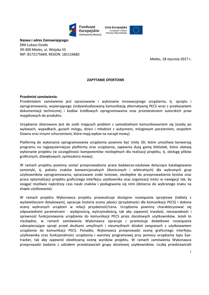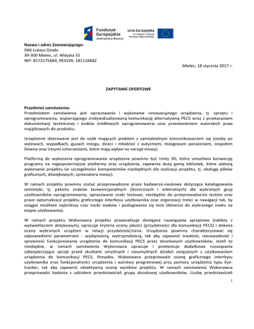 Nazwa i adres Zamawiającego: DKK Łukasz Działo 39-300 Mielec, ul. Wiejska 55 NIP: 8172175669, REGON: 181116682 Mielec, 18 stycznia 2017 r. ZAPYTANIE OFERTOWE Przedmiot zamówienia: Przedmiotem zamówienia jest opracowanie i wykonanie innowacyjnego urządzenia, tj. sprzętu i oprogramowania, wspierającego zindywidualizowaną komunikację alternatywną PECS wraz z przekazaniem dokumentacji technicznej i kodów źródłowych oprogramowania oraz przeniesieniem autorskich praw majątkowych do produktu. Urządzenie skierowane jest do osób mających problem z samodzielnym komunikowaniem się (osoby po wylewach, wypadkach, guzach mózgu, dzieci i młodzież z autyzmem, mózgowym porażeniem, zespołem Downa oraz innymi schorzeniami, które mają wpływ na narząd mowy). Platformą do wykonania oprogramowania urządzenia powinno być Unity 3D, które umożliwia konwersję programu na najpopularniejsze platformy oraz urządzenia, zapewnia dużą gamę bibliotek, które ułatwią wykonanie projektu (w szczególności komponentów niezbędnych dla realizacji projektu, tj. obsługę plików graficznych, dźwiękowych, syntezatora mowy). W ramach projektu powinny zostać przeprowadzone prace badawczo-naukowe dotyczące katalogowania semiotyki, tj. pakietu znaków konwencjonalnych (ikonicznych i arbitralnych) dla wybranych grup użytkowników oprogramowania, opracowane znaki testowe, niezbędne do przeprowadzenia testów oraz prace optymalizacji projektu graficznego interfejsu użytkownika oraz organizacji treści w nawigacji tak, by osiągać możliwie najkrótszy czas nauki znaków i posługiwania się nimi (dotarcia do wybranego znaku na etapie użytkowania). W ramach projektu Wykonawca projektu przeanalizuje dostępne rozwiązania sprzętowe (tablety z wyświetlaczem dotykowym), opracuje kryteria oceny jakości (przydatności dla komunikacji PECS) i dokona oceny wybranych urządzeń w relacji przydatność/cena. Urządzenia powinny charakteryzować się odpowiednimi parametrami - wydajnością, wytrzymałością, tak aby zapewnić trwałość, niezawodność i sprawność funkcjonowania urządzenia do komunikacji PECS przez docelowych użytkowników. Jeżeli to niezbędne, w ramach zamówienia Wykonawca opracuje i przetestuje dodatkowe rozwiązania zabezpieczające sprzęt przed skutkami umyślnych i nieumyślnych działań związanych z użytkowaniem urządzenia do komunikacji PECS. Ponadto, Wykonawca przeprowadzi ocenę graficznego interfejsu użytkownika oraz funkcjonalności urządzenia i warstwy programowej przy pomocy urządzenia typu Eyetracker, tak aby zapewnić obiektywną ocenę wyników projektu. W ramach zamówienia Wykonawca przeprowadzi badania z udziałem przedstawicieli grupy docelowej użytkowników. Liczbę przedstawicieli 1 grupy docelowej wraz z uzasadnieniem przedstawi Wykonawca na etapie realizacji zamówienia. Najważniejsze funkcje urządzenia: 1. Prezentacja znaków wybranych przez użytkownika aplikacji oraz skojarzonych z tym znakiem treści (słowa, wyrażenia, zwroty) 2. Prezentacja słów, zwrotów lub wyrażeń wybranych przez użytkownika aplikacji oraz skojarzonych z tym słowem (zwrotem lub wyrażeniem) znaków 3. Podpowiadanie powiązanych kontekstowo ze znakiem innych znaków w obrębie tej samej tablicy znaków 4. Podpowiadanie powiązanych kontekstowo ze słowem (również zwrotem lub wyrażeniem) innych słów (również zwrotów lub wyrażeń) w obrębie tej samej tablicy znaków 5. Język interfejsu: polski 6. Gotowe tablice komunikacyjne (w ramach projektu Wykonawca przygotuje zbiór demonstracyjny, który zostanie wykorzystany w badaniach eye trackerem). 7. Możliwość dodawania własnych znaków do gotowych tablic 8. Wymiana znaków w gotowych tablicach 9. Tworzenie własnych tablic znaków 10. Dodawanie zdjęć 11. Tworzenie kart/tablic ze zdjęć 12. Obsługa symboli kolorowych 13. Obsługa symboli monochromatycznych 14. Synteza mowy – wymowa żeńska i męska, głos żeński i męski 15. Połączenie z Internetem celem aktualizacji treści (znaki, słowniki, tablice komunikacyjne) 16. Możliwość instalacji prostych elementów zwiększających atrakcyjność oprogramowania, tj. animacje, piosenki, proste opowiadania, mini gry – jako forma nagrody za poprawne wykonanie określonej czynności 17. Narzędzie rysowania znaków 18. Możliwość geolokalizacji użytkownika (dla urządzeń mobilnych posiadających niezbędne czujniki) 19. Możliwość dostosowania graficznego interfejsu użytkownika do potrzeb użytkownika (w szczególności wielkość przycisków, kolory, rozmieszczenie elementów), zapamiętywanie ustawień 20. Alerty – wołanie o pomoc (łatwo dostępny przycisk zawsze widoczny na ekranie) 21. Podział na panel administratora (opiekun) i użytkownika (podopieczny) 22. Dobór optymalnej konstrukcji urządzenia, przez konstrukcję rozumie się odpowiedni dobór urządzenia i jego obudowy oraz dodatkowych (fizycznych) zabezpieczeń w zależności od grupy użytkowników. Niektóre grupy użytkowników końcowych mogą przejawiać zachowania mniej specyficzne dla swojej jednostki chorobowej (np. zachowania niepożądane dla osób autystycznych to destrukcja, agresja, autoagresja, nadaktywność) dlatego gotowe urządzenia muszą być wytrzymałe oraz spełniać wymogi bezpieczeństwa dla każdej z grup użytkowników docelowych. W szczególności zamówienie obejmuje następujące elementy: Etap I: Opracowanie architektury innowacyjnego urządzenia do komunikacji PECS z przygotowaniem charakterystyki komunikacji z osobami mającymi trudności w porozumiewaniu się 2 Rezultaty zadania będą odpowiadały fazie koncepcji, tj. zostaną przygotowane: 1. Opis podstawowych właściwości urządzenia do komunikacji PECS . 2. Analizy teoretyczne z wykorzystaniem modelowania i symulacji komputerowej dla poszczególnych komponentów architektury – modułów systemu (serwer, komunikacja, urządzenie do komunikacji, aplikacja dla innowacyjn