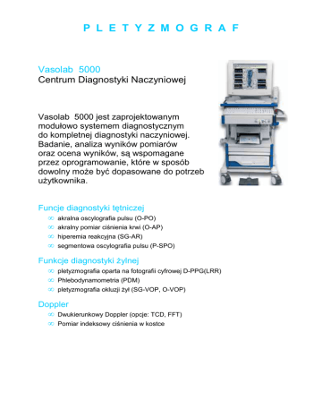 P L E T Y Z M O G R A F Vasolab 5000 Centrum Diagnostyki Naczyniowej Vasolab 5000 jest zaprojektowanym modułowo systemem diagnostycznym do kompletnej diagnostyki naczyniowej. Badanie, analiza wyników pomiarów oraz ocena wyników, są wspomagane przez oprogramowanie, które w sposób dowolny moŜe być dopasowane do potrzeb uŜytkownika. Funcje diagnostyki tętniczej • akralna oscylografia pulsu (O-PO) • akralny pomiar ciśnienia krwi (O-AP) • hiperemia reakcyjna (SG-AR) • segmentowa oscylografia pulsu (P-SPO) Funkcje diagnostyki Ŝylnej • pletyzmografia oparta na fotografii cyfrowej D-PPG(LRR) • Phlebodynamometria (PDM) • pletyzmografia okluzji Ŝył (SG-VOP, O-VOP) Doppler • Dwukierunkowy Doppler (opcje: TCD, FFT) • Pomiar indeksowy ciśnienia w kostce Baza Danych • Automatyczna reorganizacja • Archiwizacja i przywracanie na dowolny nośnik Interfejsy • GDT / BDT oraz DICOM • Połączenie sieciowe (opcjonalnie) Vasocart Zintegrowany zestaw jezdny 1 2 1. 2. 3. 4. 5. 6. 7. 8. 9. uchwyt na butelki z Ŝelem uchwyt na czujniki gniazdo myszki miejsce na dodatkowe przedmioty uchwyt na głowice pomiarowe półka zintegrowany transformator separujący wyłącznik główny miejsce na przełącznik pedałowy Projekt i wymagania Dla firmy ELCAT, zaprojektowanie oznacza optymalne dopasowanie do wymaganej funkcjonalności, najlepszej moŜliwej integracji urządzeń składowych i wyposaŜenia dodatkowego (zgodnie z aktualnymi standardami) w zgodzie z wymaganiami estetycznymi. Vasocart spełnia w sposób optymalny wymagania jednostki vasolab 5000. Budowa modułowa umoŜliwia dopasowanie do indywidualnych indywidualnych wymagań naszych klientów. Urządzenia składowe, dodatkowe wyposaŜenie i czujniki są zintegrowane w sposób ergonomiczny, co pomaga przyspieszyć rutynowe badanie. Osoba badająca moŜe skoncentrować się na potrzebach pacjenta i wykonywaniu badania. Rozkład ekranów w jasny sposób ułatwia obsługę oprogramowania Interfejs uŜytkownika • • • rozkład ekranów obsługi znakomicie ułatwia poruszanie się po programie i minimalizuje czas potrzebny do jego opanowania obsługa przyjazna uŜytkownikowi z paskami, rozwijanymi menu i funkcjami interaktywnymi moŜliwość obsługi za pomocą myszki, klawiatury, lub pilota „vasocontrol” Przed rozpoczęciem badania • dane pacjenta mogą być wprowadzone zarówno ręcznie, za pomocą czytnika kart, lub pobrane z bazy danych Badanie – ekran roboczy • w czasie badania, uŜytkownik w • • sposób ciągły otrzymuje informacje na temat stanu systemu aktywne pomiary są wyświetlane na ekranie w czasie rzeczywistym ustawienia zdefiniowane przed rozpoczęciem badania mogą być łatwo zmienione Wyniki – ekran roboczy • • • grupy wyników pogrupowane są w sposób umoŜliwiający łatwe ich odnalezienie moŜliwość poprawienia markerów ustawień wyniki mogą zostać zapisane w bazie danych. UmoŜliwia to ich obróbkę w późniejszym czasie. Wyniki badania • • • na wydruku widoczne są wszystkie dane dotyczące osoby badającej, szpitala, jednostki, oraz komentarze dot. Badania wydruk moŜe być skonfigurowany zarówno do czarno-białej, jak i kolorowej drukarki system VL5000 współpracuje z interfejsami GDT, BDT oraz DICOM słuŜącymi do przesyłania wyników do istniejących systemów informatycznych Oprogramowanie „Vasoview” do zdalnej analizy MoŜliwości sieciowe systemu VL 5000 pozwalają na podłączenie go do wielu stanowisk komputerowych. KaŜde z nich moŜe być wykorzystywane do innej funkcji np.: przeprowadzenia badania, wstawianiu komentarzy, lub drukowania wyników. Funkcje diagnostyki tętniczej Akralna oscylografia pulsu O-PO Automatyczna kalibracja uwzględnia dopasowanie do róŜnej struktury warstwy skórnej dla róŜnych pacjentów. Czujniki optyczne mierzą pulsację. Do wyboru mamy następujące typy czujników: • czujniki transmisyjne • czujniki odbicia • czujniki mikro-obliczeniowe Akralny pomiar ciśnienia krwi O-AD Pomiar ten jest wykonywany za pomocą manszetów, czujniki optyczne są wykorzystywane do zapisu pulsu. Kompresor zapewnia prawidłowe napełnianie manszetów, jak równieŜ kontroluje wypuszczanie powietrza. Standardowe badanie jest kontrolowane przez program badający (moŜliwe 5 róŜnych lokalizacji manszetu). Analiza krzywych moŜe być przeprowadzona na dwa sposoby: • automatyczny odczyt ciśnienia skurczowego • ręczny pomiar na wykresie pulsu Segmentowa oscylografia pulsu Podczas tego typu badania, ciśnienie w manszetach jest kontrolowane przez kompresor. Program rozpoczyna badanie przy wysokim poziomie ciśnienia w manszecie. Upuszczanie powietrza moŜe być w tym przypadku kontrolowany z dowolną prędkością przez badającego. Sam program działa w trybie automatycznym. • pomiar automatyczny z maksymalnie trzema parami manszetów • moŜliwość pomiaru do 7 segmentów z maksymalnie 10 poziomami wartości ciśnienia Hiperemia reakcyjna SG-AR Podczas hiperemii, manszety są pompowane do wartości ciśnienia powyŜej skurczowego. Po zakończeniu fazy okluzyjnej czytana jest wartość rezerwy tętniczej. Ustawienia badania mogą być indywidualnie zmieniane. • Ciśnienie okluzji moŜe być ustawione do 250 mmHg, podczas fazy okluzyjnej • Czas okluzji moŜe być zmieniany od 2 do 4 minut podczas fazy okluzji Funkcje diagnostyki Ŝylnej (opcjonalnie) Foto-pletyzmografia cyfrowa D-PPG / LRR Automatyczna kalibracja uwzględnia dopasowanie do róŜnej struktury warstwy skórnej dla róŜnych pacjentów. • Redukcja mocy pompy Ŝylnej (amplituda od krzywej) jest tutaj niezaleŜna początkowej cyrkulacji krwi i staje się moŜliwa do odczytu i policzalna • wykorzystanie metod akustycznych optycznych do określania taktowania i Phlebodynamometria PDM W trakcie phlepodynamometrii, zapisywane jest bezwzględne ciśnienie Ŝylne. Metoda ta jest „złotym środkiem” w profesjonalnych ocenach. • wykorzystanie metod akus