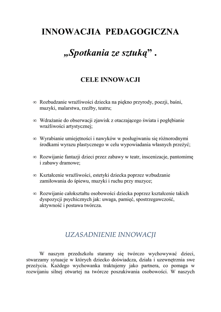 INNOWACJIA PEDAGOGICZNA „Spotkania ze sztuką” . CELE INNOWACJI • Rozbudzanie wraŜliwości dziecka na piękno przyrody, poezji, baśni, muzyki, malarstwa, rzeźby, teatru; • WdraŜanie do obserwacji zjawisk z otaczającego świata i pogłębianie wraŜliwości artystycznej; • Wyrabianie umiejętności i nawyków w posługiwaniu się róŜnorodnymi środkami wyrazu plastycznego w celu wypowiadania własnych przeŜyć; • Rozwijanie fantazji dzieci przez zabawy w teatr, inscenizacje, pantomimę i zabawy dramowe; • Kształcenie wraŜliwości, estetyki dziecka poprzez wzbudzanie zamiłowania do śpiewu, muzyki i ruchu przy muzyce; • Rozwijanie całokształtu osobowości dziecka poprzez kształcenie takich dyspozycji psychicznych jak: uwaga, pamięć, spostrzegawczość, aktywność i postawa twórcza. UZASADNIENIE INNOWACJI W naszym przedszkolu staramy się twórczo wychowywać dzieci, stwarzamy sytuacje w których dziecko doświadcza, działa i uzewnętrznia swe przeŜycia. KaŜdego wychowanka traktujemy jako partnera, co pomaga w rozwijaniu silnej otwartej na twórcze poszukiwania osobowości. W naszych działaniach wspieramy dzieci w ich rozwoju, inicjatywach, samodzielności, poszukiwaniu twórczych rozwiązań i radzeniu sobie z problemami. DąŜymy do tego, aby aktywność twórcza dziecka rozwijała się w kaŜdym działaniu, aby stała się nawykiem i wewnętrzną potrzebą. Stwarzamy jak najlepsze warunki rozwoju fizycznego, umysłowego, emocjonalnego i społecznego. Od 12 lat prowadzimy innowację pedagogiczną o charakterze artystycznym (plastyka, muzyka, teatr ), kultywowanie tradycji regionu świętokrzyskiego. W sposób róŜnorodny i wielostronny inspirujemy dzieci do twórczych zabaw plastycznych, muzycznych i teatralnych. UmoŜliwia to naszym wychowankom wyraŜanie swoich przeŜyć, pozwala się przenieść w krainę marzeń i fantazji. WaŜne miejsce w naszej innowacji zajmuje twórczość plastyczna, która jest najpowszechniejszym zjawiskiem w spontanicznej i ekspresyjnej działalności dzieci. W swoich wytworach plastycznych dzieci ujawniają swój wewnętrzny model świata, zabarwiony silnymi przeŜyciami emocjonalnymi. Bogatym źródłem inspiracji są utwory literatury dziecięcej, bezpośrednie kontakty z otoczeniem społecznym, przyrodniczym, techniką i sztuką. Dzieci eksperymentują róŜnymi narzędziami, materiałami, które są gromadzone w bardzo bogatych kącikach plastycznych. Dzięki temu powstało wiele pięknych, bogatych w formę, tematykę i techniki barwnych prac plastycznych, które były eksponowane w salach zajęć, w zorganizowanych galeriach oraz na wystawie w głównym holu. Ponadto gromadzone są w teczko-albumach. Dzieci podejmowały róŜne tematy konkursowe: • „Bądź bezpieczny na drodze”; • „Cztery pory roku”; • „Przyroda wokół nas, czyli co nas cieszy, a co nas smuci”, zorganizowany przez PP nr 21 i PSP nr 10 W Ostrowcu Św. (dwa szczególne wyróŜnienia); • „Ekologiczna lalka wspólną zabawką Zjednoczonej Europy”, zorganizowany prze PP nr 12 w Ostrowcu Św.(I miejsce) • „Ostrowiec Św. moim domem”, zorganizowany przez PP nr 5 w Ostrowcu Św.; • ”List do świata”, zorganizowany przez redakcję czasopisma „BliŜej Przedszkola” (wyróŜnienie); • „Moje ulubione zwierzątko”, zorganizowany przez ODS „Malwa”; • „Mój dzień z misiem”, zorganizowany przez Akademię Misia Haribo w Warszawie; • „Przyjaciel przyrody – to ja”, zorganizowany przez Przedszkole nr 8 w Gnieźnie; • „Czyste powietrze wokół nas”, zorganizowany przez Marszałka Województwa Świętokrzyskiego przy współpracy Wojewódzkiego Funduszu Ochrony Środowiska i Gospodarki Wodnej w Kielcach (wyróŜnienie); • „Płynie Wisła płynie”; • „Drzewo moich marzeń” (I miejsce); • „KsiąŜeczka przedszkolaka” zorganizowany przez Akademię Misia Haribo w Warszawie; • „Piękna przyroda – zdrowy świat”, zorganizowany przez Urząd Marszałkowki w Kielcach (I miejsce); • „Przyroda wokół nas” zorganizowany przez PP nr 15 w Sosnowcu; • „Pszczoła - święty owad” (I miejsce). Konkursy literacko – plastyczne”: • „Płynie woda”, ogólnopolski konkurs zorganizowany przez PP w Ustroniu Morskim (III miejsce i wyróŜnienie); • „Moja przytulanka” – konkurs krasomówczy (4 wyróŜnienia); • „Wszystkie przedszkolaki kochają zwierzaki” (dwa pierwsze miejsca, jedno drugie). Konkursy wiedzy o przyrodzie: • Quiz przyrodniczo – plastyczny „Ostrowiec Św. – moim miastem”, PP nr 15 w Ostrowcu Św.; • I, II, III, IV międzyprzedszkolny konkurs wiedzy o przyrodzie „Z przyrodą na ty”, zorganizowany przez PP nr 15 w Ostrowcu Św.; Olimpiady: • I Ogólnopolska Olimpiada w kategorii muzyczno – plastycznej, zorganizowana przez Centrum Edukacji ATUT (I miejsce w kategorii dzieci 5-letnich, I miejsce w kategorii dzieci 6-letnich); Przedszkole otrzymało wiele podziękowań, wyróŜnień i nagród za udział w wymienionych konkursach. Podsumowaniem corocznej pracy było zorganizowane w placówce międzyprzedszkolnego konkursu „Galeria Czterech Pór Roku”, a w ramach działań ekologicznych wystawy „Dlaczego Ziemia płacze”, na której prezentowane były prace płaskie i przestrzenne. Przedszkolaki poznawały Ŝycie i twórczość najwybitniejszych malarzy: J. Matejko, St. Wyspiański, J. Kossak. Oglądały równieŜ aktualne wystawy i uczestniczyły w warsztatach plastycznych w Biurze Wystaw Artystycznych: • „Lwowskie klimaty”; • wystawa prac malarskich artysty plastyka St. Baja; • VII Jesienny Salon Sztuki; • wystawę prac dyplomowych młodzieŜy z liceum plastycznego w Kielcach „Dziedzictwo kultury Europy”; • wystawę prac plenerowych „Wojciechowice 2006”; • „Malarstwo dziecięce”; • „Malarstwo Edwarda Dwornika”. Dzieci poznały wystawę prac artysty ludowego Edwarda Ziarko w „Galerii pod chmur