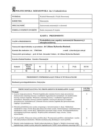 POLITECHNIKA RZESZOWSKA im. I. Łukasiewicza WYDZIAŁ Wydział Matematyki i Fizyki Stosowanej KIERUNEK Matematyka SPECJALNOŚĆ Zastosowania matematyki w ekonomii FORMA I STOPIEŃ STUDIÓW Studia stacjonarne II stopnia KARTA PRZEDMIOTU Probabilistyczne aspekty matematyki finansowej i ubezpieczeniowej NAZWA PRZEDMIOTU Nauczyciel odpowiedzialny za przedmiot: dr Liliana Rybarska-Rusinek Kontakt dla studentów: tel. 178651666 e-mail: [email protected] Nauczyciel/e prowadzący: prof. dr hab. Alexander Linkov, dr Liliana Rybarska-Rusinek Katedra/Zakład/Studium Katedra Matematyki Semestr 3 całkowita liczba godzin 90 W 45 C L P (S) 45 ECTS 7 PRZEDMIOTY POPRZEDZAJĄCE WRAZ Z WYMAGANIAMI Rachunek prawdopodobieństwa. Statystyka. TREŚCI KSZTAŁCENIA WG PROWADZONYCH RODZAJÓW ZAJĘĆ Wykład: 1. Losowa stopa procentowa. Wartość kapitału jako zmienna losowa stopy procentowej. Zastosowanie zmiennej losowej o rozkładzie logarytmiczno-normalnym do modelowania losowej wartości kapitału. Własności zmiennej losowej o rozkładzie logarytmicznonormalnym. Parametry losowej wartości kapitału o losowych okresowych stopach procentowych i dyskontowych. Zmienna losowa wartości kapitału dla oprocentowania ciągłego i jej parametry. 2. Mierniki probabilistyczne ryzyka związanego z inwestowaniem w akcje. Odchylenie standardowe stopy zwrotu akcji jako klasyczna miara ryzyka. Semiwariancja i semiodchylenie standardowe stopy zwrotu akcji. Odchylenie przeciętne stopy zwrotu. Prawdopodobieństwo nieosiągnięcia poziomu aspiracji. Współczynnik zmienności stopy zwrotu. Teoria uŜyteczności. LICZBA GODZIN 6 6 3. Teoria portfela. Klasyczne miary portfela akcji. Wyznaczanie portfela o minimalnym ryzyku lub maksymalnym dochodzie. Metoda stochastycznej dominacji w teorii portfela. 6 4. Modele rynku kapitałowego. Model jednowskaźnikowy Sharpe’a. Modele równowagi rynku kapitałowego: model wyceny aktywów kapitałowych CAPM teoria arbitraŜu cenowego APT. 6 5. Instrumenty pochodne. Opcje i ich ogólna charakterystyka. Wartość opcji. Analiza wraŜliwości opcji. Wycena opcji. Model dwumianowy wyceny opcji. Model Blacka- Scholesa. Strategie opcyjne. Kontrakty futures i forward oraz ich charakterystyka. Swapy i ich charakterystyka. 6 6. Model indywidualnego ryzyka ubezpieczeniowego. Charakterystyka portfeli ubezpieczeniowych. Aproksymacja rozkładu sumy zmiennych losowych. 3 7. Model kolektywnego ryzyka ubezpieczeniowego. ZłoŜony rozkład Poissona i jego własności. Rozkład liczby szkód i rozkład indywidualnej kwoty szkód. Zagregowany rozkład szkód i jego aproksymacja. 4 8. Proces ryzyka w działalności ubezpieczeniowej i teoria ruiny. NadwyŜka finansowa. Prawdopodobieństwo ruiny (w skończonym i nieskończonym horyzoncie czasowym) oraz metody jego wyznaczania. Współczynnik dostosowawczy. Pierwsza nadwyŜka poniŜej stanu początkowego. 9. Kalkulacja składki w ubezpieczeniach Ŝyciowych. Składka netto dla polis dyskretnych, ciągłych i mieszanych. Rezerwy składek netto. Składki i rezerwy brutto. Ćwiczenia: 1. Losowa stopa procentowa. Wartość kapitału jako zmienna losowa stopy procentowej. Zastosowanie zmiennej losowej o rozkładzie logarytmiczno-normalnym do modelowania losowej wartości kapitału. Własności zmiennej losowej o rozkładzie logarytmicznonormalnym. Parametry losowej wartości kapitału o losowych okresowych stopach procentowych i dyskontowych. Zmienna losowa wartości kapitału dla oprocentowania ciągłego i jej parametry. 2. Mierniki probabilistyczne ryzyka związanego z inwestowaniem w akcje. Odchylenie standardowe stopy zwrotu akcji jako klasyczna miara ryzyka. Semiwariancja i semiodchylenie standardowe stopy zwrotu akcji. Odchylenie przeciętne stopy zwrotu. Prawdopodobieństwo nieosiągnięcia poziomu aspiracji. Współczynnik zmienności stopy zwrotu. Teoria uŜyteczności. 4 4 6 6 3. Teoria portfela. Klasyczne miary portfela akcji. Wyznaczanie portfela o minimalnym ryzyku lub maksymalnym dochodzie. Metoda stochastycznej dominacji w teorii portfela. 6 4. Modele rynku kapitałowego. Model jednowskaźnikowy Sharpe’a. Modele równowagi rynku kapitałowego: model wyceny aktywów kapitałowych CAPM teoria arbitraŜu cenowego APT. 6 5. Instrumenty pochodne. Opcje i ich ogólna charakterystyka. Wartość opcji. Analiza wraŜliwości opcji. Wycena opcji. Model dwumianowy wyceny opcji. Model Blacka- Scholesa. Strategie opcyjne. Kontrakty futures i forward oraz ich charakterystyka. Swapy i ich charakterystyka. 6 6. Model indywidualnego ryzyka ubezpieczeniowego. Charakterystyka portfeli ubezpieczeniowych. Aproksymacja rozkładu sumy zmiennych losowych. 3 7. Model kolektywnego ryzyka ubezpieczeniowego. ZłoŜony rozkład Poissona i jego własności. Rozkład liczby szkód i rozkład indywidualnej kwoty szkód. Zagregowany rozkład szkód i jego aproksymacja. 4 8. Proces ryzyka w działalności ubezpieczeniowej i teoria ruiny. NadwyŜka finansowa. Prawdopodobieństwo ruiny (w skończonym i nieskończonym horyzoncie czasowym) oraz metody jego wyznaczania. Współczynnik dostosowawczy. Pierwsza nadwyŜka poniŜej stanu początkowego. 9. Kalkulacja składki w ubezpieczeniach Ŝyciowych. Składka netto dla polis dyskretnych, ciągłych i mieszanych. Rezerwy składek netto. Składki i rezerwy brutto. Liczba godzin łącznie 4 4 45+45=90 DyŜury dydaktyczne (konsultacje): w terminach podanych w harmonogramie pracy jednostki EFEKTY KSZTAŁCENIA - UMIEJĘTNOŚCI KSZTAŁCENIA Po zaliczeniu tego przedmiotu studenci powinni posiadać umiejętność modelowania pewnych zjawisk finansowych i ubezpieczeniowych za pomocą pojęć i metod probabilistycznych. FORMA I WARUNKI ZALICZENIA PRZEDMIOTU (RODZAJU ZAJĘĆ) Warunkiem zaliczenia ćwiczeń jest aktywny w nich udział oraz pozytywna ocena z pisemnych kolokwiów. Warunkiem zaliczenia przedmiotu jest uczestnictwo w wykładach, zaliczenie ćwiczeń oraz pozytywna ocena z egzaminu pisemnego WYKAZ LITERATURY PODSTAWOWEJ 1. Jajuga K., Jaj