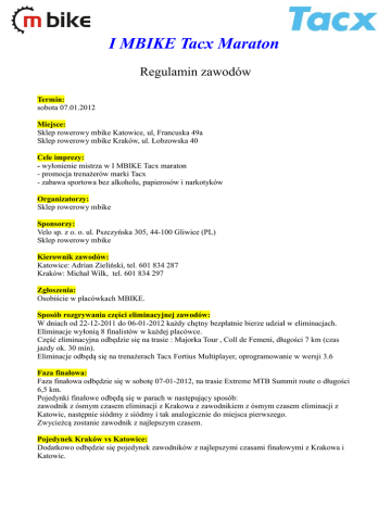 I MBIKE Tacx Maraton Regulamin zawodów Termin: sobota 07.01.2012 Miejsce: Sklep rowerowy mbike Katowice, ul, Francuska 49a Sklep rowerowy mbike Kraków, ul. Łobzowska 40 Cele imprezy: - wyłonienie mistrza w I MBIKE Tacx maraton - promocja trenażerów marki Tacx - zabawa sportowa bez alkoholu, papierosów i narkotyków Organizatorzy: Sklep rowerowy mbike Sponsorzy: Velo sp. z o. o. ul. Pszczyńska 305, 44-100 Gliwice (PL) Sklep rowerowy mbike Kierownik zawodów: Katowice: Adrian Zieliński, tel. 601 834 287 Kraków: Michał Wilk, tel. 601 834 297 Zgłoszenia: Osobiście w placówkach MBIKE. Sposób rozgrywania części eliminacyjnej zawodów: W dniach od 22-12-2011 do 06-01-2012 każdy chętny bezpłatnie bierze udział w eliminacjach. Eliminacje wyłonią 8 finalistów w każdej placówce. Część eliminacyjna odbędzie się na trasie : Majorka Tour , Coll de Femeni, długości 7 km (czas jazdy ok. 30 min). Eliminacje odbędą się na trenażerach Tacx Fortius Multiplayer, oprogramowanie w wersji 3.6 Faza finałowa: Faza finałowa odbędzie się w sobotę 07-01-2012, na trasie Extreme MTB Summit route o długości 6,5 km. Pojedynki finałowe odbędą się w parach w następujący sposób: zawodnik z ósmym czasem eliminacji z Krakowa z zawodnikiem z ósmym czasem eliminacji z Katowic, następnie siódmy z siódmy i tak analogicznie do miejsca pierwszego. Zwycieżcą zostanie zawodnik z najlepszym czasem. Pojedynek Kraków vs Katowice: Dodatkowo odbędzie się pojedynek zawodników z najlepszymi czasami finałowymi z Krakowa i Katowic. Program zawodów: 10:15 - rozpoczęcie zawodów 10:30 - 14:00 pojedynki finałowe 14:00 - 14:30 pojedynek Kraków vs Katowice 15:00 - ogłoszenie wyników i rozdanie nagród. Ilość nagrodzonych: Pierwsze 3 miejsca z pojedynków finałowych oraz uczestnicy pojedynku Kraków vs Katowice. Rodzaje nagród: Łączna pula nagród wyniesie nie mniej niż 1000 zł Opłaty startowe: Organizatorzy nie pobierają opłaty startowej Uwagi: - Ubezpieczenie zawodników we własnym zakresie! - Na rowerze startowym dostępne będą pedały w systemie SPD lub pedały „standardowe”. - W czasie rozgrywek zawodnicy i otrzymają poczęstunek - Regulamin może ulec zmianie - Relacja oraz wyniki zawodów zamieszczone zostaną na stronie internetowej www.mbike.pl oraz na http://www.facebook.com/mbikepl