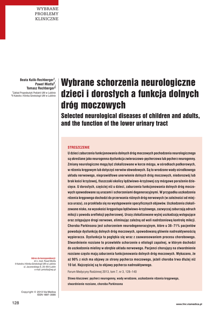WYBRANE PROBLEMY KLINICZNE Beata Kulik-Rechberger1, Paweł Miotła2, Tomasz Rechberger2 1Zakład 2II Propedeutyki Pediatrii UM w Lublinie Katedra i Klinika Ginekologii UM w Lublinie Wybrane schorzenia neurologiczne dzieci i dorosłych a funkcja dolnych dróg moczowych Selected neurological diseases of children and adults, and the function of the lower urinary tract STRESZCZENIE U dzieci zaburzenia funkcjonowania dolnych dróg moczowych pochodzenia neurologicznego są określane jako neurogenna dysfunkcja zwieraczowo-pęcherzowa lub pęcherz neurogenny. Zmiany neurologiczne mogą być zlokalizowane w korze mózgu, w ośrodkach podkorowych, w rdzeniu kręgowym lub dotyczyć nerwów obwodowych. Są to wrodzone wady ośrodkowego układu nerwowego, nieprawidłowe unerwienie dolnych dróg moczowych, niedorozwój lub brak kości krzyżowej, tłuszczaki okolicy lędźwiowo-krzyżowej czy mózgowe porażenie dziecięce. U dorosłych, częściej niż u dzieci, zaburzenia funkcjonowania dolnych dróg moczowych spowodowane są urazami i schorzeniami degeneracyjnymi. W przypadku uszkodzenia rdzenia kręgowego dochodzi do przerwania różnych dróg nerwowych (w zależności od miejsca urazu), co przekłada się na występowanie specyficznych objawów. Uszkodzenia zlokalizowane nisko, na wysokości kręgosłupa lędźwiowo-krzyżowego, zazwyczaj zaburzają odruch mikcji z powodu arefleksji pęcherzowej. Urazy zlokalizowane wyżej uszkadzają wstępujące oraz zstępujące drogi nerwowe, eliminując zależną od woli nadrdzeniową kontrolę mikcji. Choroba Parkinsona jest schorzeniem neurodegeneracyjnym, które u 38–71% pacjentów powoduje dysfunkcję dolnych dróg moczowych, spowodowaną głównie nadreaktywnością wypieracza. Dysfunkcja ta pogłębia się wraz z zaawansowaniem procesu chorobowego. Stwardnienie rozsiane to przewlekłe schorzenie o etiologii zapalnej, w którym dochodzi do uszkodzenia mieliny w obrębie układu nerwowego. Pacjenci chorujący na stwardnienie rozsiane często mają zaburzenia funkcjonowania dolnych dróg moczowych. Wykazano, że Adres do korespondencji: dr n. med. Paweł Miotła II Katedra i Klinika Ginekologii UM w Lublinie ul. Jaczewskiego 8, 20–954 Lublin e-mail: [email protected] aż 90% z nich ma objawy ze strony pęcherza moczowego, jeżeli choroba trwa dłużej niż 10 lat. Najczęściej są to objawy pęcherza nadreaktywnego. Forum Medycyny Rodzinnej 2013, tom 7, nr 3, 128–140 Słowa kluczowe: pęcherz neurogenny, wady wrodzone, uszkodzenie rdzenia kręgowego, stwardnienie rozsiane, choroba Parkinsona Copyright © 2013 Via Medica ISSN 1897–3590 128 www.fmr.viamedica.pl Beata Kulik-Rechberger, Paweł Miotła, Tomasz Rechberger Wybrane schorzenia neurologiczne dzieci i dorosłych a funkcja dolnych dróg moczowych ABSTRACT Neuropathic disturbances of lower urinary tract in children are defined as neurogenic detrusor sphincter dysfunction or neurogenic bladder. The neurological pathological findings could be located in cortex, subcortical structures, spinal cord or peripheral nerves. There can be congenital abnormalities of central nervous system, neuropathy of the lower urinary tract, agenesia of sacral bone, lumbosacral lipomas or cerebral palsy.. In adults the most common causes of lower urinary tract disfunction are spinal cord injuries and degenerative neurological disorders. Spinal cord injury (SCI) is a traumatic event which affects differents nerve ways. The symptoms are associated with location of the damage. Injury located in lumbo-sacral spine disturbs micturition reflex due to bladder areflexia. Thoracal or cervical spine injury disrupts reflex pathways and eliminates voluntary control of voiding and micturition. Parkinson’s disease (PD) is neurodegenerative disorder. PD patients often (38–71%) have lower urinary tract dysfunction. Most of patients report overactive bladder symptoms. Correlations have been shown between bladder dysfunction and stage of disease. Multiple sclerosis (MS) is an inflammatory demyelinating disease of the central nervous. Pathological changes are associated with the myelin damage. Most multiple sclerosis (MS) patients experience some lower urinary tract dysfunction. In advanced SM (>10 years from diagnosis) bladder dysfunction is found in 90% of patients. The most common are overactive bladder symptoms. Forum Medycyny Rodzinnej 2013, vol 7, no 3, 128–140 Key words: neurogenic bladder, congenital malformations, spinal cord injury, multiple sclerosis, Parkinson’s disease MECHANIZMY KONTROLI GROMADZENIA nicznych do rdzenia kręgowego. Tam, w ob- I WYDALANIA MOCZU rębie jąder układu współczulnego, dochodzi Z anatomicznego punktu widzenia dolne drogi do aktywacji włókien współczulnych nerwów moczowe składają się z dwóch głównych struk- podbrzusznych, które za pośrednictwem no- tur anatomicznych — pęcherza moczowego radrenaliny stymulują receptory b3 w obrębie i cewki moczowej. Struktury te mają za zadanie mięśnia wypieracza, odpowiadające za jego re- gromadzenie oraz kontrolowane oddawanie laksację, oraz receptory a1-adrenergiczne cew- moczu. Obie te czynności wymagają prawi- ki moczowej, które odpowiadają za jej skurcz. dłowego funkcjonowania układu nerwowego, Dodatkowo wzrost ciśnienia w jamie brzusznej w tym układu cholinergicznego (przywspół- wraz ze wzrostem objętości moczu w pęcherzu czulnego), adrenergicznego (współczulnego) moczowym aktywują neurony zlokalizowane i somatycznego, które odpowiadają za skurcz w jądrze Onufa w rdzeniu kręgowym. Jądro i relaksację mięśnia wypieracza i zwieracza to, za pośrednictwem nerwów sromowych, cewki moczowej [1]. Na rycinie 1 przedstawio- powoduje wydzielanie acetylocholiny, która no schemat działania tych układów. Pęcherz poprzez aktywację receptorów nikotynowych, moczowy wypełnia się moczem z prędkością obkurcza poprzecznie prążkowany mięsień 0,5–10 ml/min, co powoduje stymulację recep- zwieracza cewki