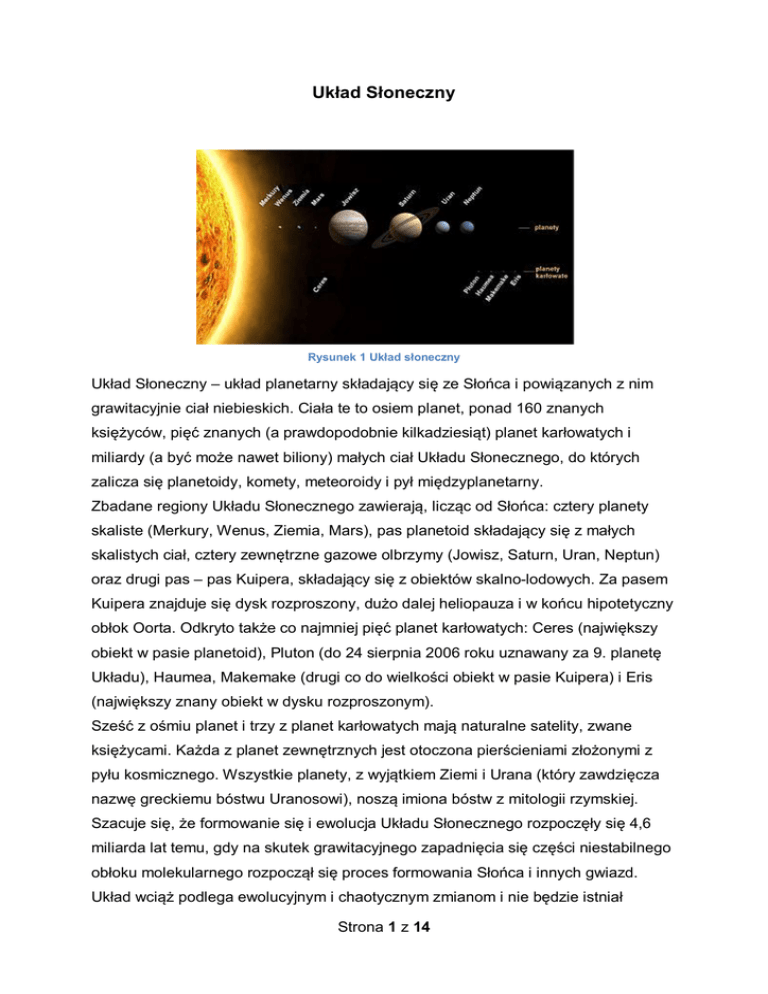 Układ Słoneczny Rysunek 1 Układ słoneczny Układ Słoneczny – układ planetarny składający się ze Słońca i powiązanych z nim grawitacyjnie ciał niebieskich. Ciała te to osiem planet, ponad 160 znanych księżyców, pięć znanych (a prawdopodobnie kilkadziesiąt) planet karłowatych i miliardy (a być może nawet biliony) małych ciał Układu Słonecznego, do których zalicza się planetoidy, komety, meteoroidy i pył międzyplanetarny. Zbadane regiony Układu Słonecznego zawierają, licząc od Słońca: cztery planety skaliste (Merkury, Wenus, Ziemia, Mars), pas planetoid składający się z małych skalistych ciał, cztery zewnętrzne gazowe olbrzymy (Jowisz, Saturn, Uran, Neptun) oraz drugi pas – pas Kuipera, składający się z obiektów skalno-lodowych. Za pasem Kuipera znajduje się dysk rozproszony, dużo dalej heliopauza i w końcu hipotetyczny obłok Oorta. Odkryto także co najmniej pięć planet karłowatych: Ceres (największy obiekt w pasie planetoid), Pluton (do 24 sierpnia 2006 roku uznawany za 9. planetę Układu), Haumea, Makemake (drugi co do wielkości obiekt w pasie Kuipera) i Eris (największy znany obiekt w dysku rozproszonym). Sześć z ośmiu planet i trzy z planet karłowatych mają naturalne satelity, zwane księżycami. Każda z planet zewnętrznych jest otoczona pierścieniami złożonymi z pyłu kosmicznego. Wszystkie planety, z wyjątkiem Ziemi i Urana (który zawdzięcza nazwę greckiemu bóstwu Uranosowi), noszą imiona bóstw z mitologii rzymskiej. Szacuje się, że formowanie się i ewolucja Układu Słonecznego rozpoczęły się 4,6 miliarda lat temu, gdy na skutek grawitacyjnego zapadnięcia się części niestabilnego obłoku molekularnego rozpoczął się proces formowania Słońca i innych gwiazd. Układ wciąż podlega ewolucyjnym i chaotycznym zmianom i nie będzie istniał Strona 1 z 14 wiecznie w obecnej postaci. Za około 2 - 5 miliardów lat możliwe jest zderzenie Galaktyki Andromedy z Drogą Mleczną, a w ciągu około 5 miliardów lat Słońce powiększy wielokrotnie swoją średnicę, stając się czerwonym olbrzymem, co doprowadzi do zniszczenia planet skalistych, wliczając w to Ziemię. Następnie Słońce odrzuci swoje zewnętrzne warstwy jako mgławicę planetarną i przekształci się w białego karła, którego temperatura i jasność będą stopniowo spadać aż do całkowitej "śmierci" gwiazdy. Przypuszcza się, że Słońce następnie zmieni się w czarnego karła, jednak nie można tej teorii potwierdzić ani obalić, gdyż wszechświat jest zbyt młody, aby powstały tego typu obiekty. Strona 2 z 14 1. Terminologia 1 Terminologia Obiekty orbitujące wokół Słońca są podzielone na trzy grupy: planety, planety karłowate i małe ciała Układu Słonecznego. Astronomowie zwykle mierzą odległości w Układzie Słonecznym w jednostkach astronomicznych (skrót: j.a. lub AU). Jedna jednostka astronomiczna to średnia odległość pomiędzy Ziemią a Słońcem czyli około 149 598 000 km. Przykładowo Pluton jest odległy średnio o około 39,4 j.a. od Słońca, podczas gdy Jowisz krąży po orbicie w średniej odległości około 5,2 j.a. od Słońca. Jeden rok świetlny, jednostka używana do wyrażania odległości międzygwiazdowych, to około 63 240 j.a. Nieformalnie Układ Słoneczny jest czasami dzielony na oddzielne strefy. Wewnętrzny Układ Słoneczny zawiera cztery planety skaliste i główny pas planetoid. Czasami definiuje się zewnętrzny Układ Słoneczny jako obejmujący wszystko poza pasem planetoid. Od czasu odkrycia pasa Kuipera, niektórzy używają tego określenia dla obszaru poza orbitą Neptuna, a wtedy gazowe olbrzymy stanowią "strefę środkową". 1.1 Planeta Jest to ciało niebieskie, które znajduje się na orbicie wokół Słońca, ma wystarczającą masę, aby własną grawitacją pokonać siły spoistości ciała stałego tak, aby wytworzyć kształt odpowiadający równowadze hydrostatycznej (prawie okrągły) i wyczyścić przestrzeń w pobliżu swojej orbity. 1.1 Planeta karłowata Jest to ciało niebieskie, które znajduje się na orbicie wokół Słońca, ma wystarczającą masę, aby własną grawitacją pokonać siły ciała stałego tak, aby wytworzyć kształt odpowiadający równowadze hydrostatycznej (prawie okrągły), nie wyczyściło jednak przestrzeni w pobliżu swojej orbity, oraz nie jest satelitą. Wszystkie pozostałe obiekty okrążające Słońce, oprócz satelitów, powinny być określane wspólnie jako "małe ciała Układu Słonecznego". Strona 3 z 14 2. Powstanie i ewolucja. 2 Powstanie i ewolucja Układ Słoneczny powstał około 4,6 miliarda lat temu z zagęszczenia obłoku molekularnego. Owa stosunkowo rzadka chmura gazu (przede wszystkim wodoru i helu) i pyłu kosmicznego o średnicy kilku lat świetlnych zapadła się grawitacyjnie – prawdopodobnie pod wpływem jakiegoś zaburzenia zewnętrznego, związanego na przykład z niedalekim wybuchem supernowej. Kurczeniu się obłoku odpowiadało zwiększanie się gęstości, szczególnie w centrum, oraz formowanie się wirującego coraz szybciej dysku protoplanetarnego o średnicy około 200 j.a. Centralny obiekt dysku – protogwiazda – w końcu przekształcił się w Słońce, a w otaczającym je dysku powstały poszczególne ciała niebieskie: przede wszystkim w planety, ale także i pozostałe składniki Układu Słonecznego. Pierwotny Układ Słoneczny różnił się od obecnego, planety krążyły po innych orbitach i było w nim znacznie więcej małych ciał, pyłu międzyplanetarnego oraz resztki gazu. Promieniowanie świetlne i wiatr słoneczny wyczyściły Układ z gazu i pyłu. Wiele małych ciał Układu zderzyło się z dużymi ciałami lub zostało z niego wyrzuconych. Zderzenia, jak i wzajemne oddziaływania ciał, zmieniały parametry orbit. Proces ten, choć znacznie ograniczony, trwa w dalszym ciągu. Oddziaływania wprowadzają perturbacje do orbit planet jak i mniejszych ciał Uk