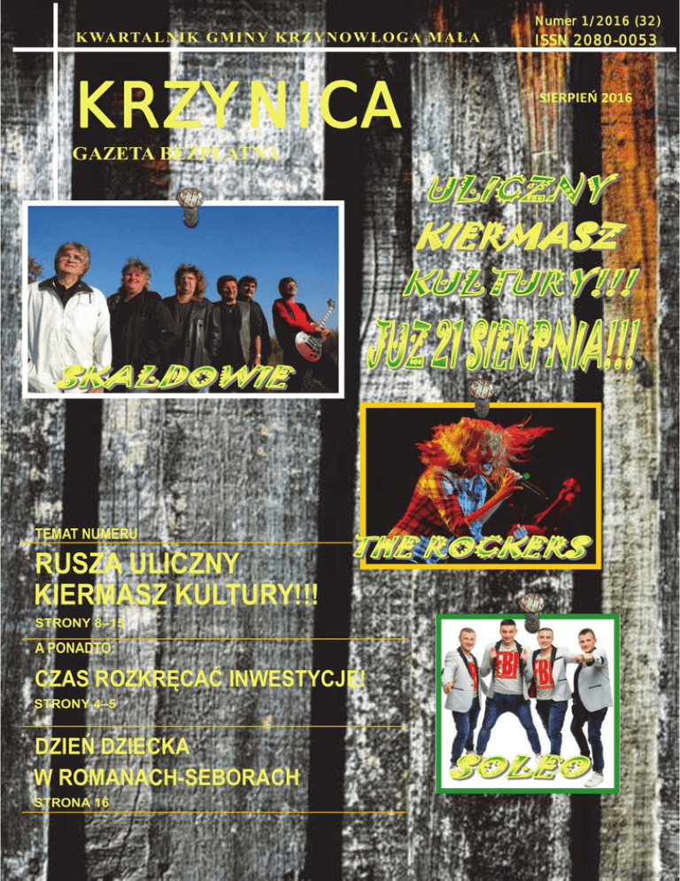 Numer 1/2016 (32) K WA RTAL NI K G MI N Y K R ZY N O W Ł O G A M AŁ A ISSN 2080-0053 KRZYNICA SIERPIEŃ 2016 GAZETA BEZPŁATNA TEMAT NUMERU RUSZA ULICZNY KIERMASZ KULTURY!!! STRONY 8–15 A PONADTO: CZAS ROZKRĘCAĆ INWESTYCJE! STRONY 4–5 DZIEŃ DZIECKA W ROMANACH-SEBORACH STRONA 16 Ważne adresy i telefony SPIS TREŚCI: 3 SŁOWO WÓJTA! Gminny Ośrodek Pomocy Społecznej 4–9 AKTUALNOŚCI 4 KWIECISTY PATRIOTYZM 4 PROGRAM 500+ W GMINIE 5 INWESTYCJE W RUCH! 6 EKOLOGICZNA ZMIANA 6 DROGA WODA 7 ZAWODY SPORTOWO-POŻARNICZE 8-15 TEMAT NUMERU: ULICZNY KIERMASZ KULTURY 8 DLACZEGO „ULICZNY KIERMASZ KULTURY” 9 CO NAS CZEKA 21 SIERPNIA? 10 RAZ NA PREWENCYJNIE, RAZ NA SPORTOWO… 11 ...A RAZ NA LUDOWO 12 „KARAWANA” W KRZYNOWŁODZE 13 BEZ MUZYKI ANI RUSZ! 14 MOTORYZACYJNE PASJE 15 POZA SCENĄ GŁÓWNĄ — CZYLI CO JESZCZE NA KIERMASZU 16 DZIEŃ DZIECKA W ROMANACH-SEBORACH 17 „POLSKIE SAFARI” W KRZYNOWŁODZE? 17 HISTORIA „POLSKIEGO SAFARI” 18 ROZMAITOŚCI SPORTOWE 19 ROZMAITOŚCI KULTURALNE I EDUKACYJNE 20 PROGRAM FESTIWALU SZTUKI I ANIMACJI „KARAWANA” 06-316 Krzynowłoga Mała ul. Kościelna 3 kierownik: Marzena Cichowska tel. (29) 751 28 82, (29) 751 27 06 e-mail: [email protected] Gminna Biblioteka Publiczna 06-316 Krzynowłoga Mała ul. Kościelna 7 dyrektor: Ewa Zdziarska tel. (29) 752 33 61 e-mail: [email protected] Zespół Szkół w Krzynowłodze Małej 06-316 Krzynowłoga Mała ul. Szkolna 4 dyrektor: Małgorzata Budna z-ca: Włodzimierz Rudziński tel. (29) 751 27 22 e-mail: [email protected] Szkoła Podstawowa w Romanach-Seborach Romany-Sebory 06-300 Przasnysz dyrektor: Agata Chmielewska tel. (29) 751 34 10 e-mail: [email protected] Szkoła Podstawowa w Ulatowie-Adamach Ulatowo-Adamy 06-316 Krzynowłoga Mała dyrektor: Danuta Łubińska tel. (29) 597 31 41 e-mail: [email protected] Punkt Przedszkolny w Krzynowłodze Małej ul. Szkolna 4 06-316 Krzynowłoga Mała tel./faks (29) 751 26 07 email: [email protected] [email protected] „KRZYNICA” kwartalnik Gminy Krzynowłoga Mała Nr 1/2016 (32) ISSN 2080-0053, nakład 750 egz. WYDAWCA: Urząd Gminy Krzynowłoga Mała, ul. Kościelna 3, 06-316 Krzynowłoga Mała, tel. (29) 751-27-20, faks (29) 751-2725, www.krzynowlogamala.pl, e-mail: [email protected] REDAKCJA i SKŁAD: CORRECT MEDIA Michał Wiśnicki, [email protected] DRUK: Drukarnia J.J. Maciejewscy, Przasnysz W NUMERZE WYKORZYSTANO MATERIAŁY POCHODZĄCE ZE SZKOŁY PODSTAWOWEJ W ROMANACH-SEBORACH, SZKOŁY PODSTAWOWEJ W ULATOWIE-ADAMACH ORAZ ZESPOŁU SZKÓŁ W KRZYNOWŁODZE MAŁEJ. 2 WSTĘPNIAK SŁOWO WÓJTA! Tym razem pierwszy numer Krzynicy w 2016 roku będzie w zupełnie innym tonie niż numer poprzedni, wydany na jesieni 2015 roku. Koniec z narzekaniem! Czas na poprawę humoru! Jesień ubiegłego roku była wyjątkowo trudna dla naszego samorządu. Długi, w które popadła nasza gmina w poprzedniej kadencji, sprowadziła nas na skraj przepaści. Ale dobre zarządzanie finansami gminnymi, które wdrożyliśmy wraz z Radą Gminy, już przynosi skutki. Przestaliśmy się zadłużać i możemy powoli myśleć o nowych inwestycjach. To jednak dopiero jesienią 2016 i w roku 2017. Tymczasem jednak mamy wakacje — czas odpoczynku dla naszych pociech i trochę dla dorosłych. Dola rolnika (a rolnicy to przecież większość naszej społeczności) jest taka, że nie może on pozwolić sobie na długi odpoczynek. Ale odrobina relaksu należy się wszystkim. Dlatego zapraszamy wszystkich mieszkańców gminy, a także powiatu przasnyskiego i ościennych samorządów — na wielki ULICZNY KIERMASZ KULTURY! Będzie to zupełna nowość w Krzynowłodze Małej. Może jeszcze nie tak okazała, jak Smaki Tradycji, ale za to zupełnie nowatorska. Akcentująca naszą wiejską kulturę, a zarazem pozwalająca zapoznać się z ciekawymi trendami w kulturze. Razem z Mazowieckim Instytutem Kultury proponujemy wszystkim plenerową zabawę z kulturą w tle. Już za kilka tygodni, 21 sierpnia, centrum Krzynowłogi Małej zamieni się na jeden dzień w prawdziwy staropolski jarmark rozmaitości. Dzięki współpracy z MIK możemy zaprosić wszystkich na festiwal sztuki i animacji KARAWANA, podczas którego i mali, i duzi będą się mogli świetnie bawić przez całe popołudnie. Po godzinie 21.00 natomiast rozpocznie się blok zabaw muzycznych, którego kulminacją będzie występ legendy polskich scen — zespołu SKALDOWIE z braćmi Zielińskimi. Nie jest to jednak koniec atrakcji. Przez cały dzień na terenie Krzynowłogi Małej będą odbywać się pokazy motoryzacyjne, wyrośnie tu małe miasteczko ruchu drogowego, będą stoiska z regionalnymi potrawami, a także rękodziełem artystycznym. Z Olsztyna przyjadą do nas członkowie automobilklubu; z Otrębusów odwiedzą nas z kolei miłośnicy starych aut, którzy pokażą u nas mnóstwo dawnych modeli. Imprezą towarzyszącą mają być także otwarty turniej wędkarski „Łoje Cup”, który zorganizujemy z przasnyskim kołem Polskiego Związku Wędkarskiego. Nie zabraknie atrakcji dla najmłodszych — z dmuchańcami watą cukrową na czele. Słowem: czeka nas zabawa do białego rana. CO NAS CZEKA? 1 WRZEŚNIA POCZĄTEK ROKU SZKOLNEGO Jak co roku szkolne dzwonki zadzwonią w nowym roku z samego rana 1 września. Początek uroczystości szkolnych związanych z rozpoczęciem nauki po wakacjach odbędzie się w poszczególnych szkołach w godzinach przedpołudniowych. Najpierw społeczność szkolna będzie jednak miała okazję spotkać się w kościele parafialnym w Krzynowłodze Małej, w którym odprawiona zostanie msza święta w intencji wszystkich uczniów z terenu naszej gminy. 4 WRZEŚNIA DOŻYNKI POWIATOWO-GMINNE W LESZNIE Jerzy Humięcki, Wójt Gminy Krzynowłoga Mała Wspólnie, „jak drzewiej bywało” — tak zapewne powiedzieliby nasi przodkowie. Takiej prawdziwej integracji społecznej w dzisiejszym zaganianym świecie nie mamy zbyt wiele, dlatego uznaliśmy wspólnie z radnymi, że tego typu wydarzenie kul
