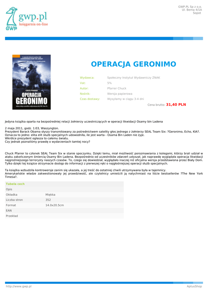 GWP.PL Sp z o.o. Ul. Bema 4/1A Sopot OPERACJA GERONIMO Wydawca: Społeczny Instytut Wydawniczy ZNAK Vat: 5% Autor: Pfarrer Chuck Nośnik: Wersja papierowa Czas dostawy: Wysyłamy w ciągu 3-4 dni Cena brutto: 31,40 PLN Jedyna książka oparta na bezpośredniej relacji żołnierzy uczestniczących w operacji likwidacji Osamy bin Ladena 2 maja 2011, godz. 1:03, Waszyngton. Prezydent Barack Obama słyszy transmitowany za pośrednictwem satelity głos jednego z żołnierzy SEAL Team Six: ?Geronimo, Echo, KIA?. Oznacza to jedno: elita elit służb specjalnych udowodniła, ile jest warta - Osama Bin Laden nie żyje. Wkrótce prezydent ogłasza to całemu światu. Czy jednak poznaliśmy prawdę o wydarzeniach tamtej nocy? Chuck Pfarrer to członek SEAL Team Six w stanie spoczynku. Dzięki temu, miał możliwość porozmawiania z kolegami, którzy brali udział w ataku zakończonym śmiercią Osamy Bin Ladena. Bezpośrednio od uczestników zdarzeń usłyszał, jak naprawdę wyglądała operacja likwidacji najgroźniejszego terrorysty naszych czasów. To, czego się dowiedział, wyglądało inaczej niż oficjalna wersja przedstawiona przez Biały Dom. Tylko dzięki tej książce otrzymacie dostęp do informacji z pierwszej ręki o najgłośniejszej operacji służb specjalnych. Ta książka wzbudziła kontrowersje zanim się ukazała, a jej treść do ostatniej chwili utrzymywana była w tajemnicy. Amerykańskie władze zakwestionowały jej prawdziwość, ale czytelnicy umieścili ją natychmiast na liście bestsellerów ?The New York Timesa?. Tabela cech Opis Okładka Miękka Liczba stron 352 Format 14.0x20.5cm EAN Przekład http://www.gwp.pl AptusShop